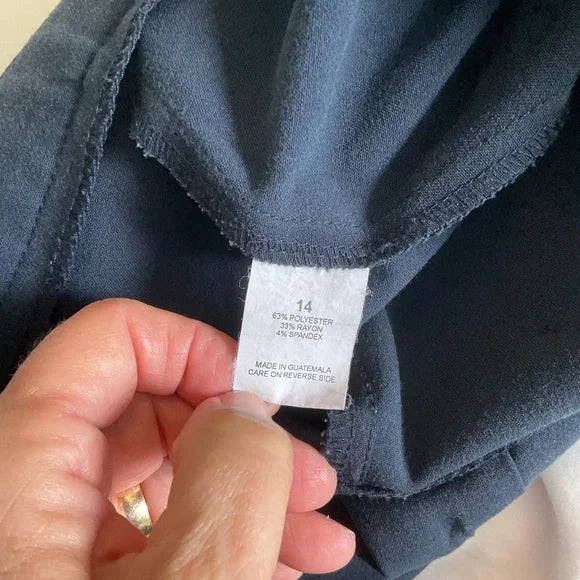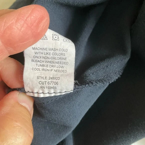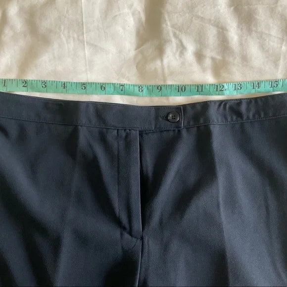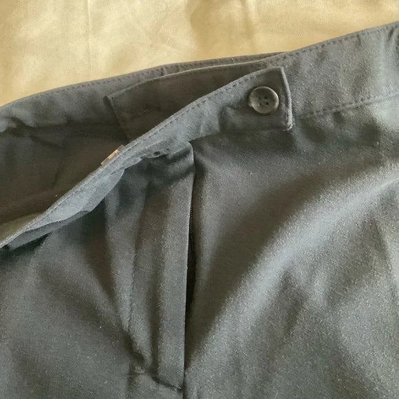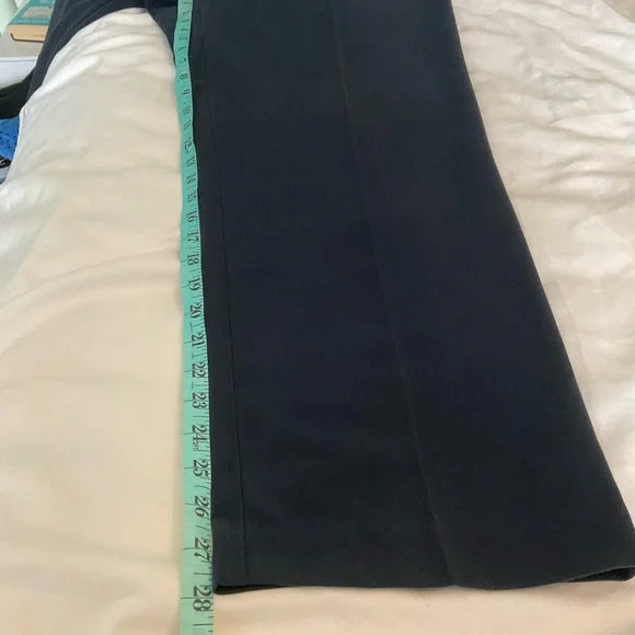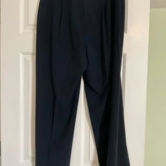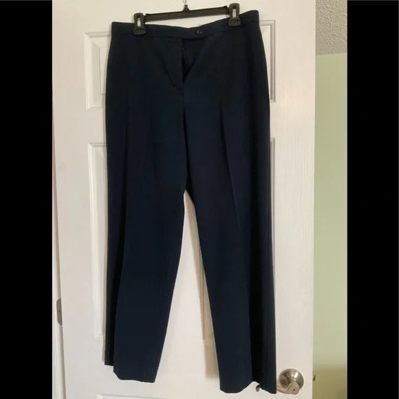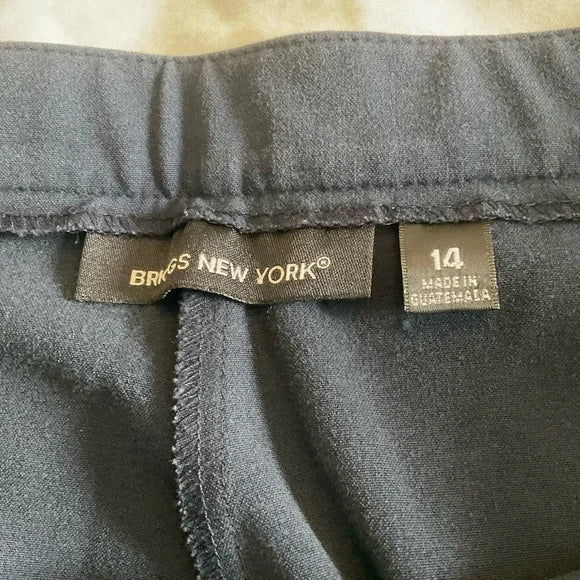 Briggs New York long flat front dress pant. There is a button and zipper closure on the front. There are no pockets so has a clean look! They are a navy blue in color.