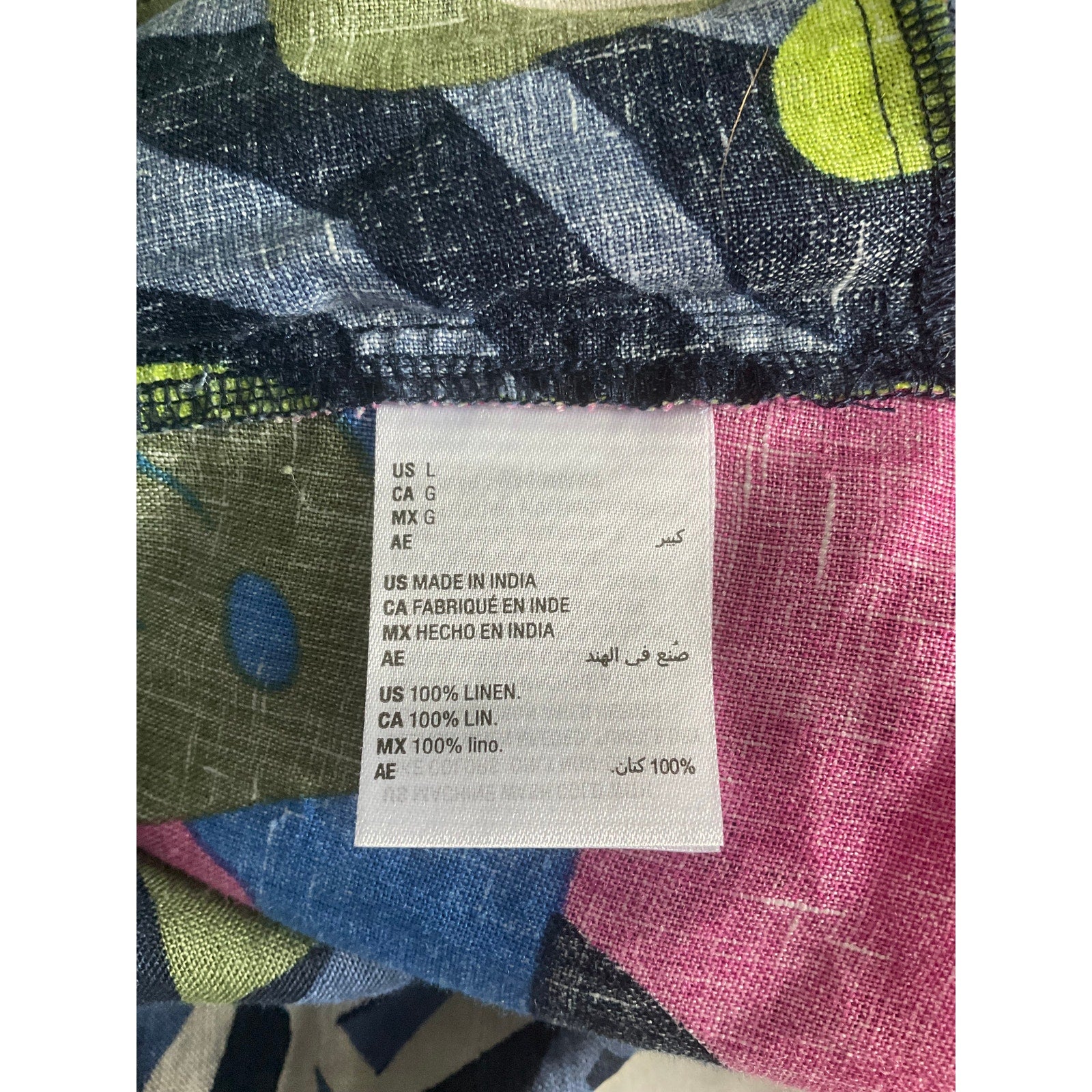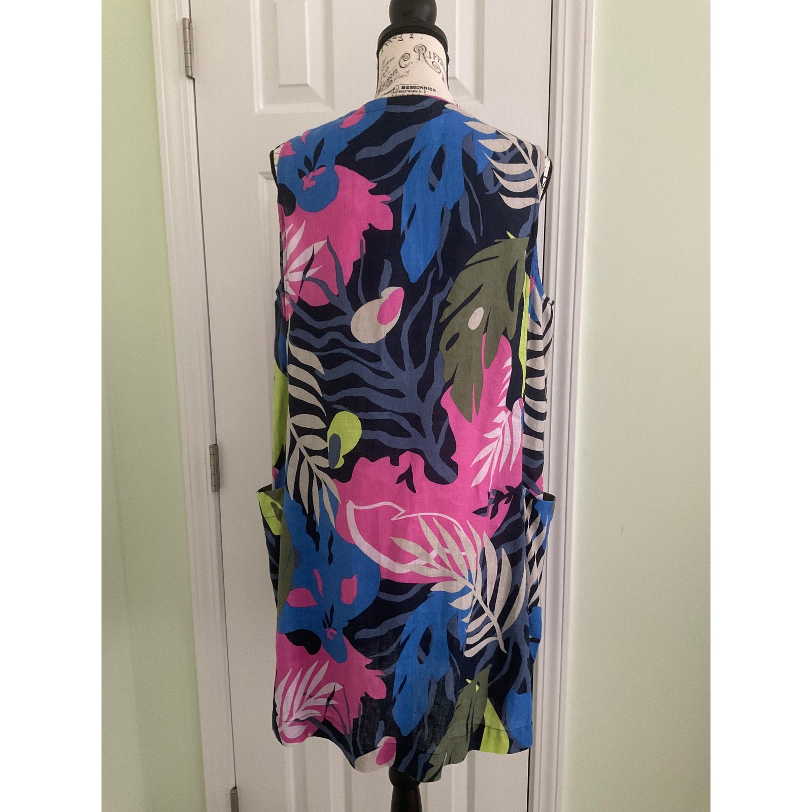 Charter Club Linen Vibrant sleeveless dress with bold floral print. Features a mix of blue, pink, green, and black. Perfect for casual outings. This has side pockets and a slight v-neck.