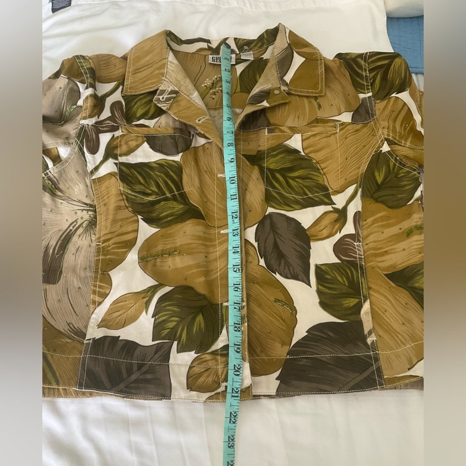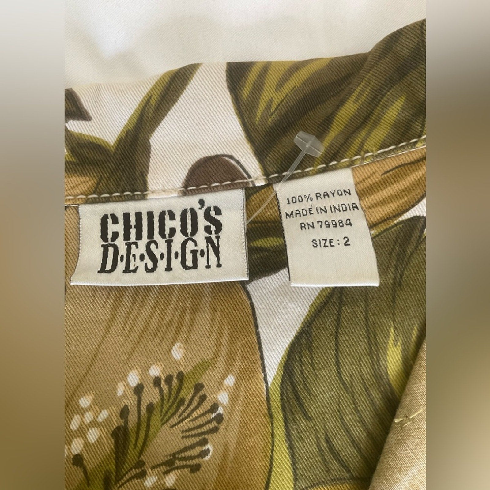 Chico's jean jacket with bold brown and green floral design. Button-up front. Casual and chic style. Has side seam and breast pockets there are areas of beaded embellishment.