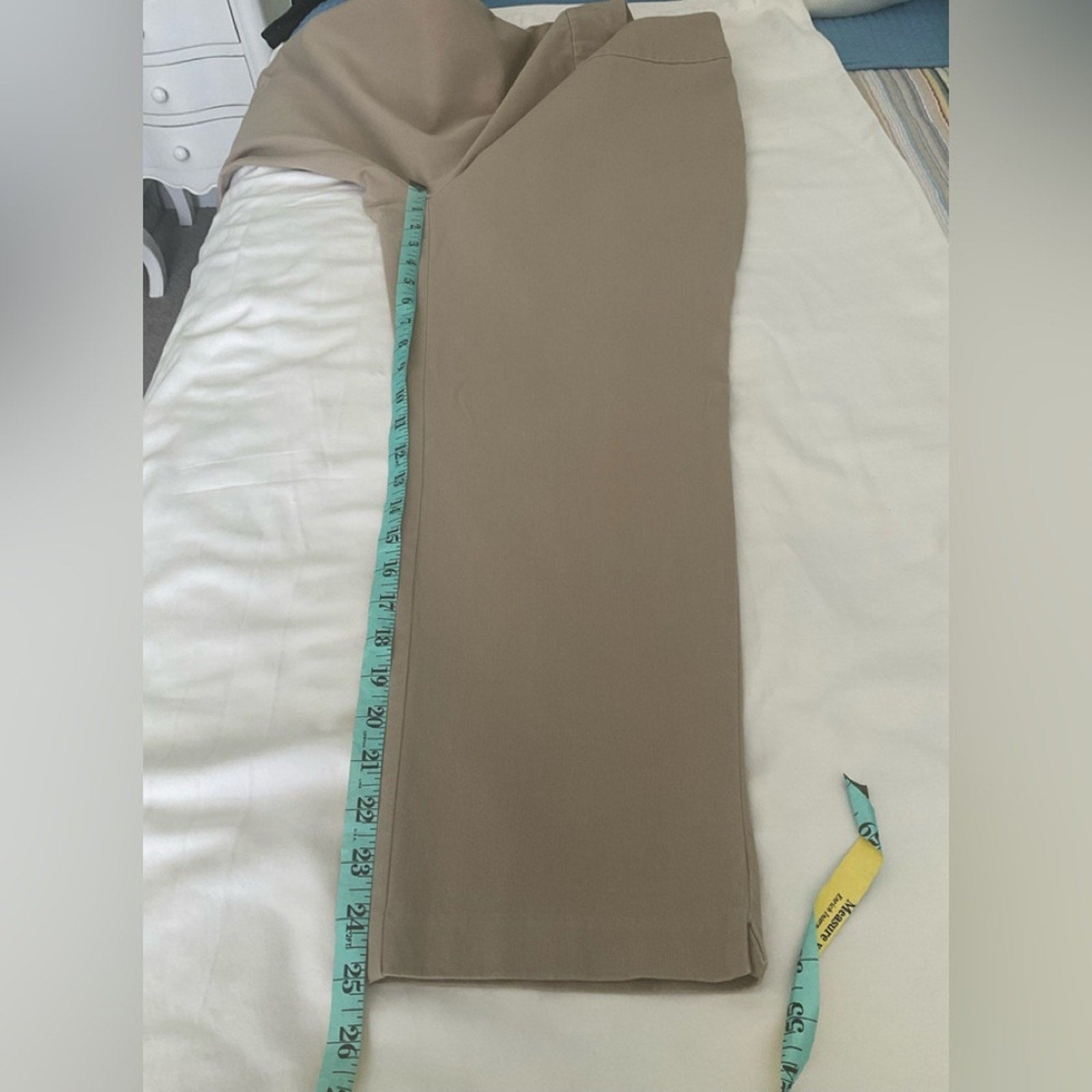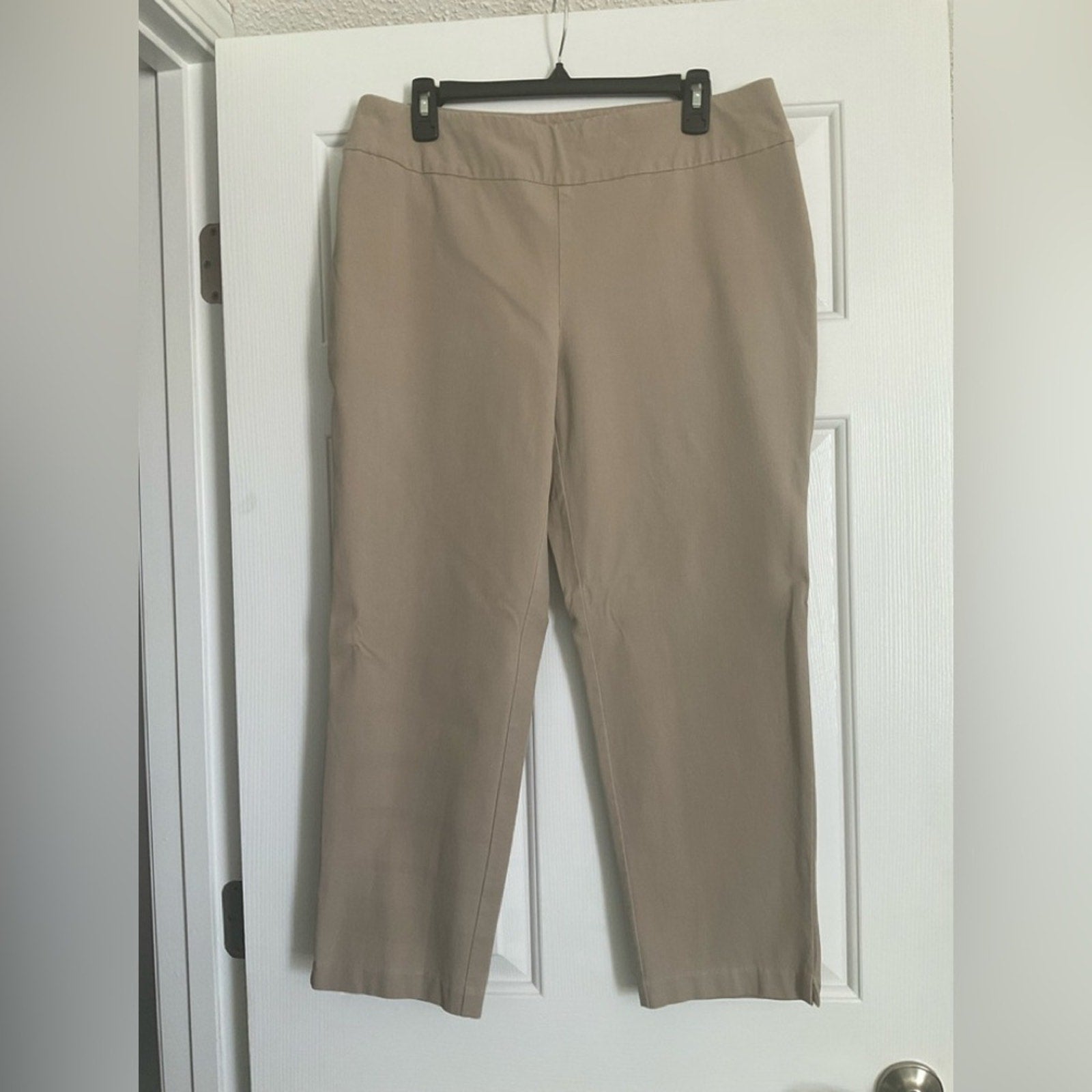 Chico's fabulously slimming ankle-length pants in a versatile tan shade. Perfect for casual or professional wear. No pockets and has a lot of stretch to them.