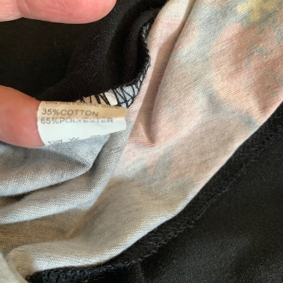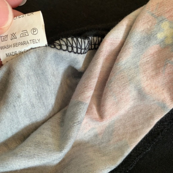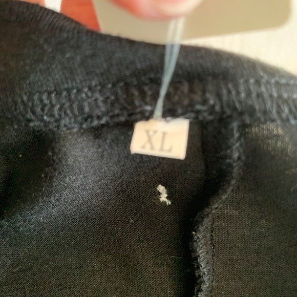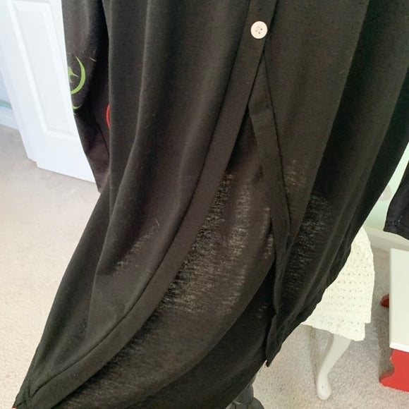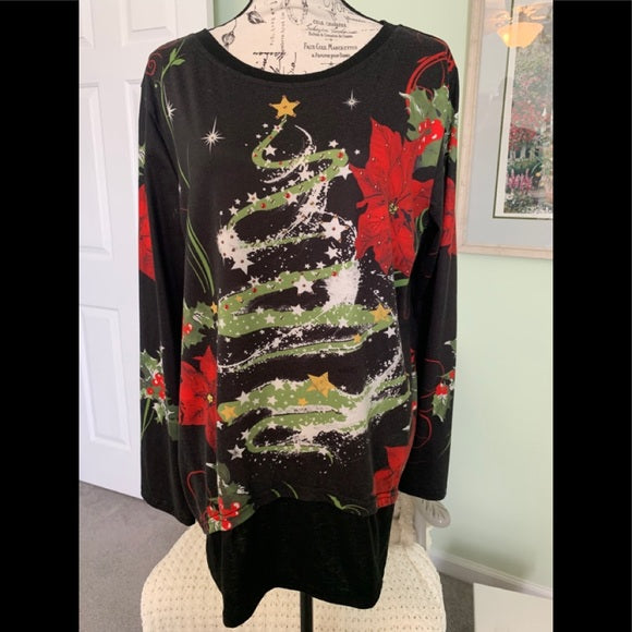 What a cute long sleeve Christmas tunic top with a layered look and back is solid black with button look down the back and pleated at the bottom.