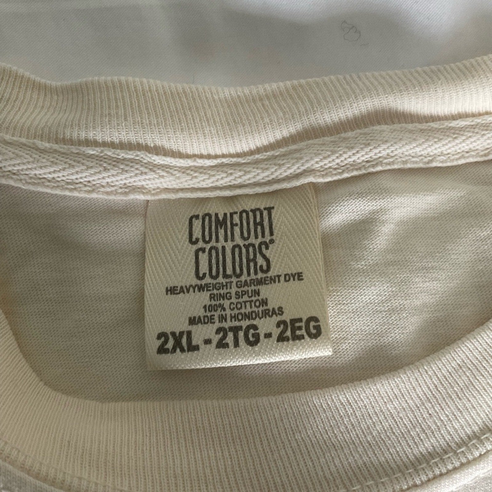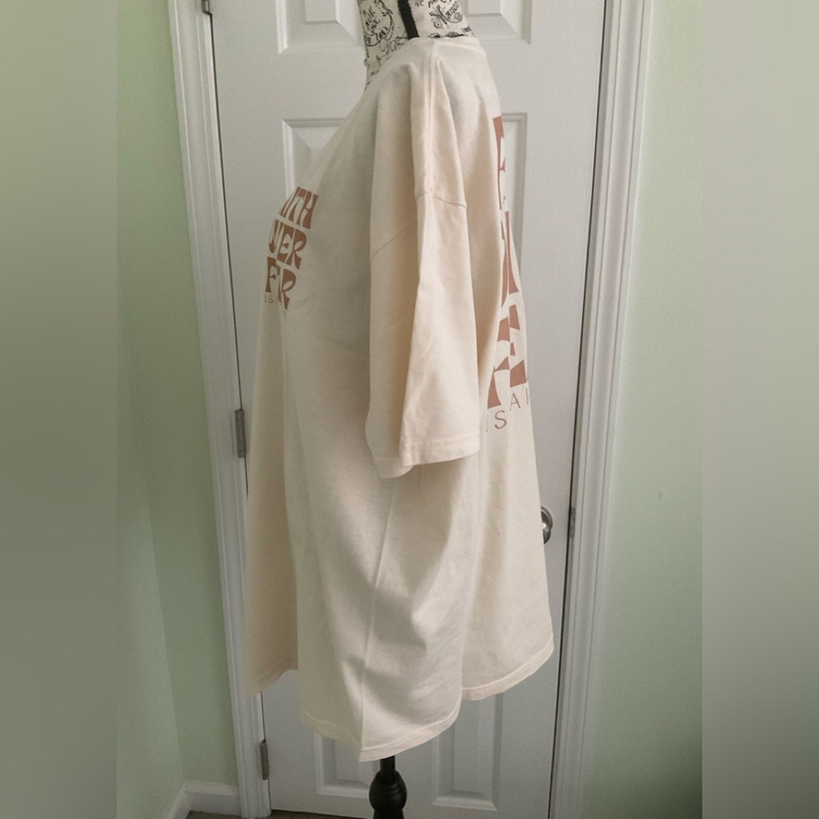 Stylish cream tee with bold faith graphic. Soft and comfortable. Ideal for everyday wear. This is a heavyweight T-shirt with a unisex fit. Saying on left breast and back is Faith Over Fear.