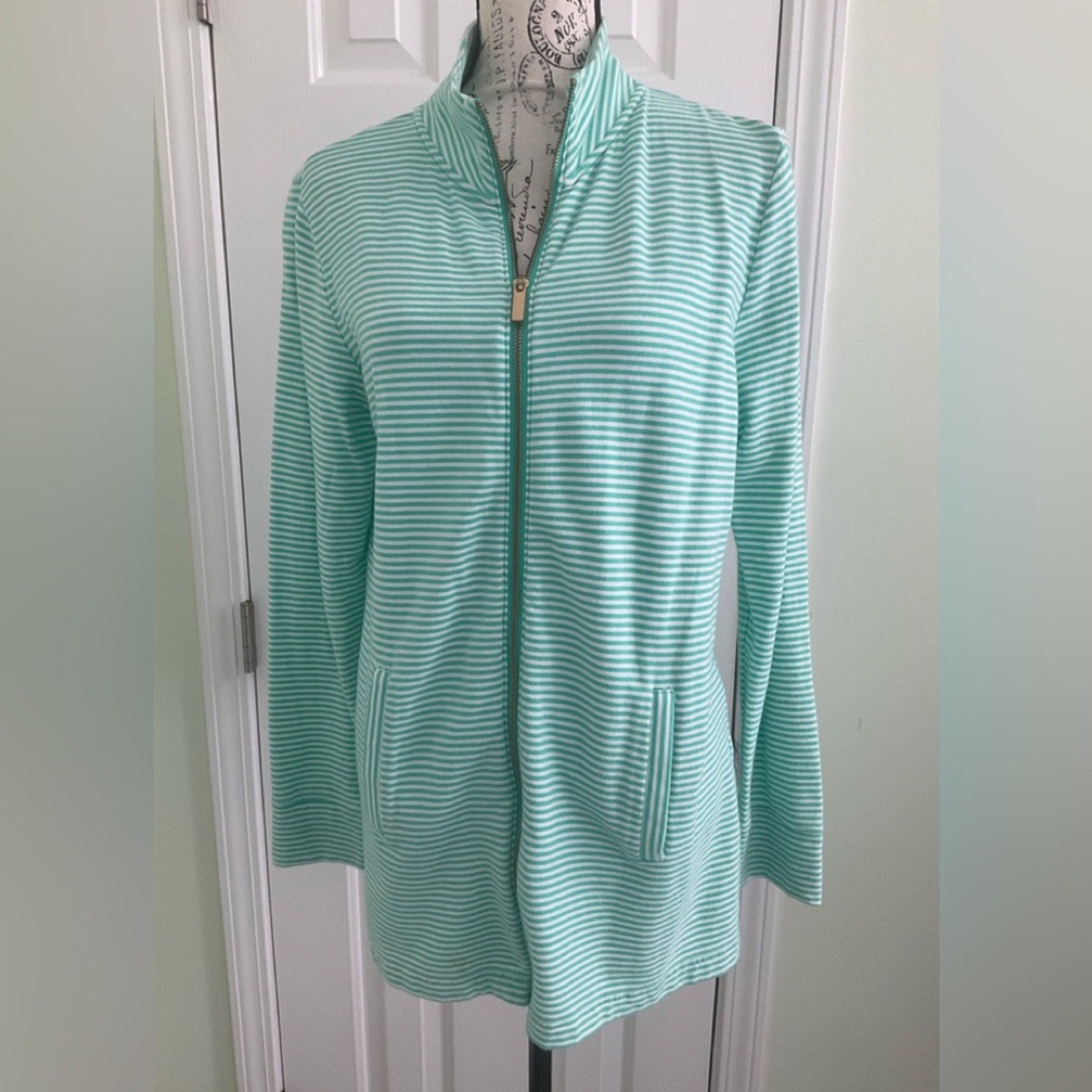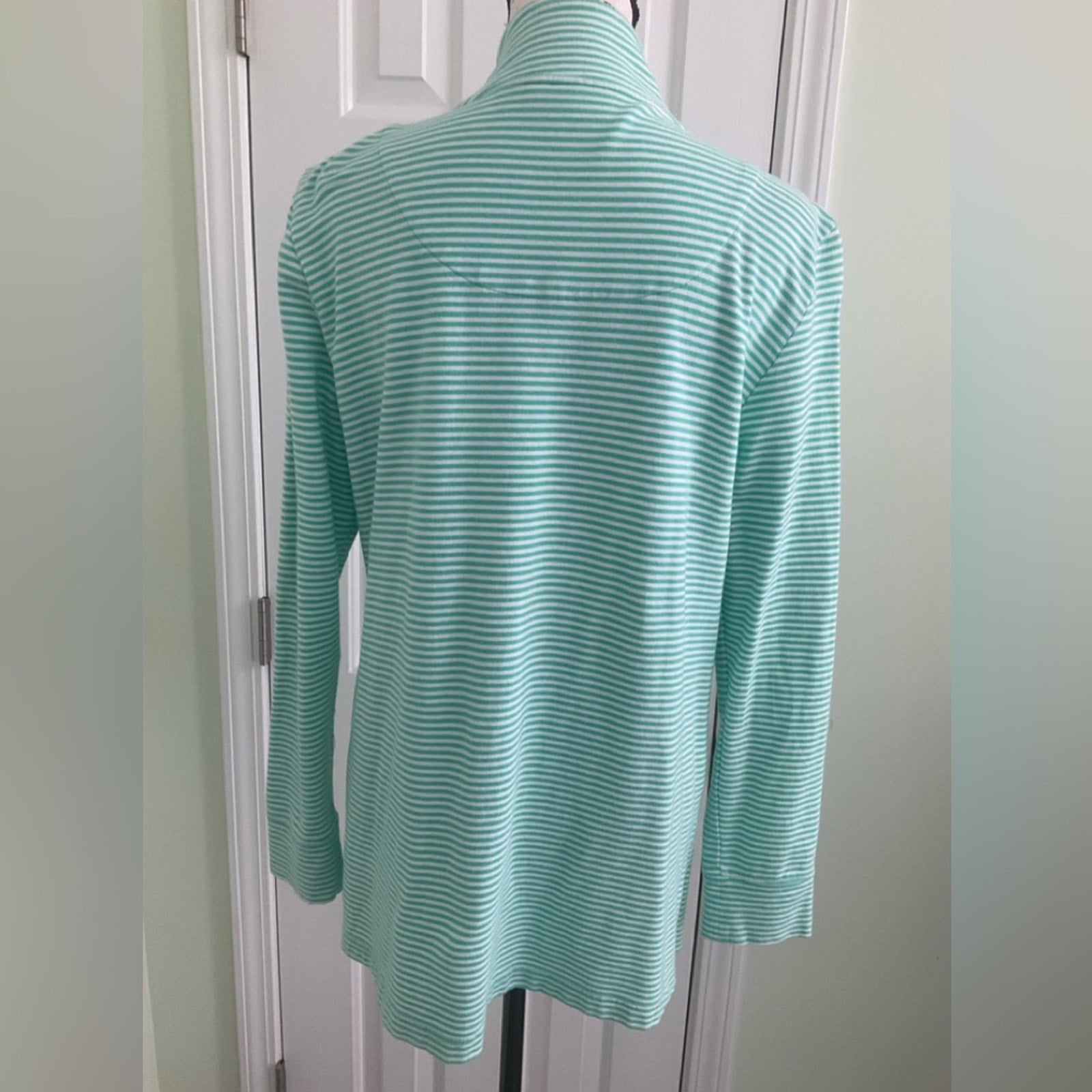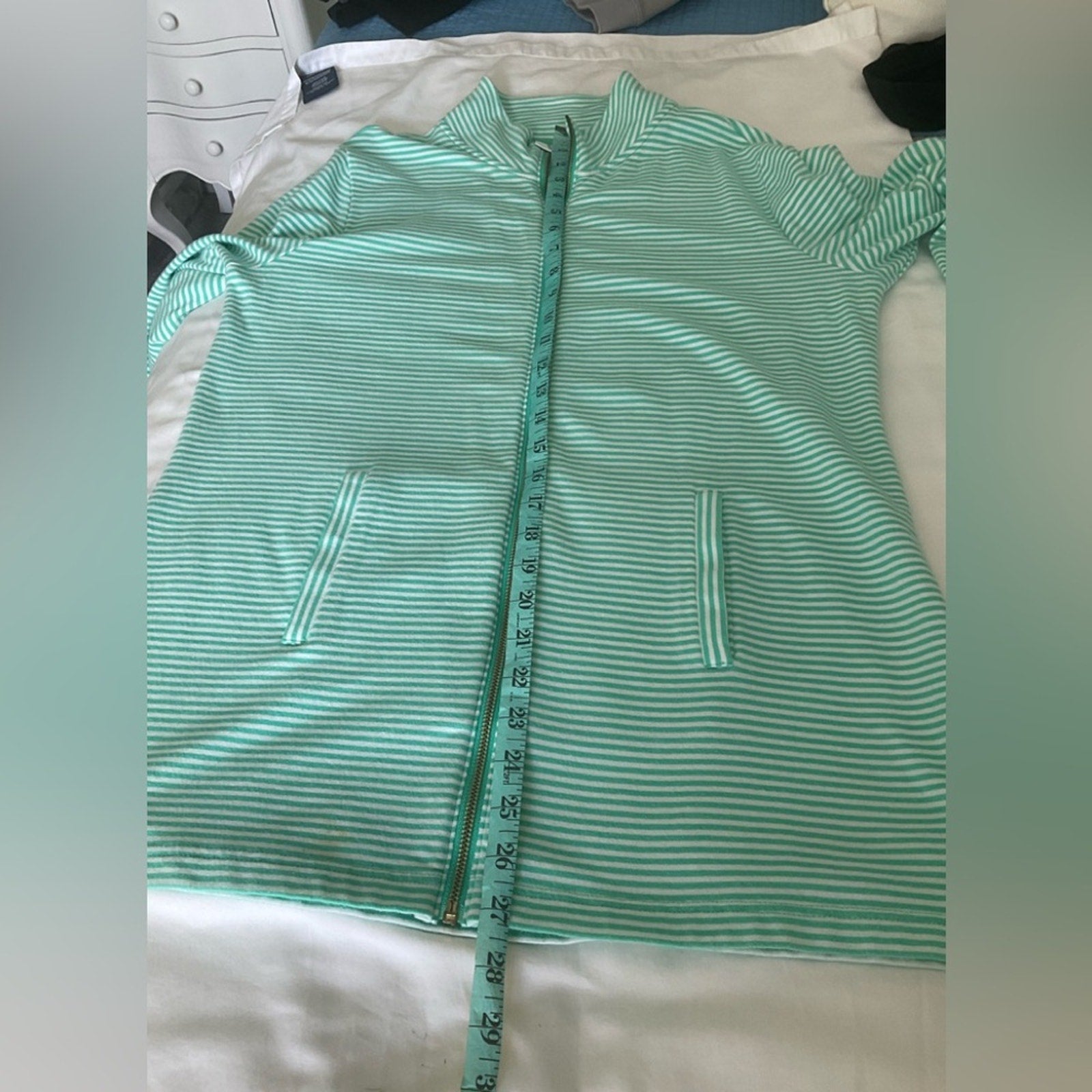 Crown & Ivy beach line offers this beautiful mint and white striped jacket. Features a full zip front and front pockets. Ideal for casual outings and those cool spring evenings.