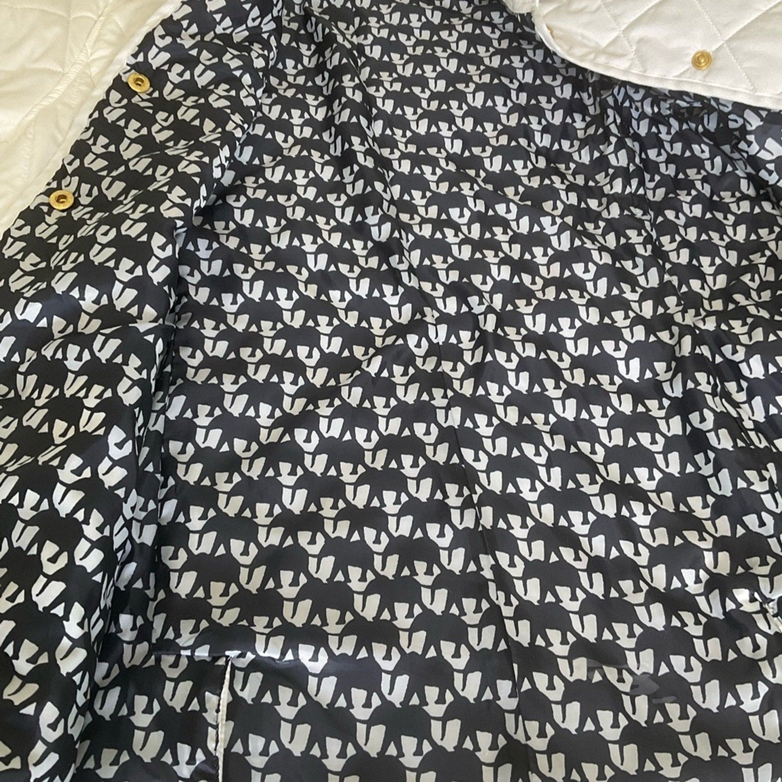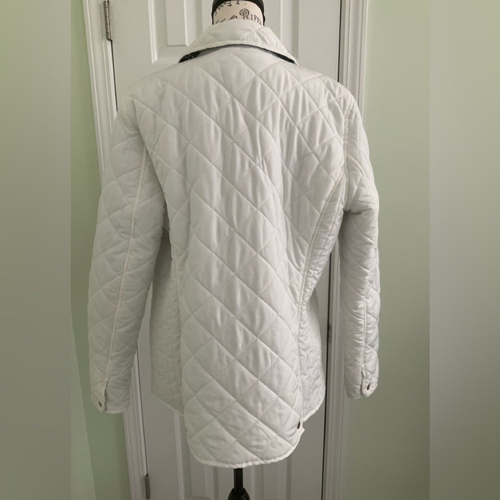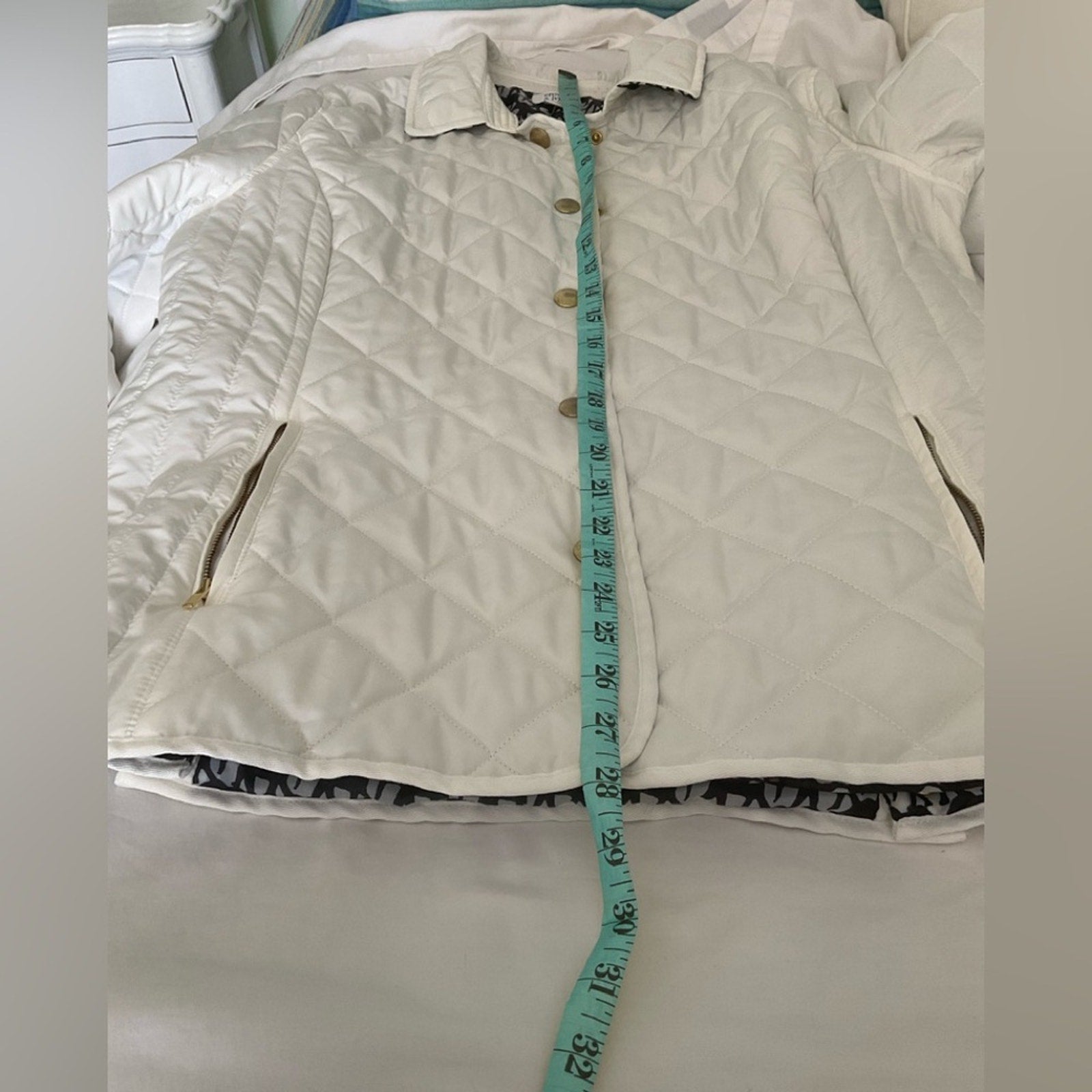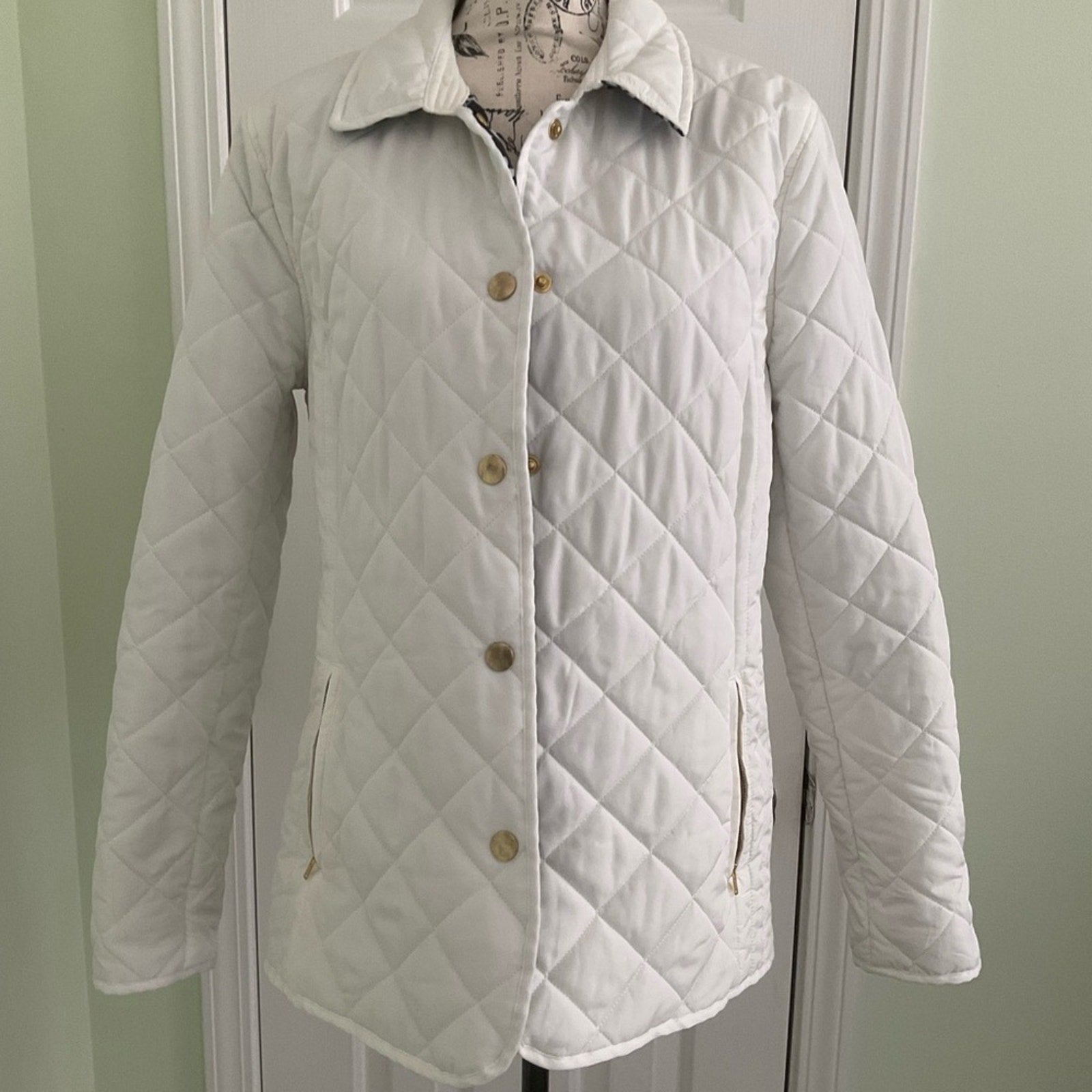 Crown & Ivy Chic white quilted design jacket that has zipper pockets and a beautiful blue and white lining. Button closure. Ideal for cool weather.