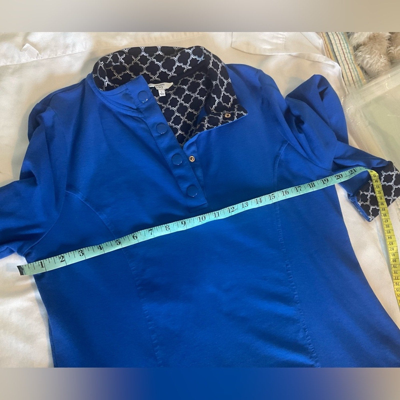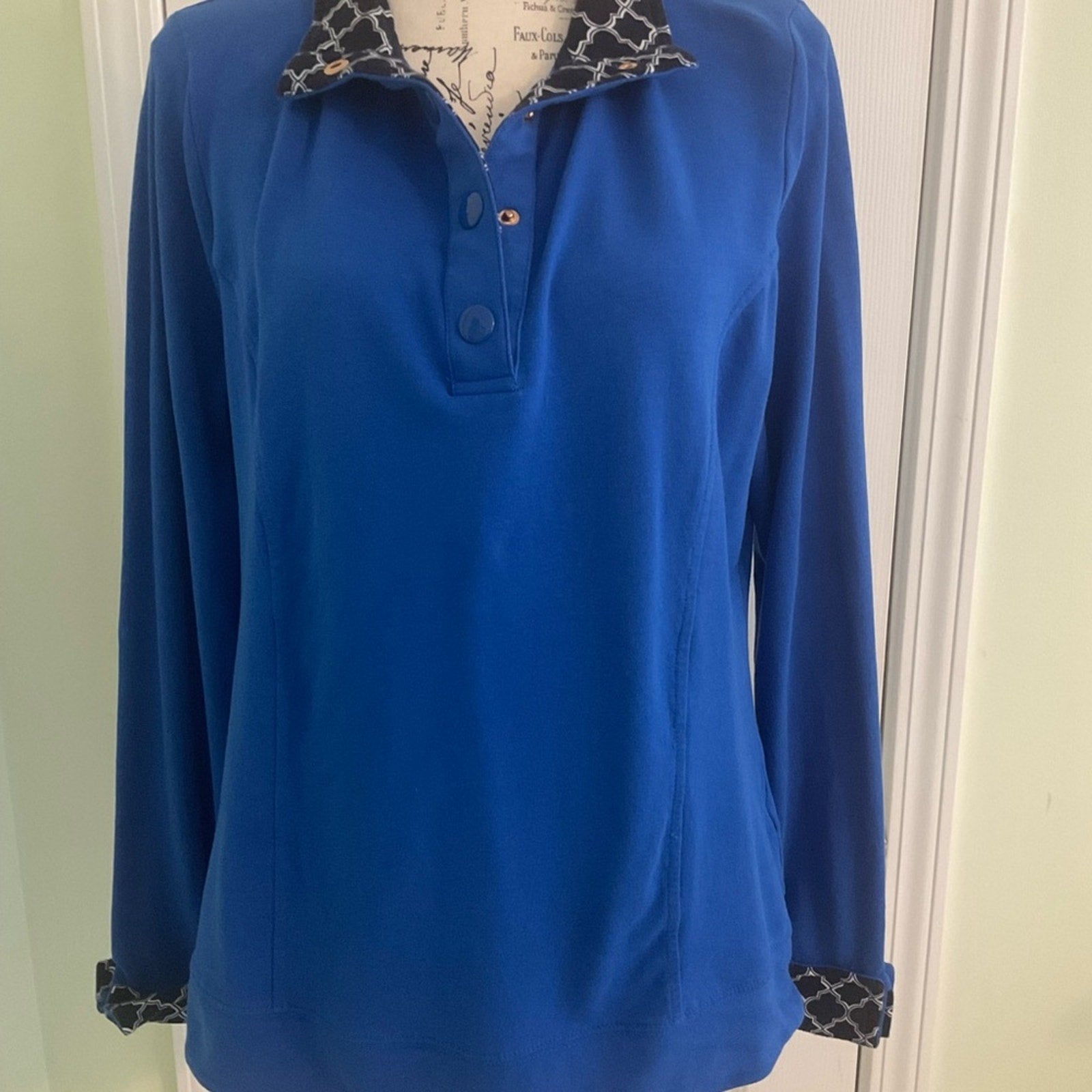 This had 4 snaps at the top, one is actually on the collar. This is royal blue with a dark blue and white collar and neck inset and also around the cuffed sleeves.