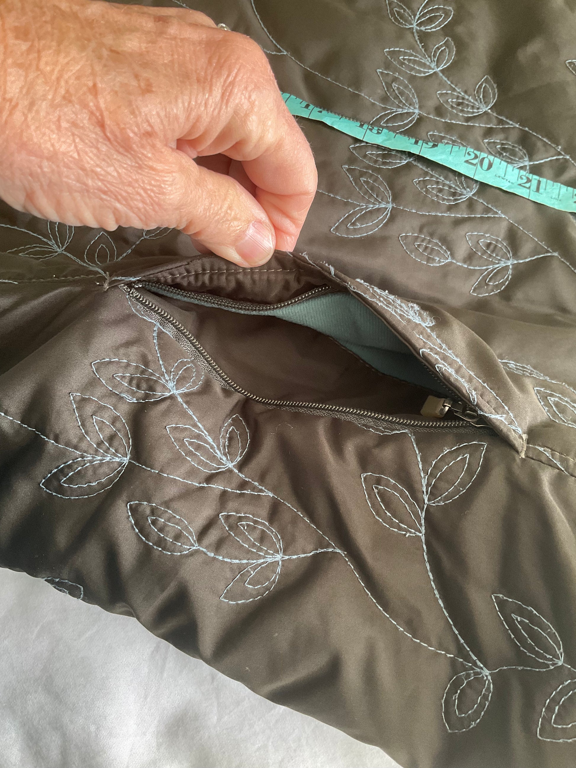 Eddie Bauer super cute and comfy jacket. The jacket is a brown with the blue/green design on it and the inside is also blue green and very warm. Has 2 pockets on the seams that zip and also a small inside pocket with a snap. Also elastic around the wrists.