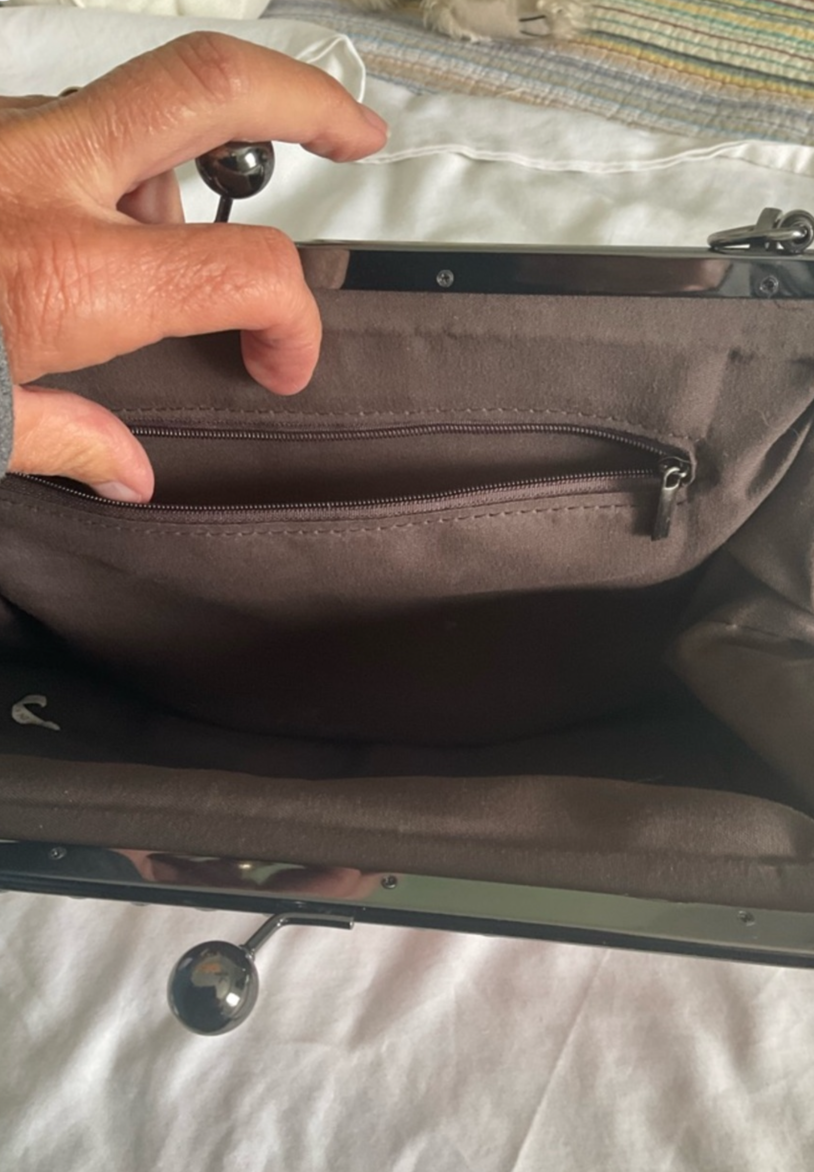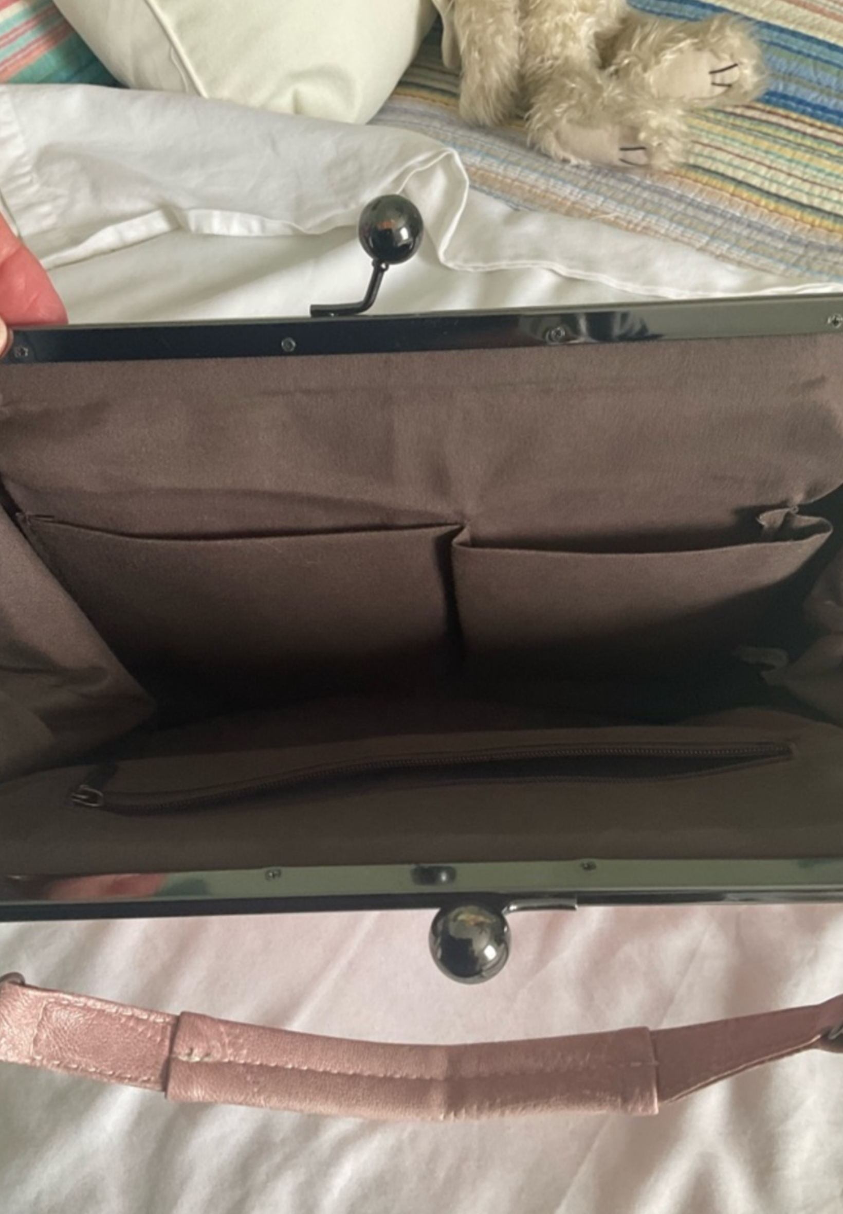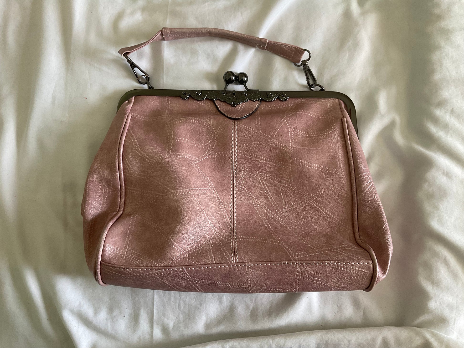 Vintage look Chic pink frame-top clutch with delicate stitched pattern. Antique-style metal kiss-lock frame adds vintage charm. Detachable wrist strap for easy carrying. Soft pink finish complements day or evening outfits. Has inside pockets. Roughly 11” x 8” in size.