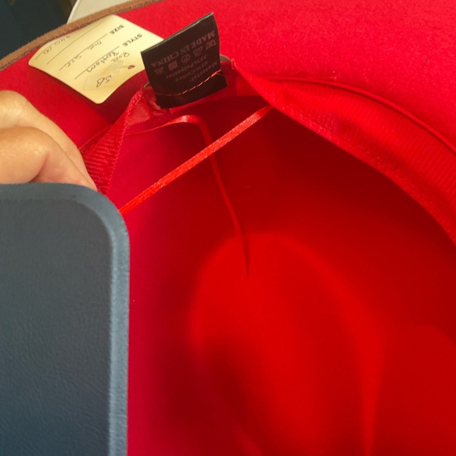 65% cotton, 35% polyester. Note the red bottom has a border of the color on the hat as the fabric is overlapped. Also has a tie string.