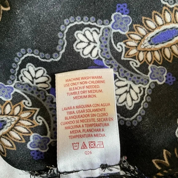 Faded Glory Tunic that is black with blue, white and tan designs. This has a roll sleeve that buttons and has 3 bottoms at the neckline and a v neckline. Has a high/low hem.