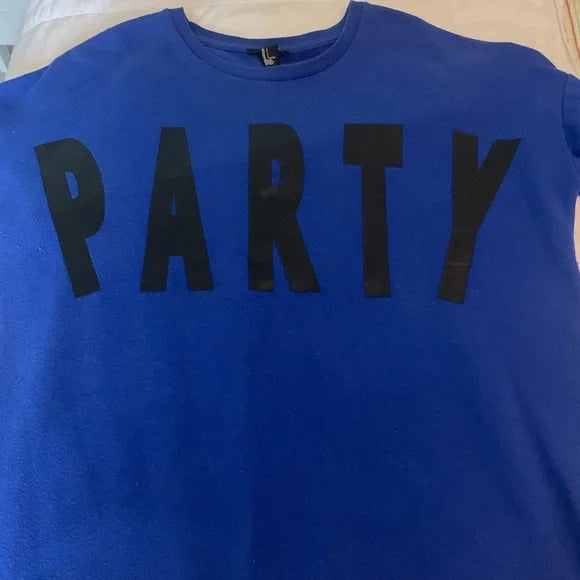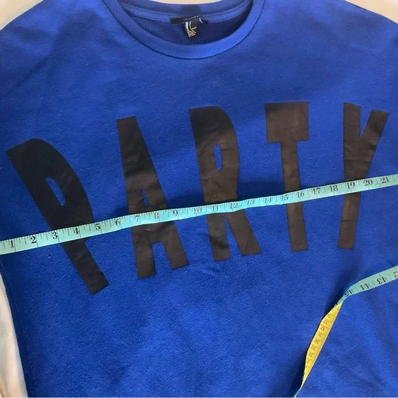 Forever 21 royal blue sweatshirt with a crew neck and also has the word PARTY in black on the front.