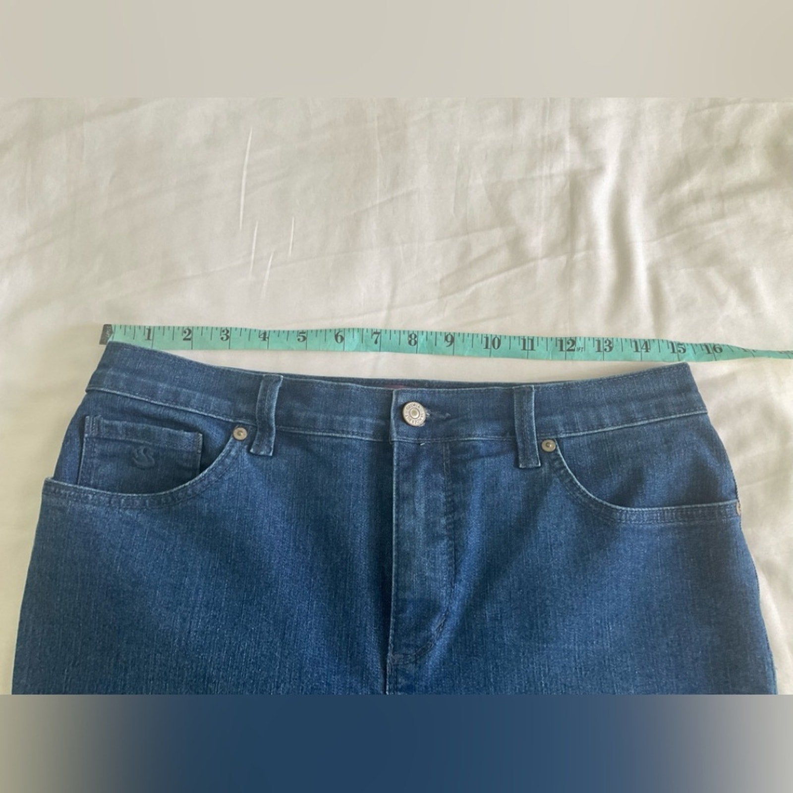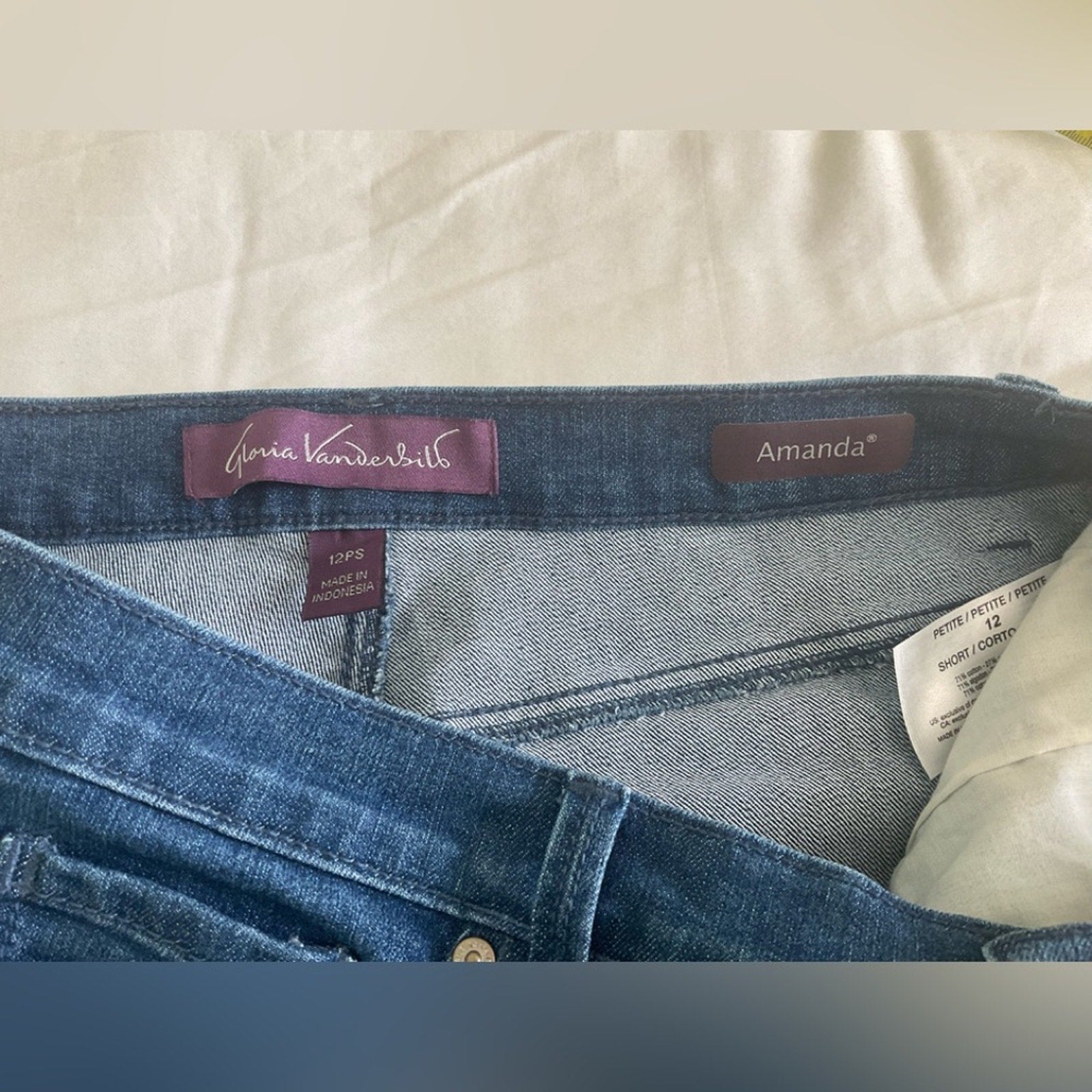 Gloria Vanderbilt Amanda Stylish boot cut jeans. Classic blue color. Perfect for casual wear. Has front and back pockets and zipper and button closure.
