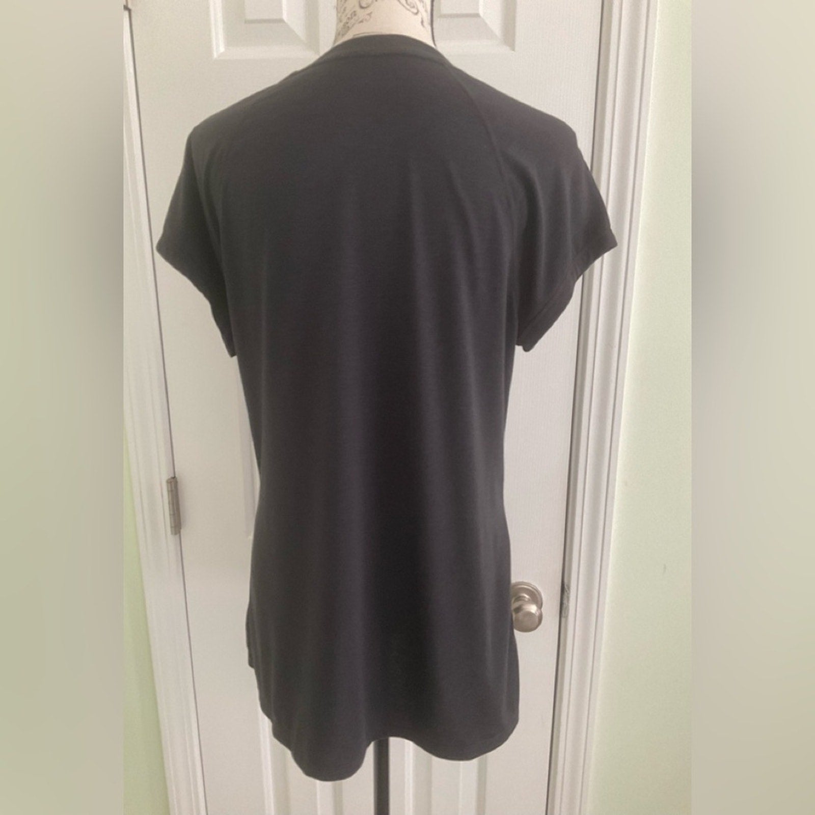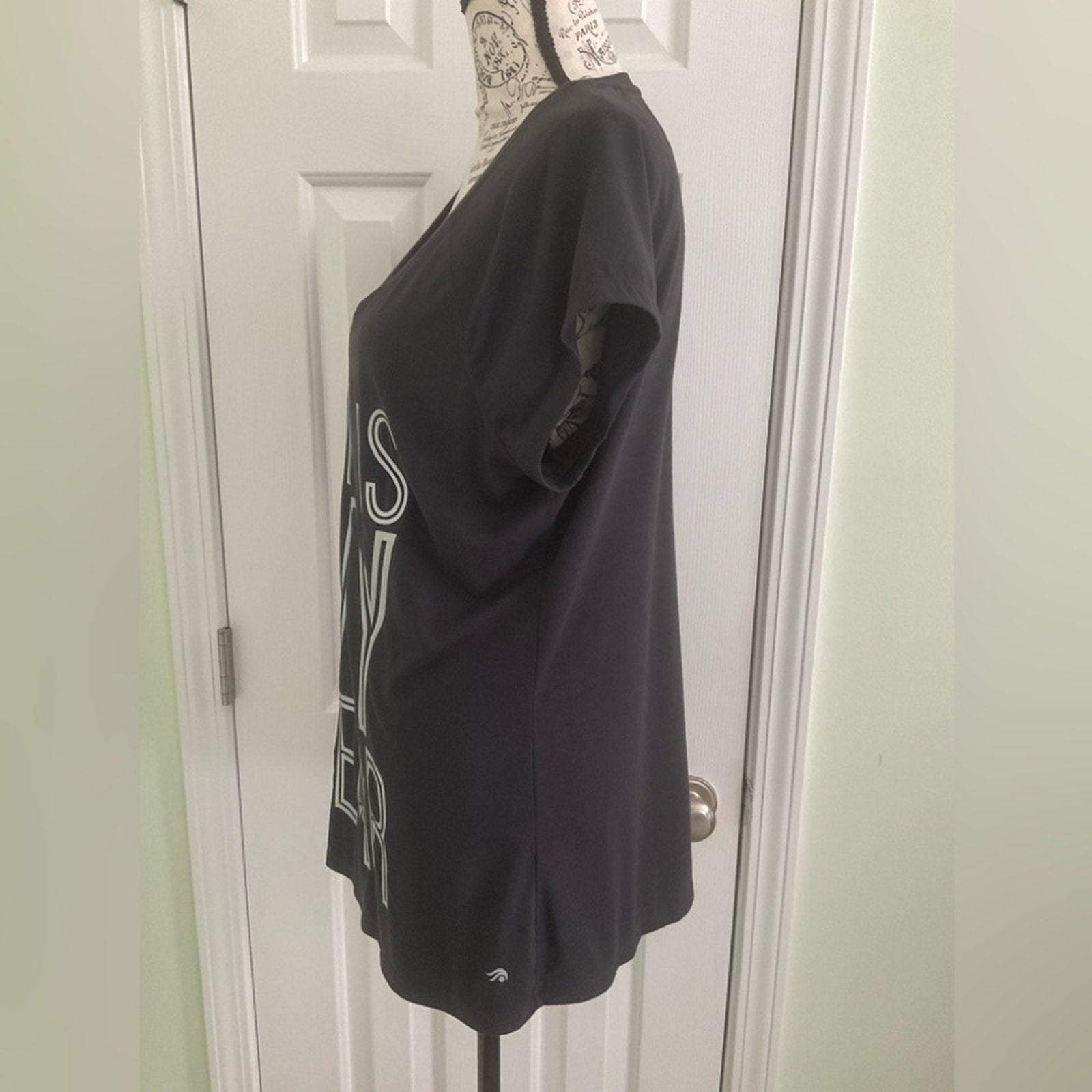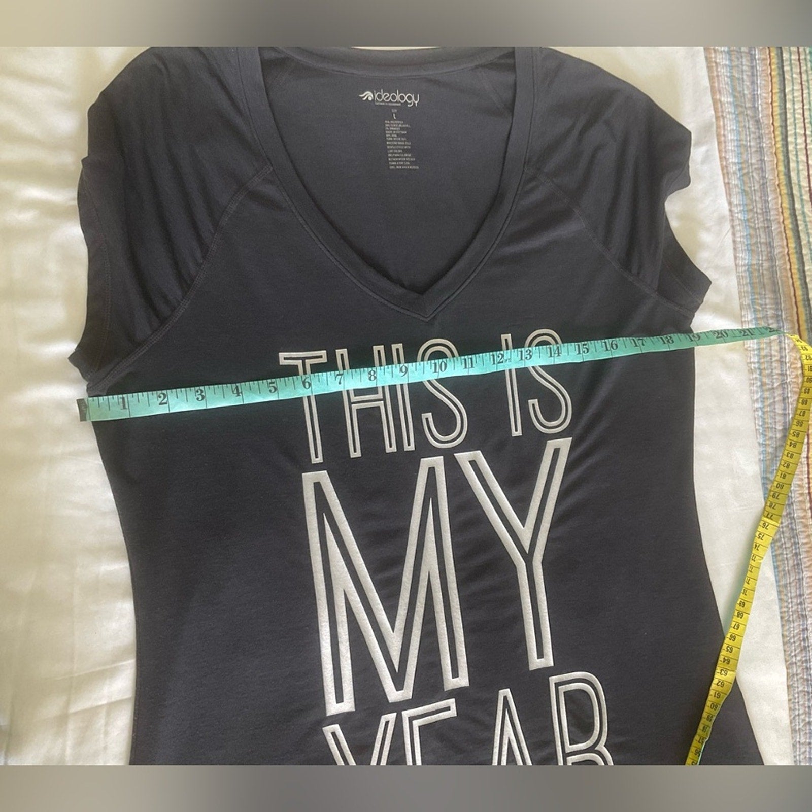 Ideology Stylish black V-neck short sleeve tee with bold statement graphic that says This is My Year. Ideal for casual wear or for the gym or yoga. This t-shirt is long so notice the measurements below.
