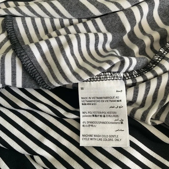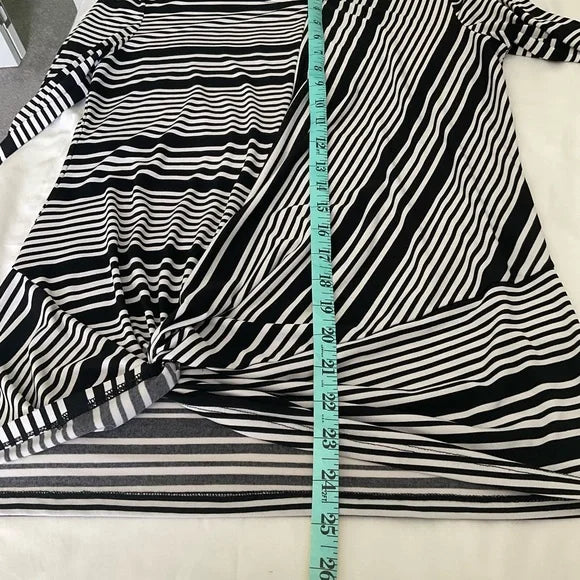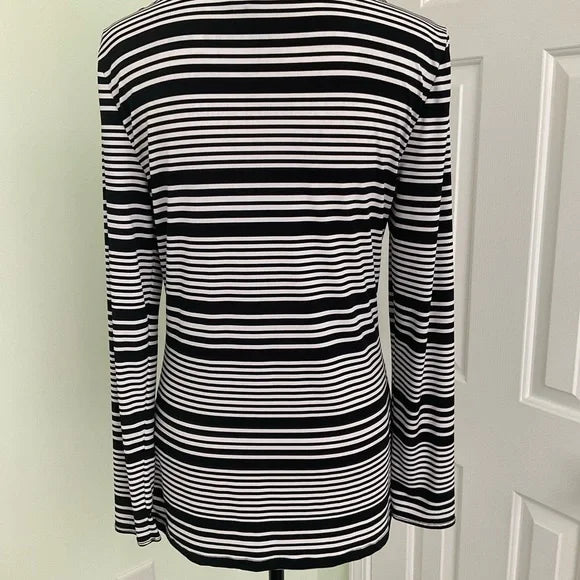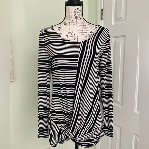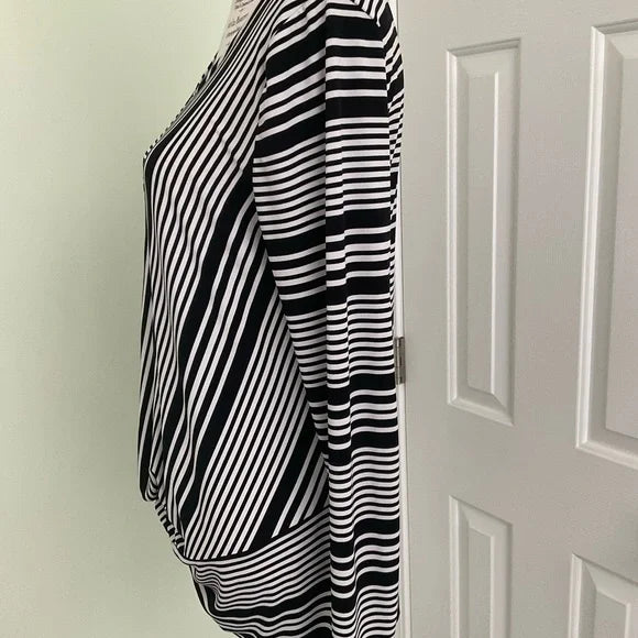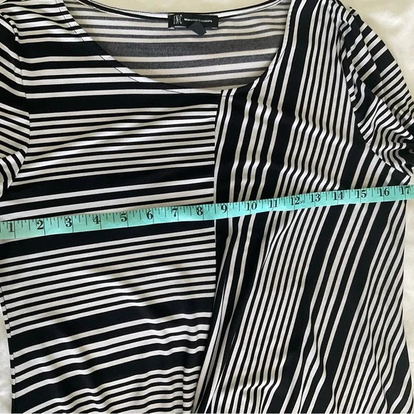 I.N.C International Concepts pullover top with scoop neck and long sleeves. This is black and white stripes in different directions. Also has a scrunched look on front.