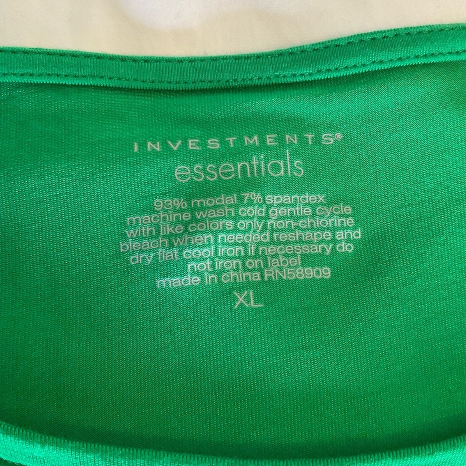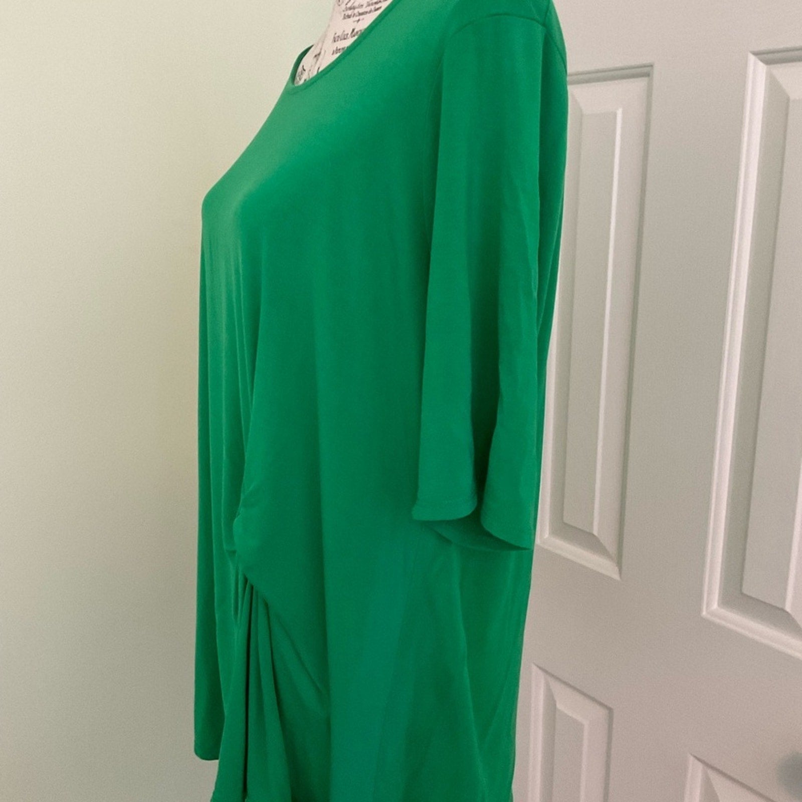 Investments Kristin side tattered top with scoop neck and 1/2 sleeves. This top is a beautiful bright green.