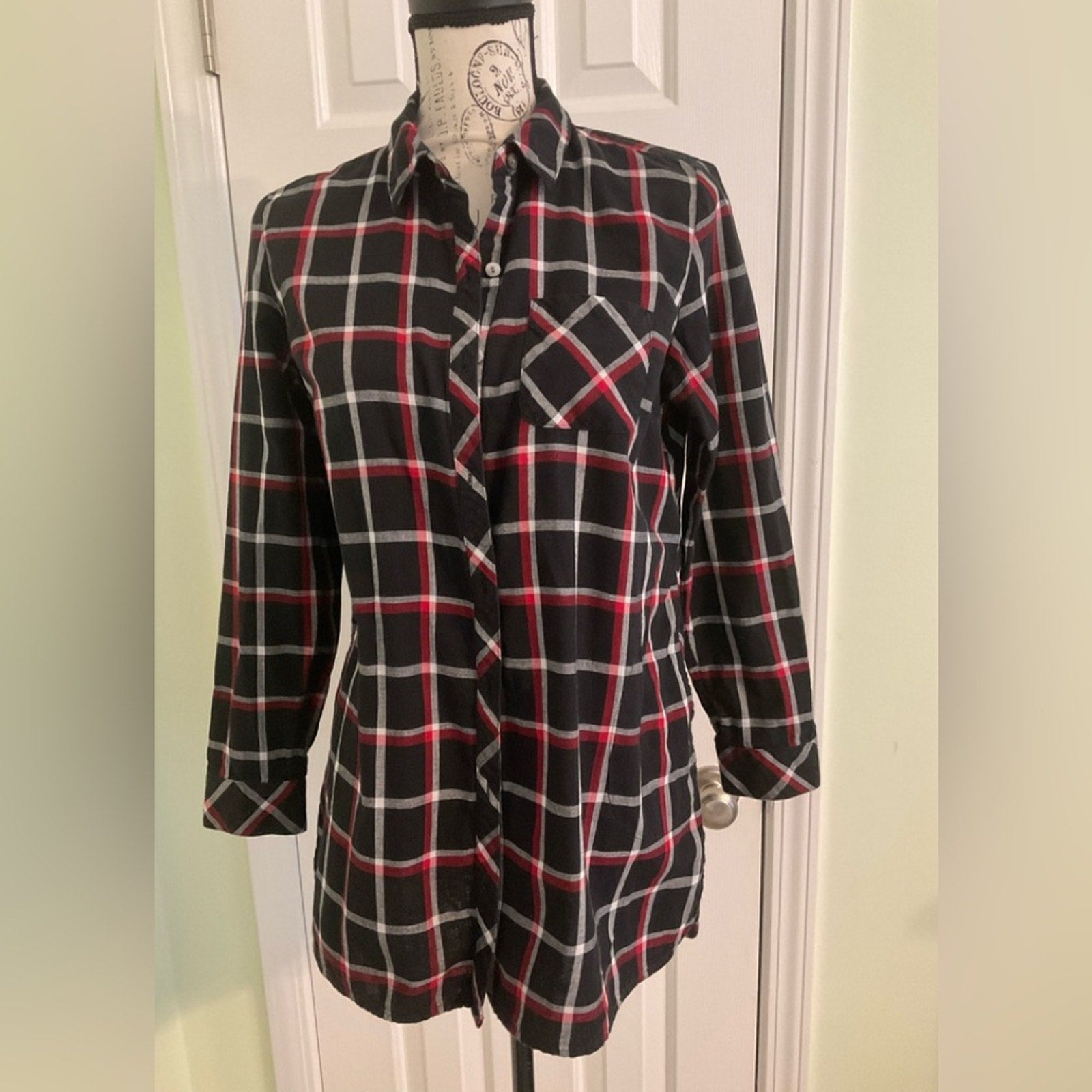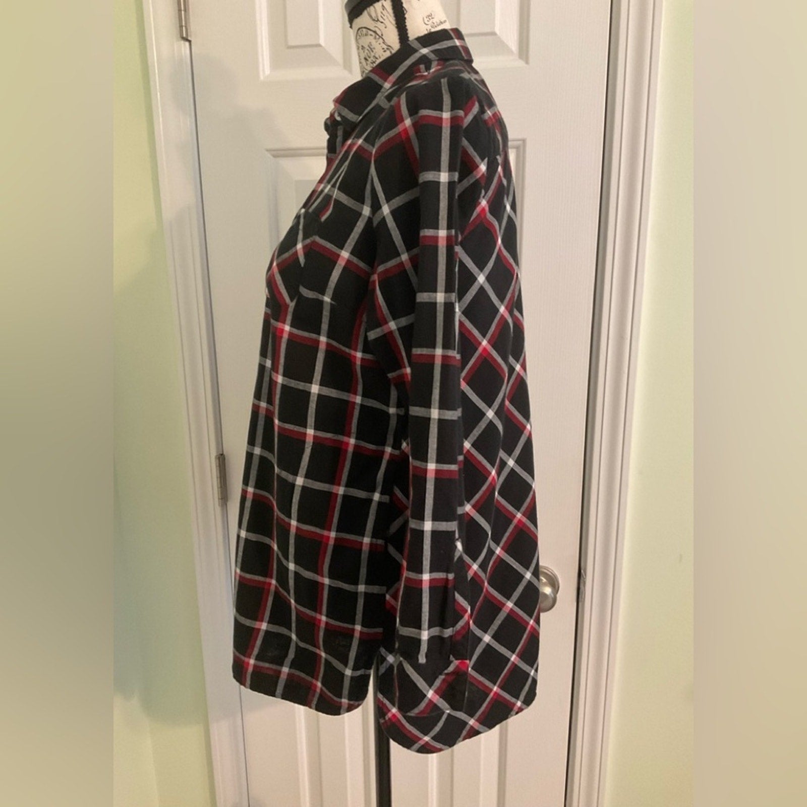 J. Jill black with red and white striped plaid design. This is a button down with a breast pocket. Also, it has side seam pockets. I love the inside look of this blouse also.