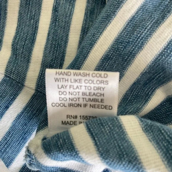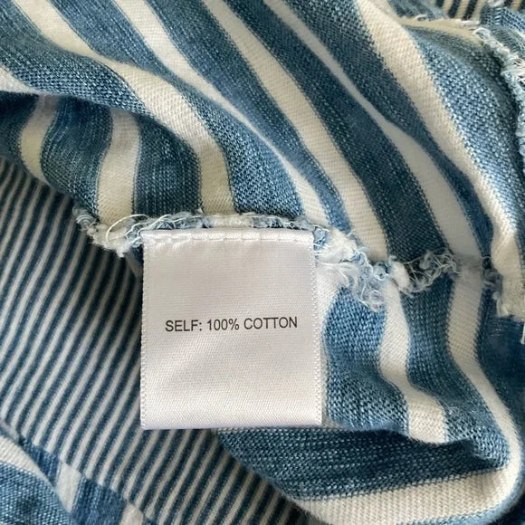 Jane and Delancey Tunic top in blue and white stripe and has short sleeves. This is a cute flowy tunic with a smaller stripe inset on the back. This would be beautiful with a pair of jeans. The front has the rough inseams on each side.