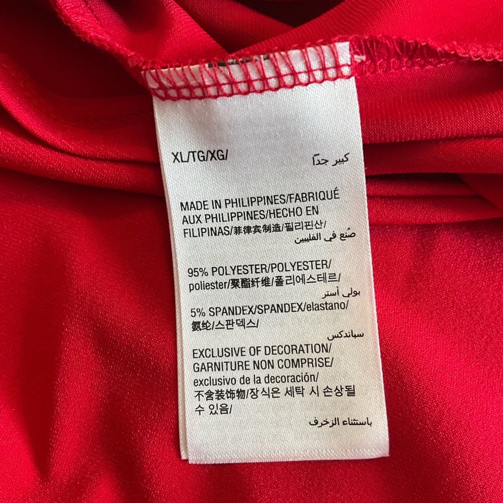 JM Collection red cold shoulder tunic top with 3/4 sleeves and has a CZ scoop neckline.