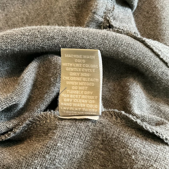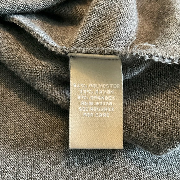 Size Large and The back is longer in length that the front. Length measures roughly 25 1/2” in front and 27” in back. Width is 18”. 62% Polyester,