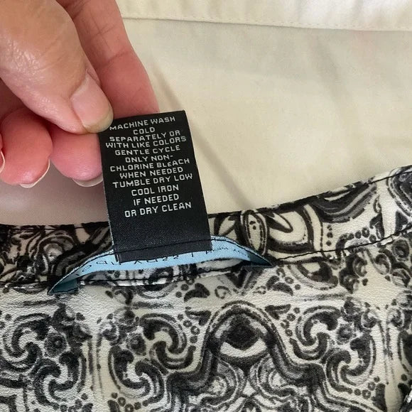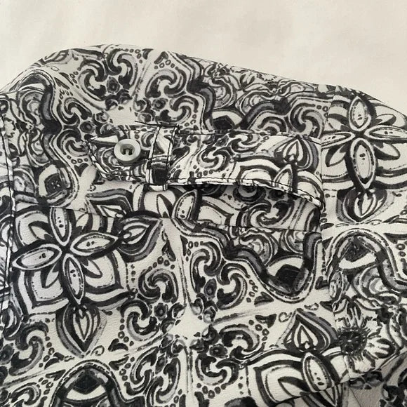 Joan Vass Tunic button down blouse in black and white print. Has long sleeves that can be rolled up and buttoned. Flaps that look like pockets on the front breast and tab button look on the shoulders.