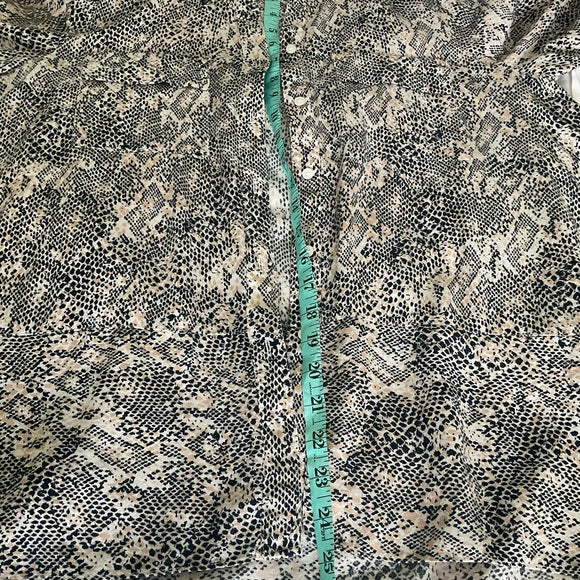 Jones New York button down tunic top in black white and a beige/gold color. The sleeves are long and open and can be rolled up and buttoned. Also, has two front breast pockets. I loved this top with a pair of black leggings.