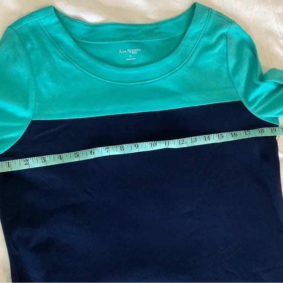 Kim Rogers colorblock tunic with 3/4 sleeves. Bottom part is navy blue and top is turquoise. Has a scoop neck in the front, and a slit on the side inseams at the bottom.