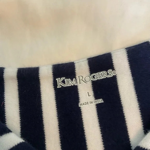 Kim Rogers pullover top with v-neckline and long sleeves that just barely come to the wrist. This is in a blue and white stripe with the top at a different angle stripe. The body of this top is loose fitting.