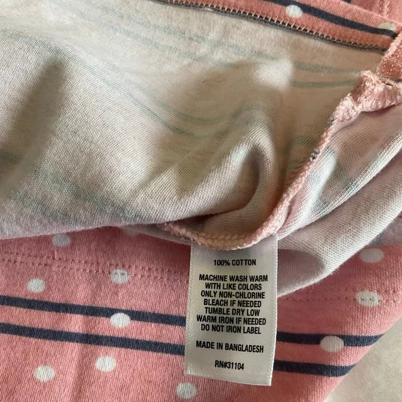 Kim Rogers pullover top with short sleeves. This top has a soft feel, and is pink with blue strips and white dots for detailing.