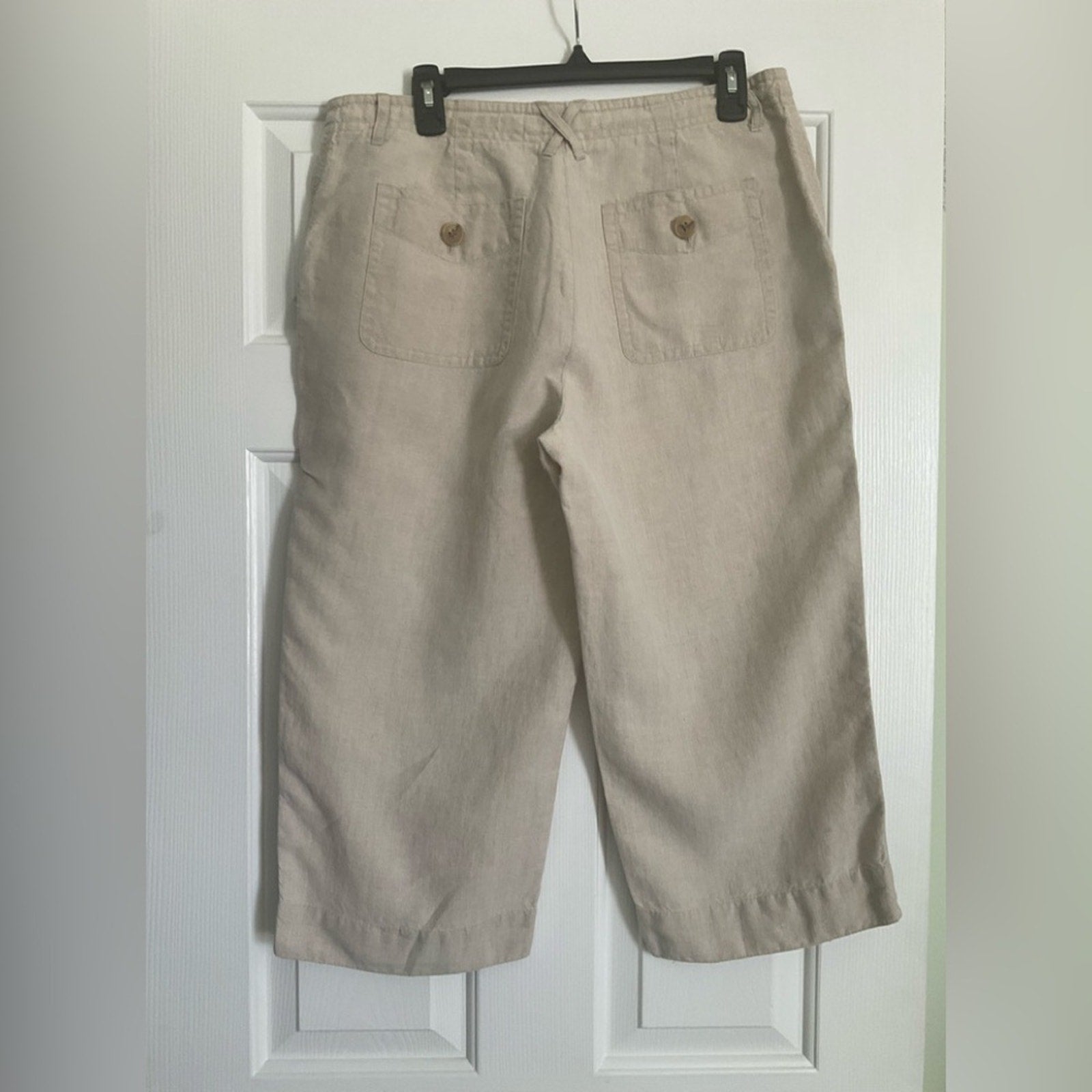 Liz Claiborne Audra Comfortable tan Linen capris with zipper and hook closure as well as a tie string at the waist. These have front and back pockets and Perfect for casual wear.