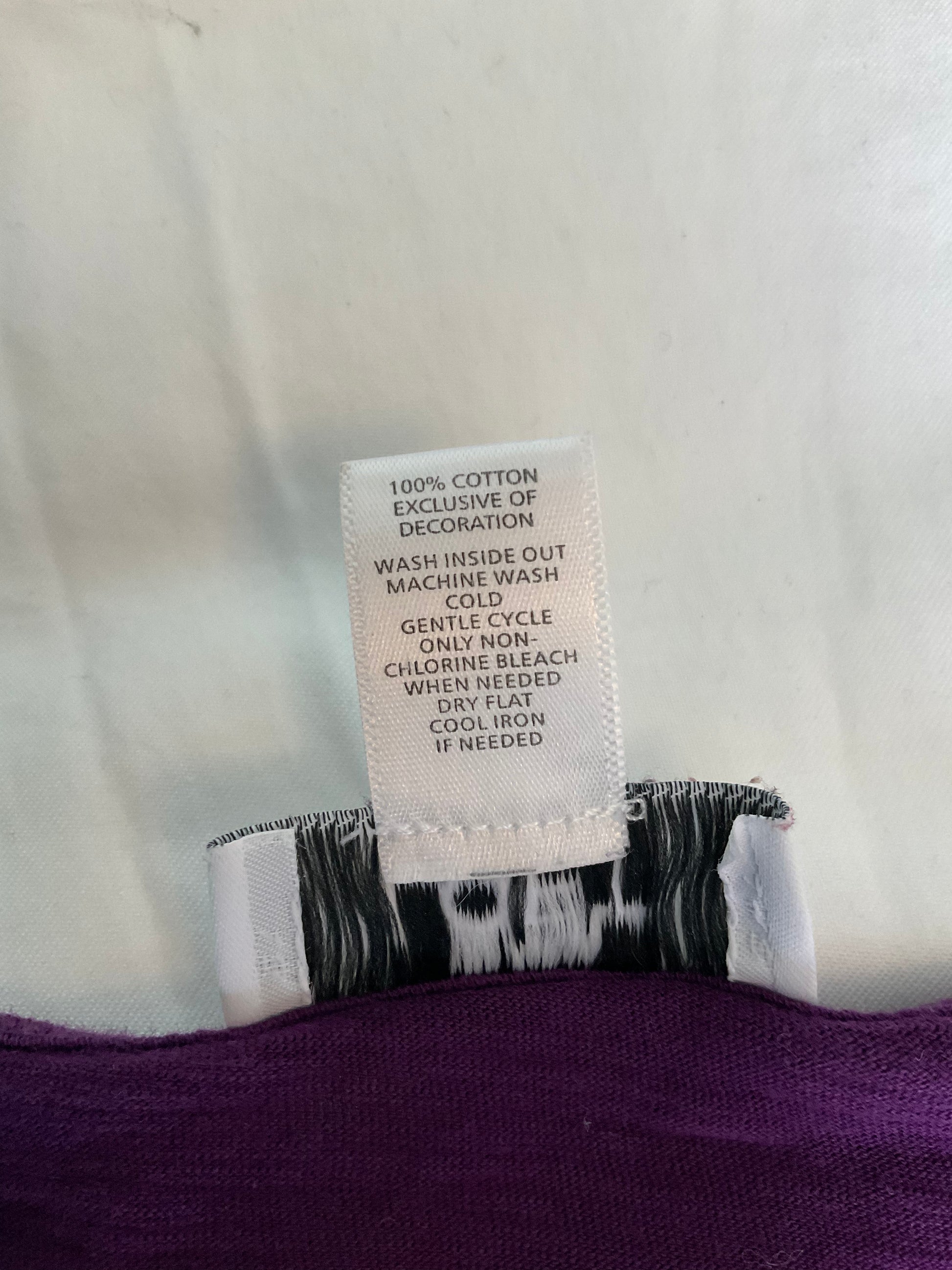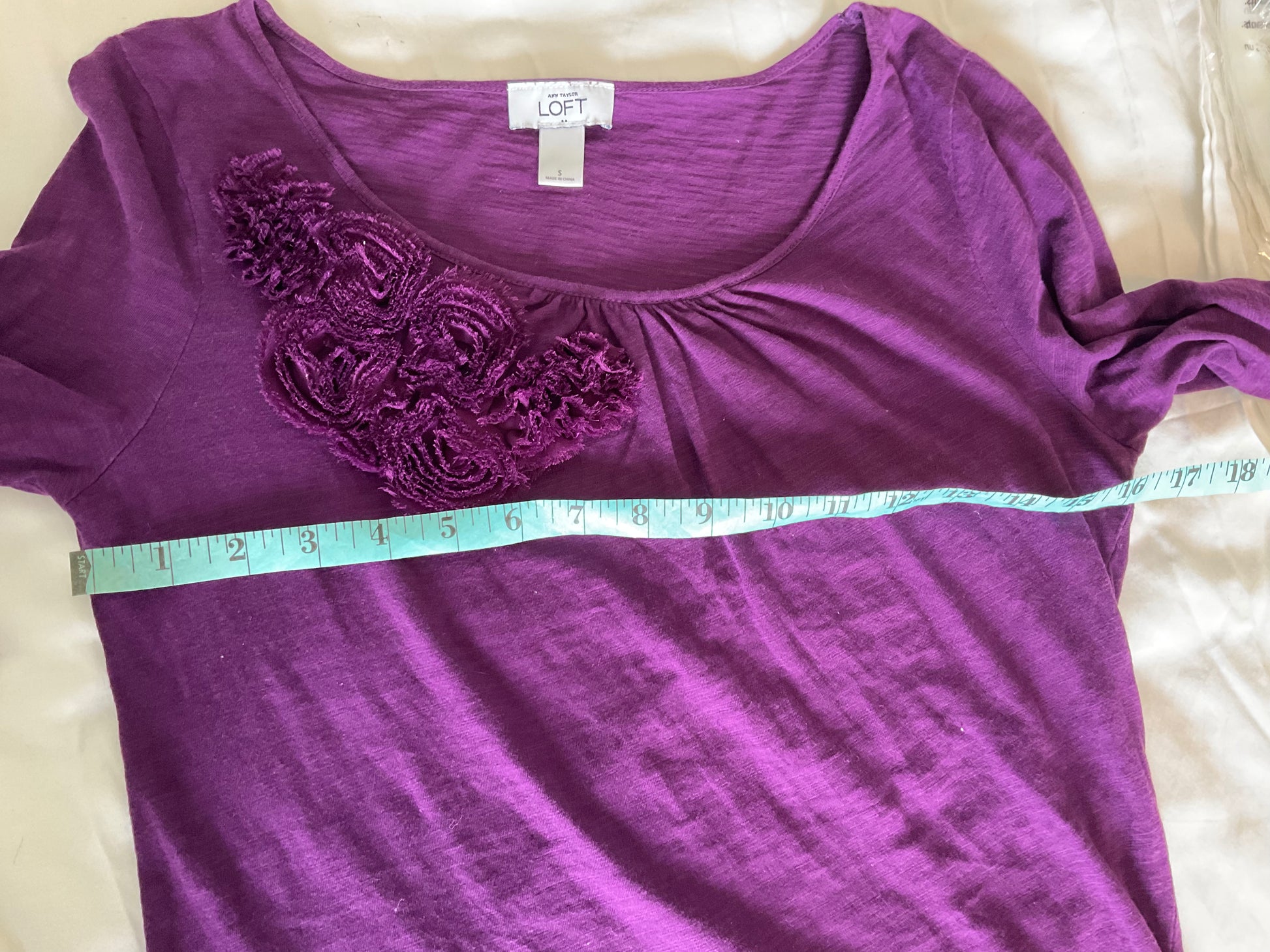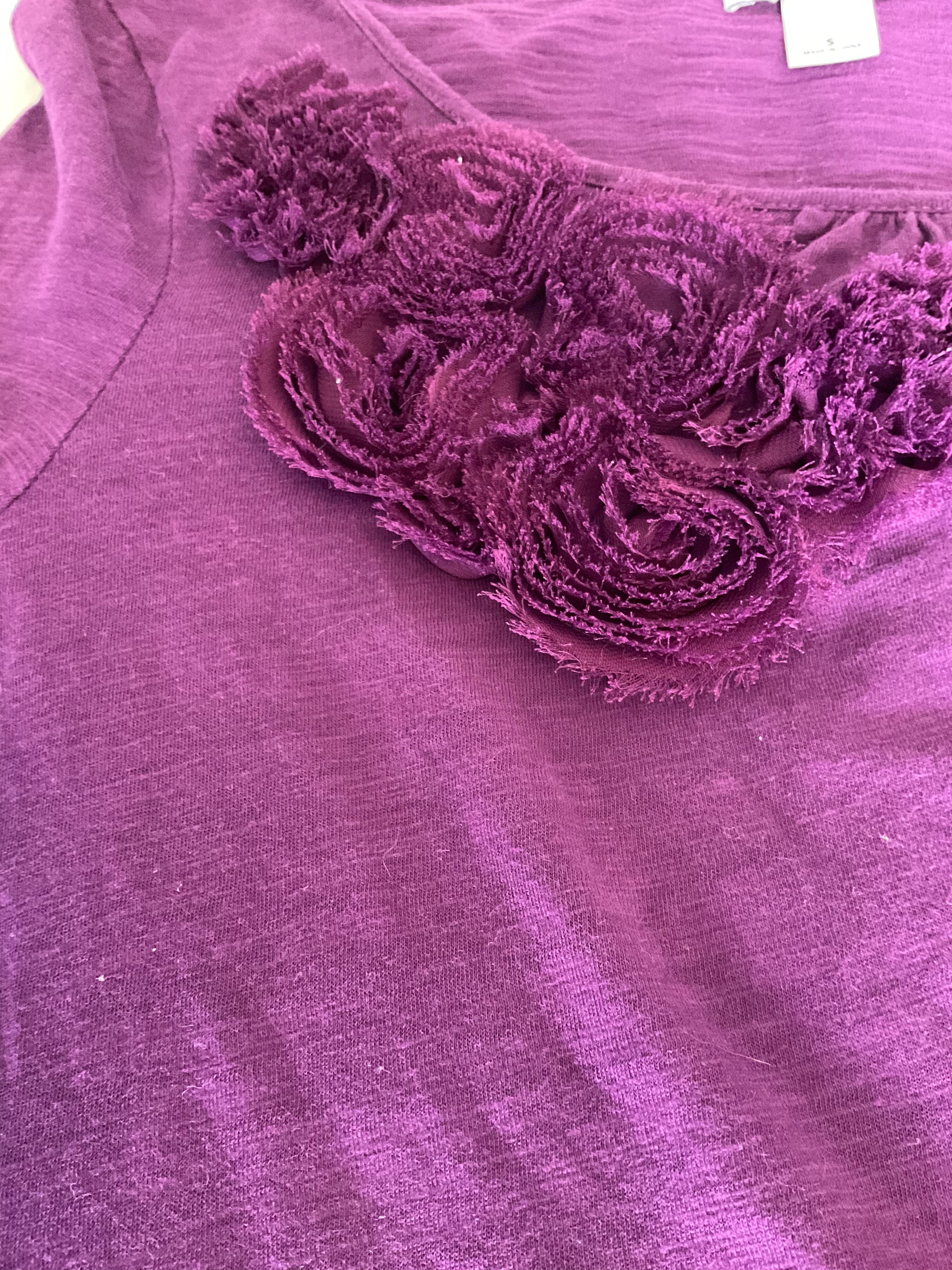 Ann Taylor LOFT purple 3/4 sleeve top with scoop neck. This has a raised flowering detail on upper right chest.