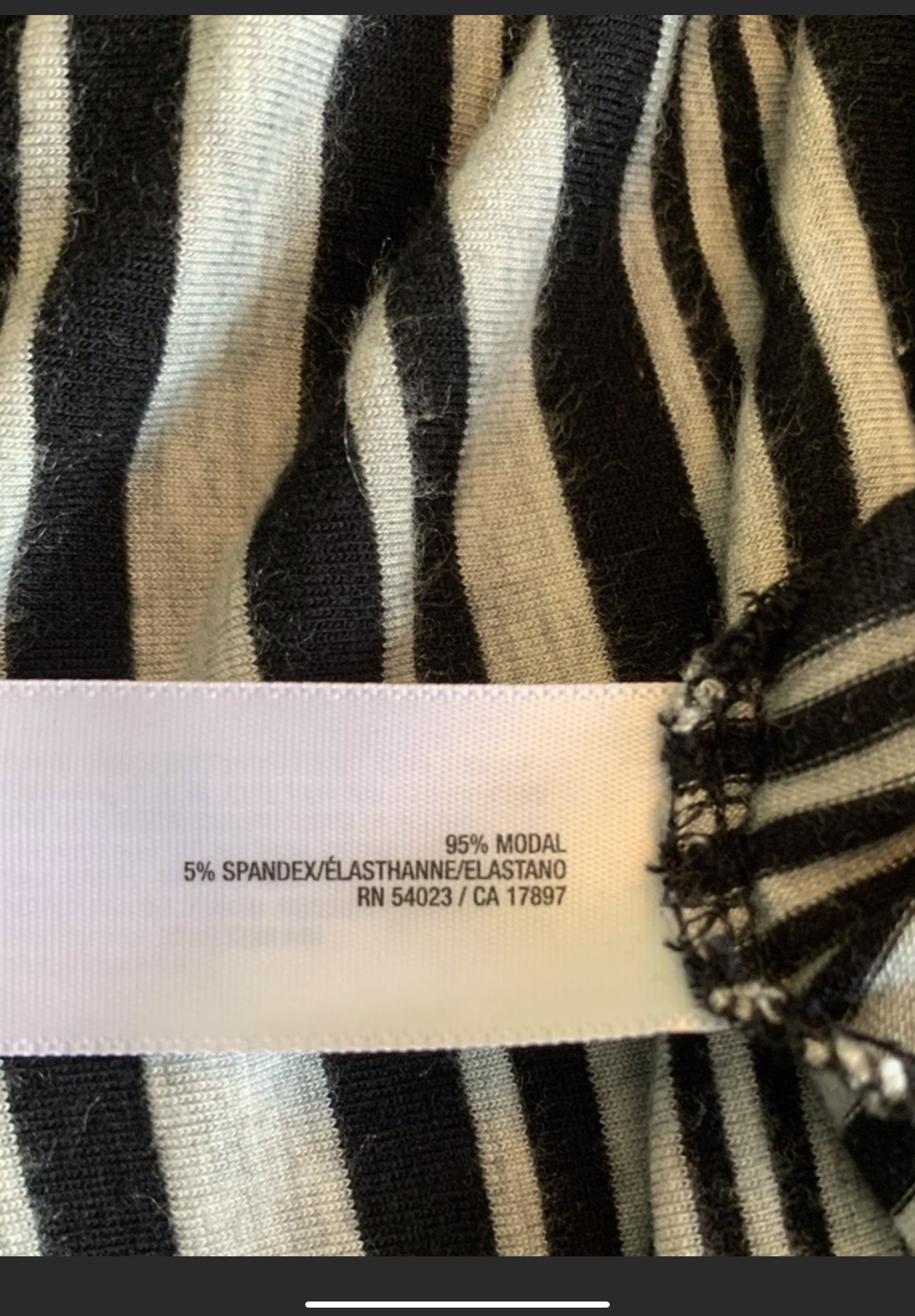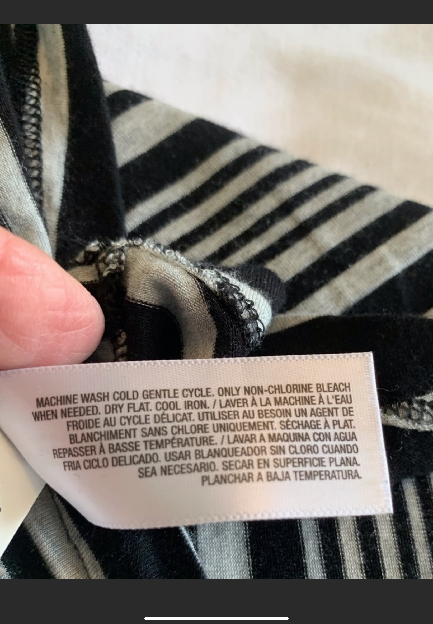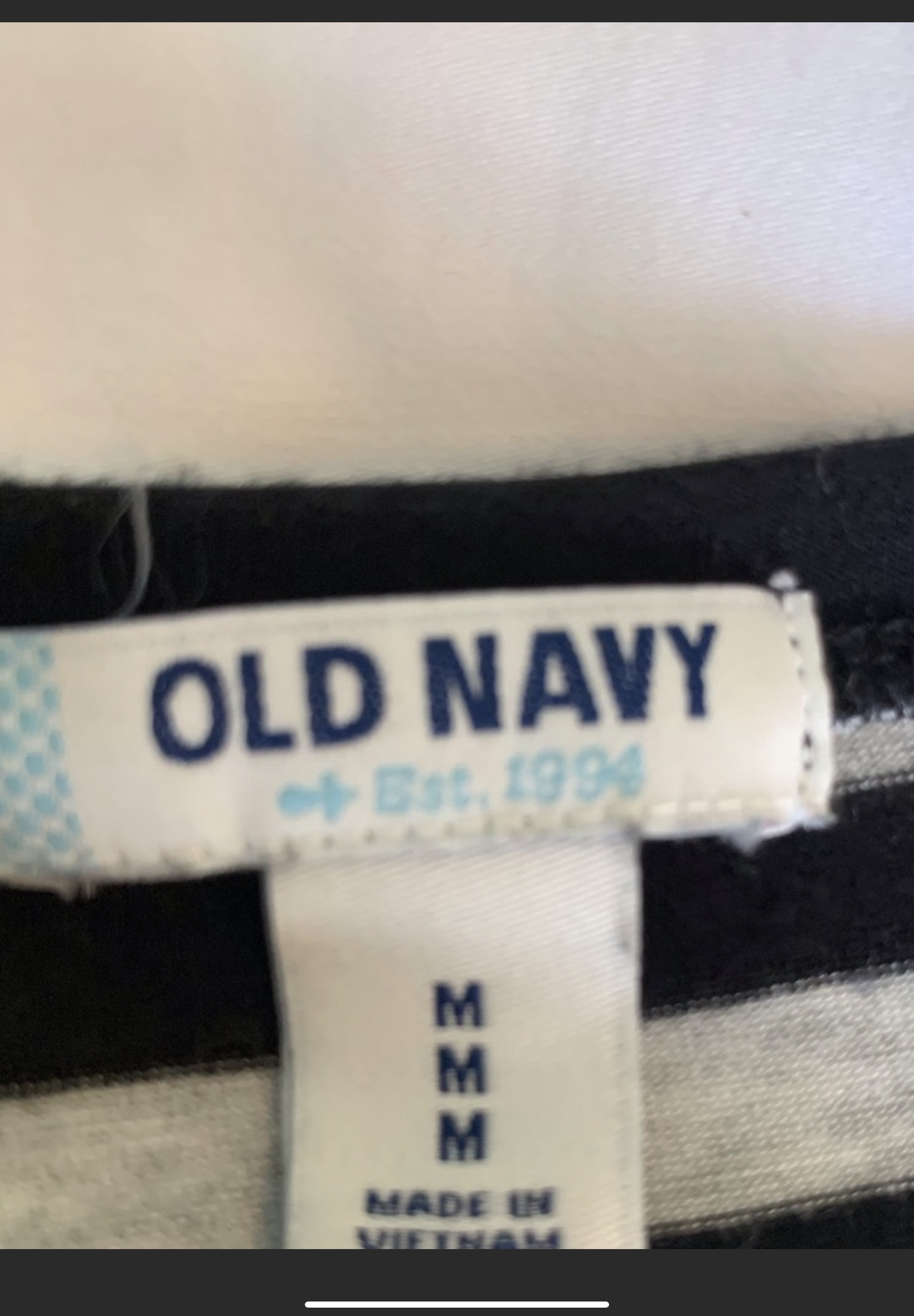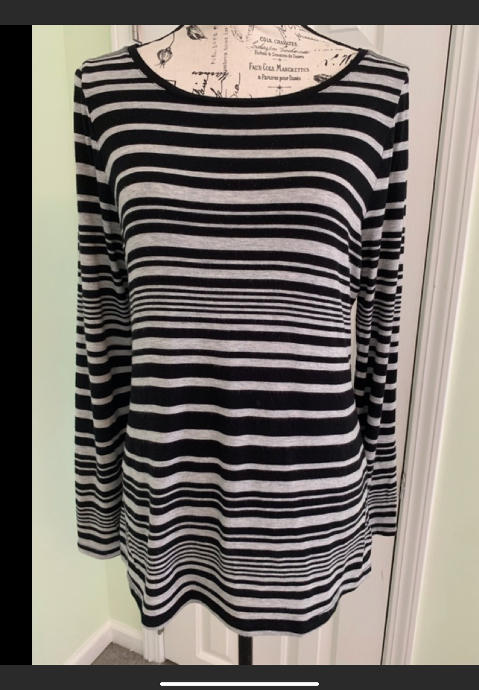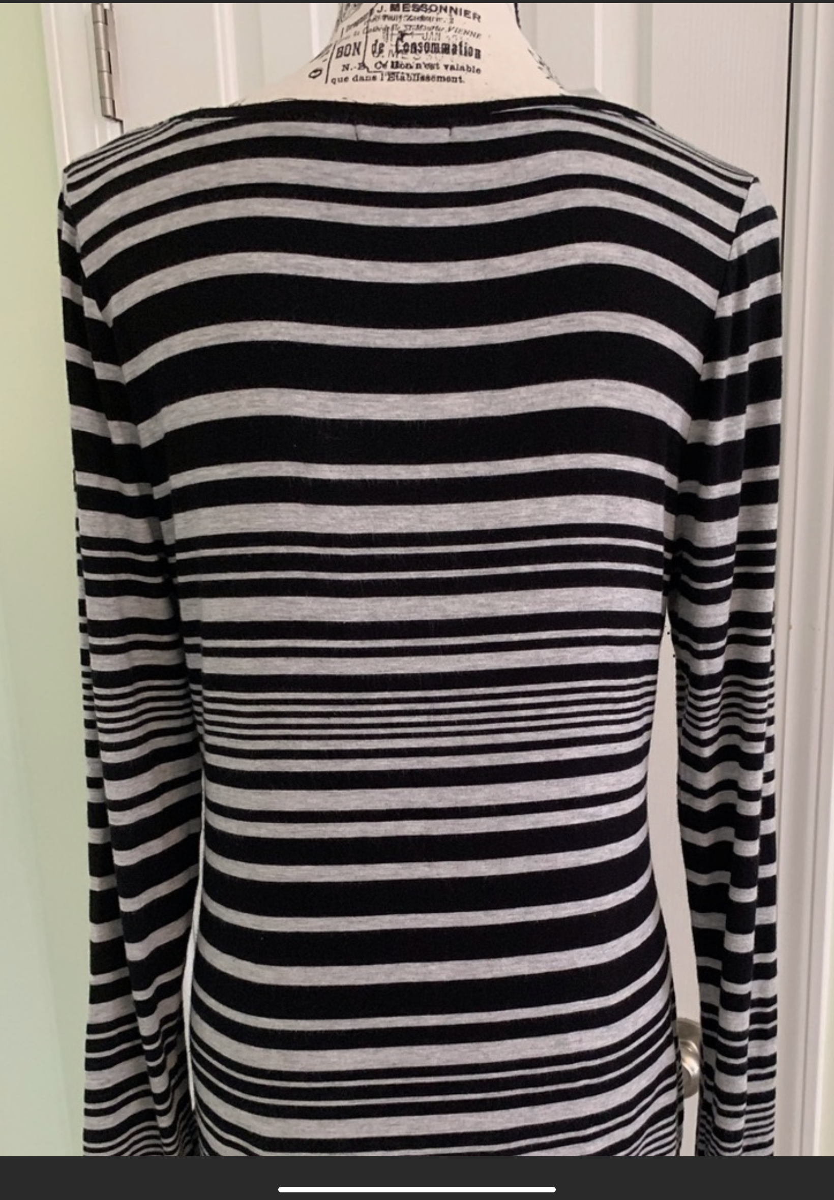 Old Navy long sleeve t-shirt with a scoop neckline in black and gray striped. The back is 2" longer than the front.