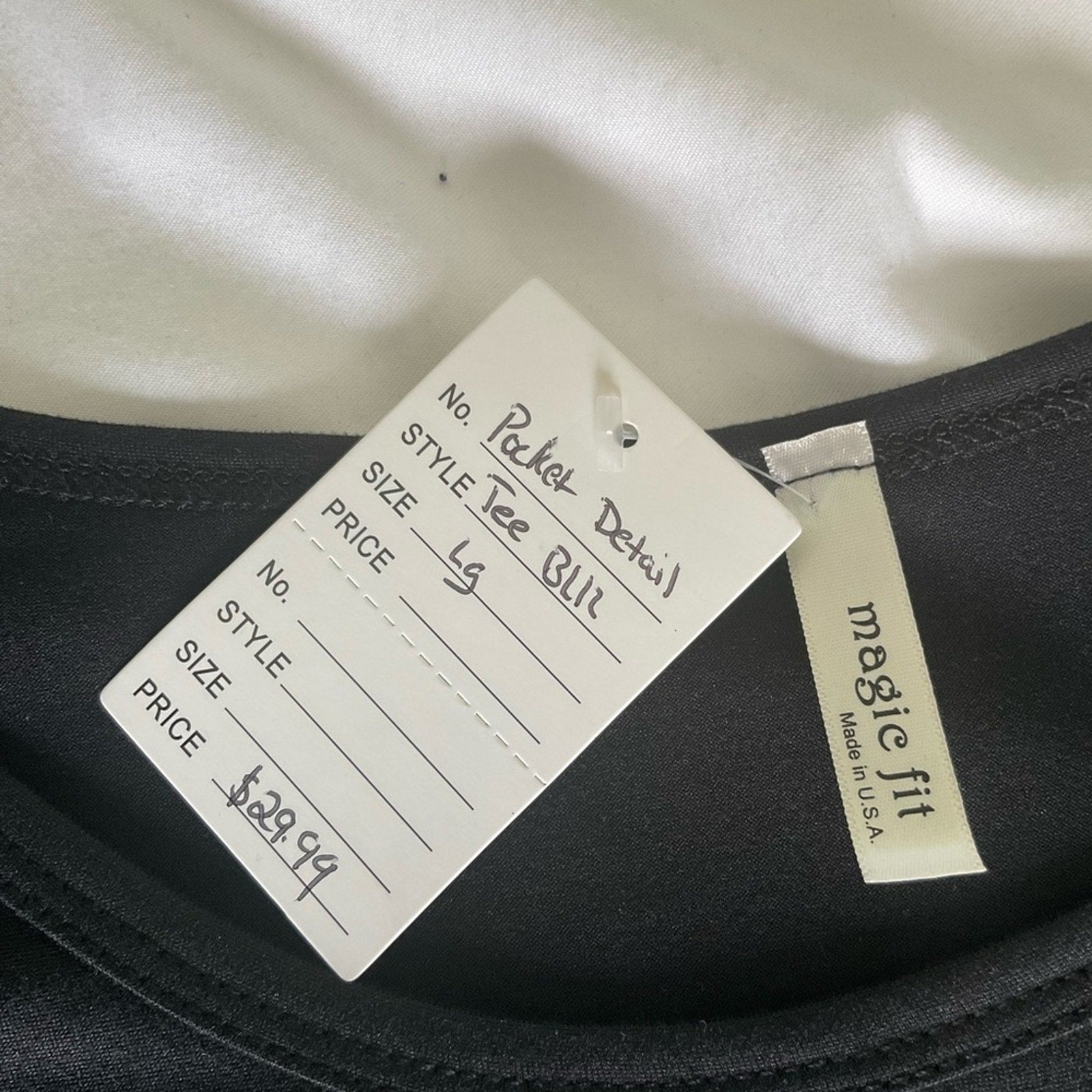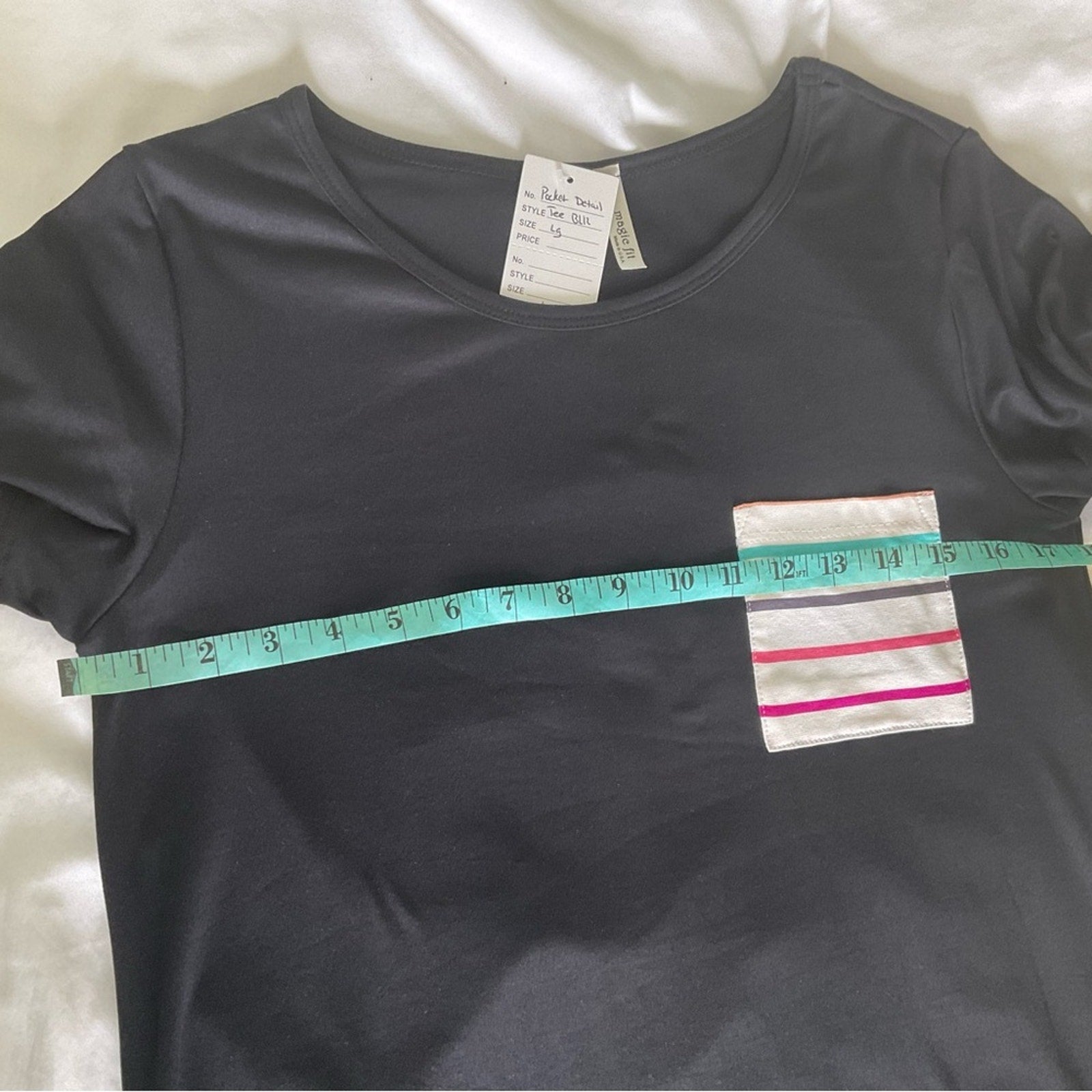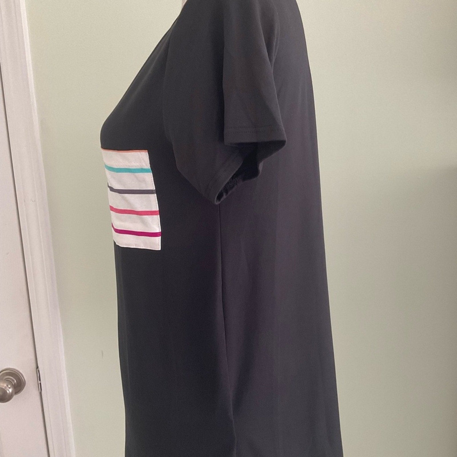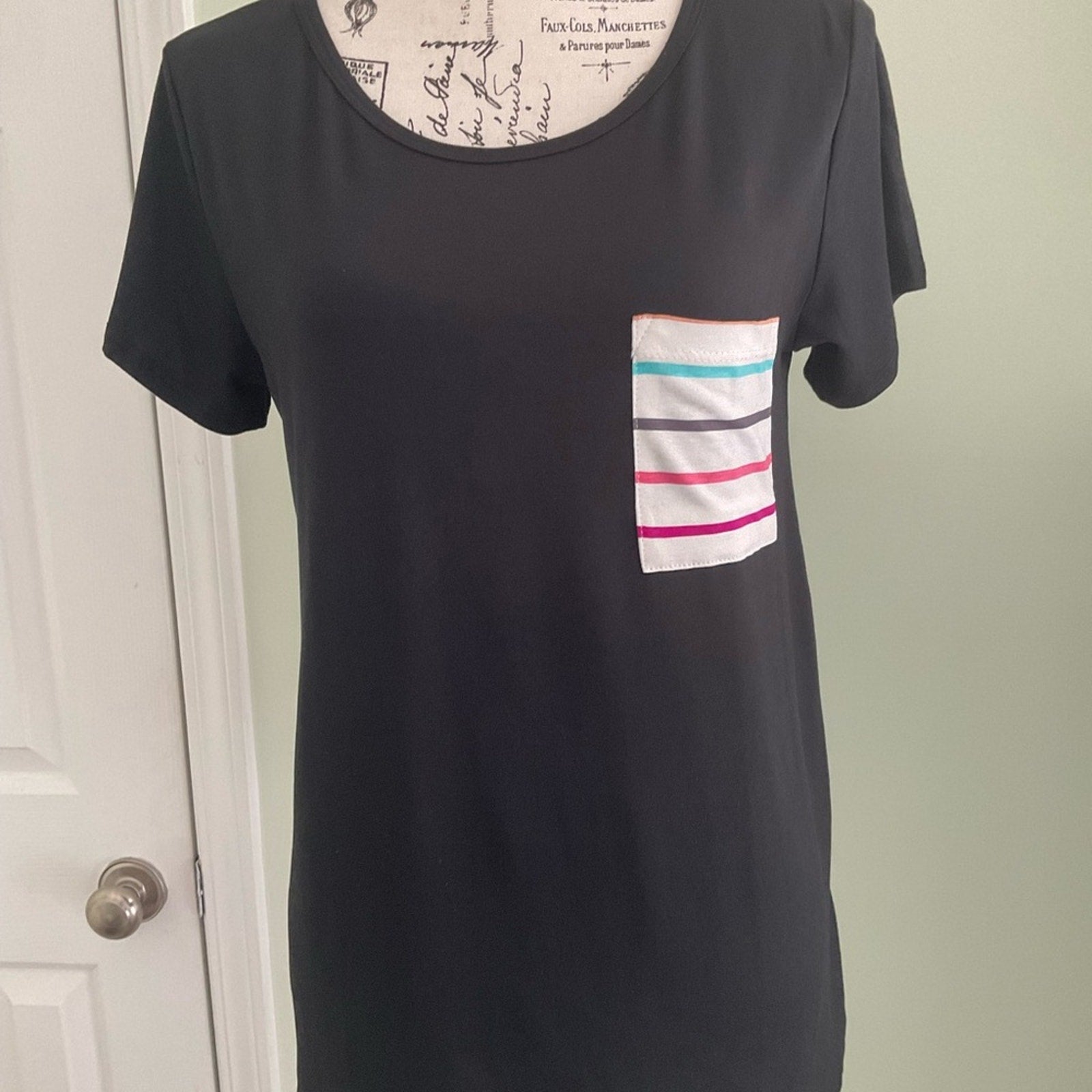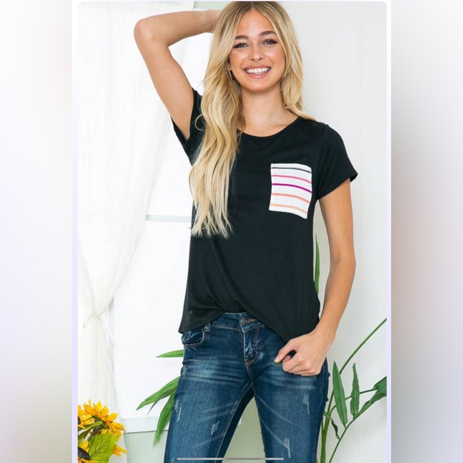 Agriculture fit by Burgundy Apparel short sleeve t-shirt with pocket detailing. This tee is black with white pocket that has gray, orange, blue and red stripe on it. Also, this tee is super soft feeling. One of our best sellers and only one size Large left.