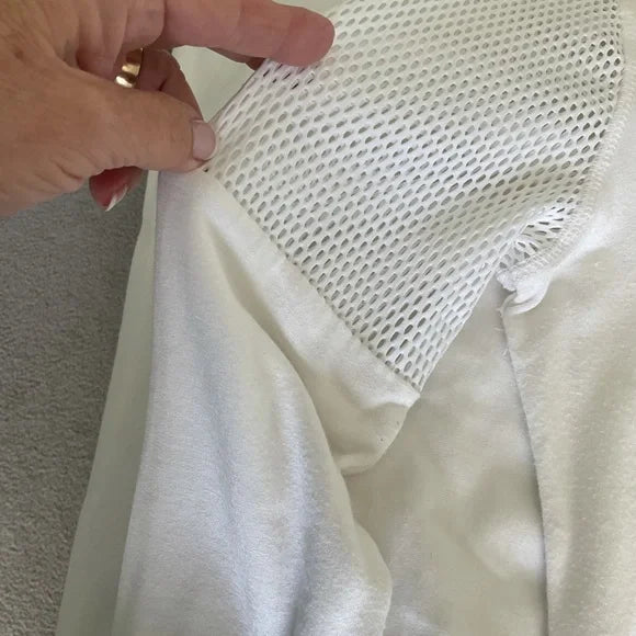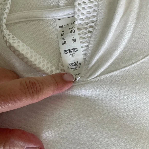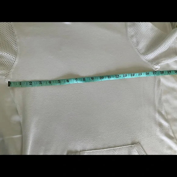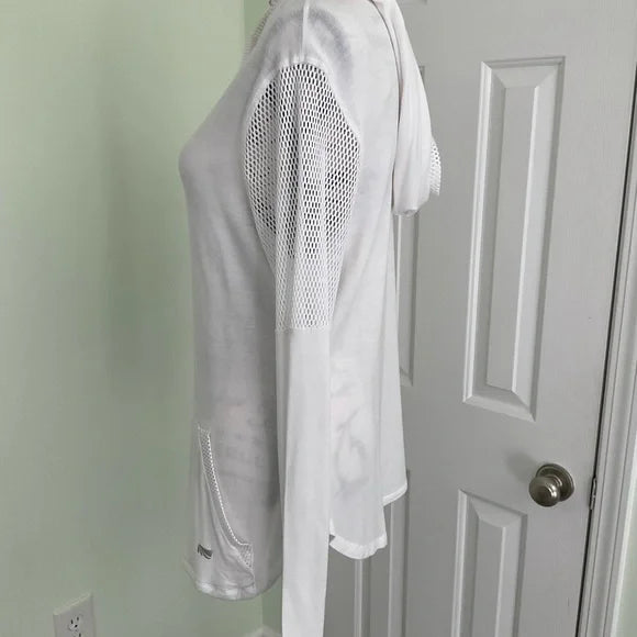 Marika hooded white pullover with front pouch pocket. Also has open fishnet like inserts in the sleeves and trim around the pouch pocket and around the hood.