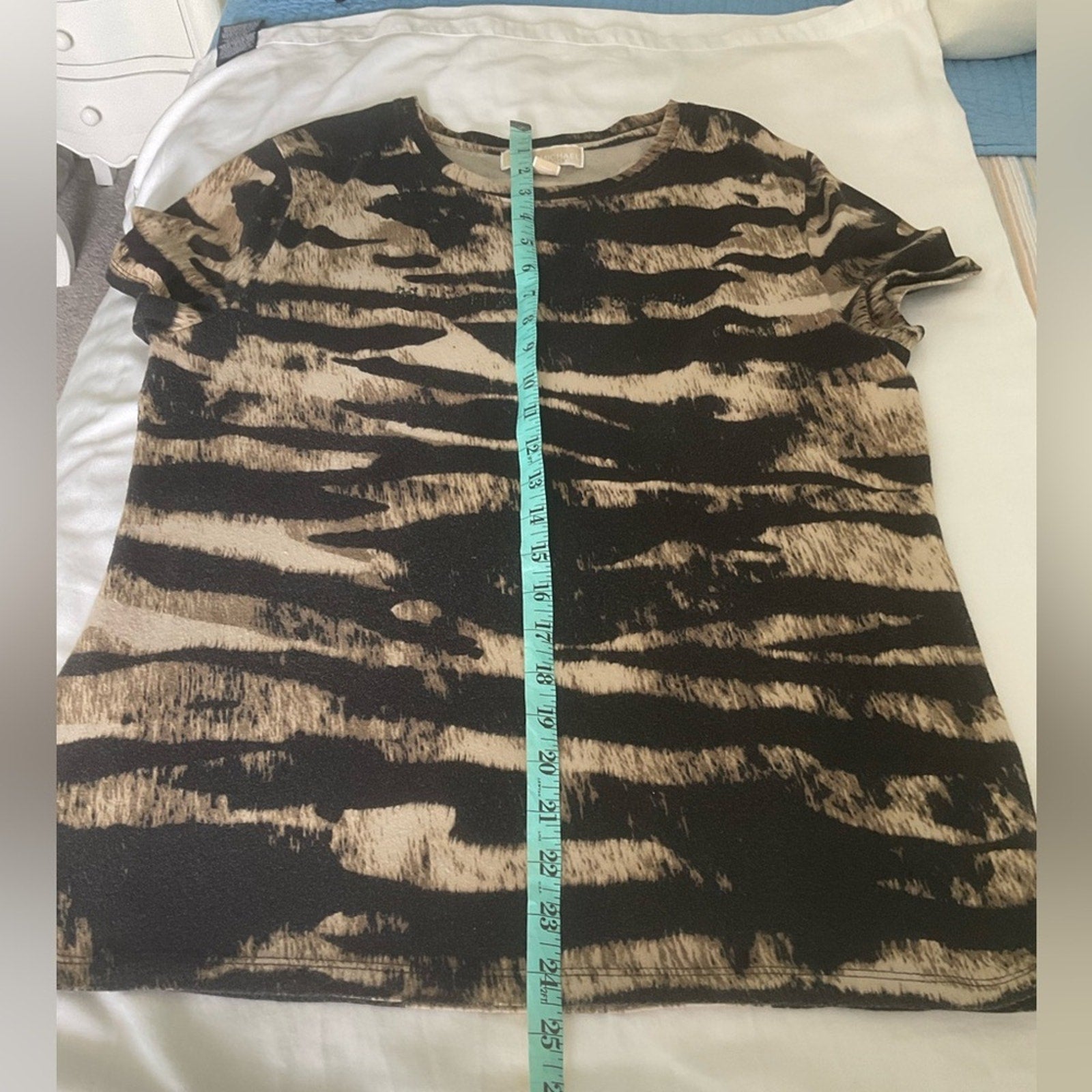 Michael Kors Chic short sleeve top with striking black and tan pattern. Ideal for versatile styling. On the front it has Michal Kors with black beaded embellishment.