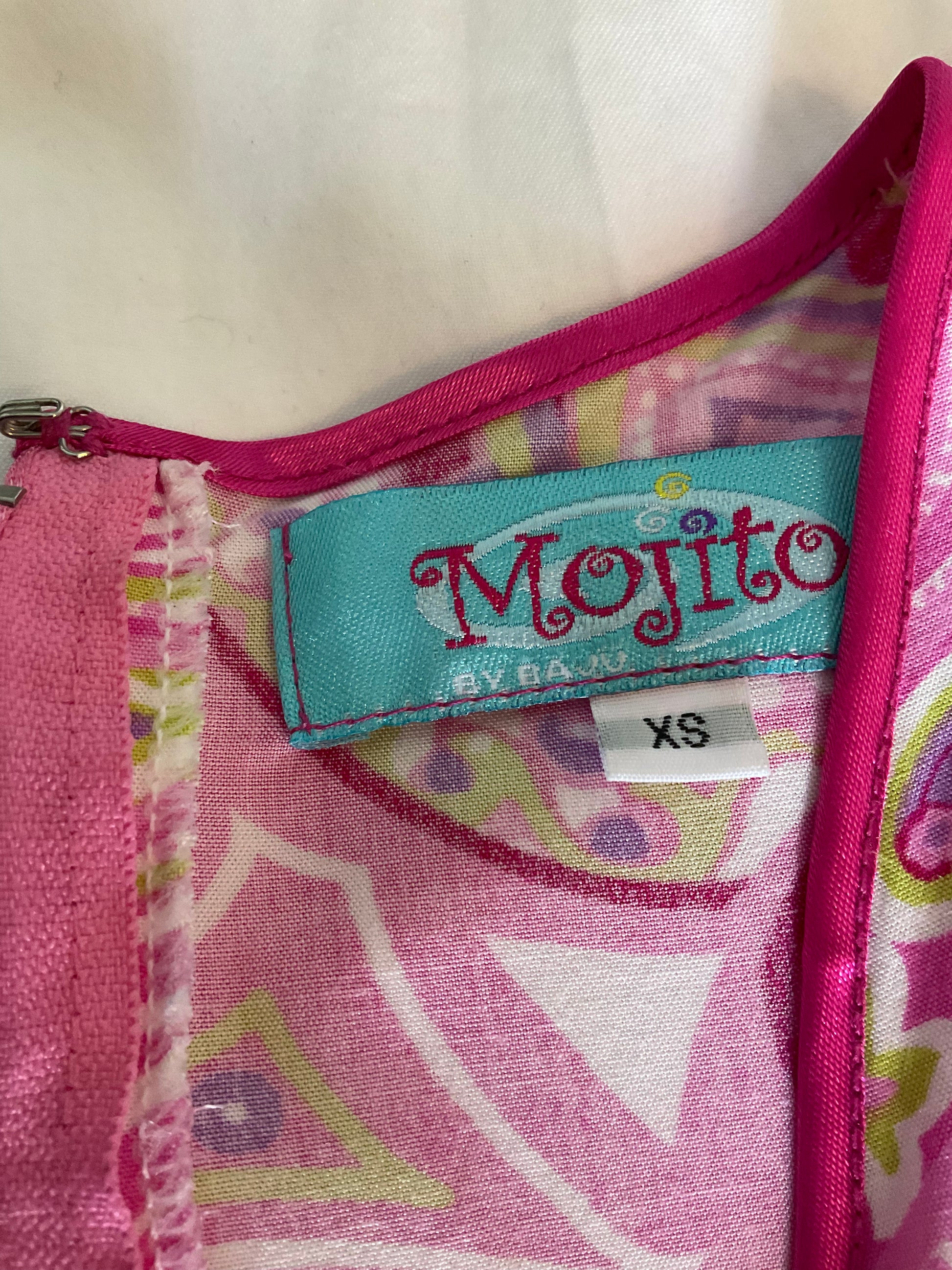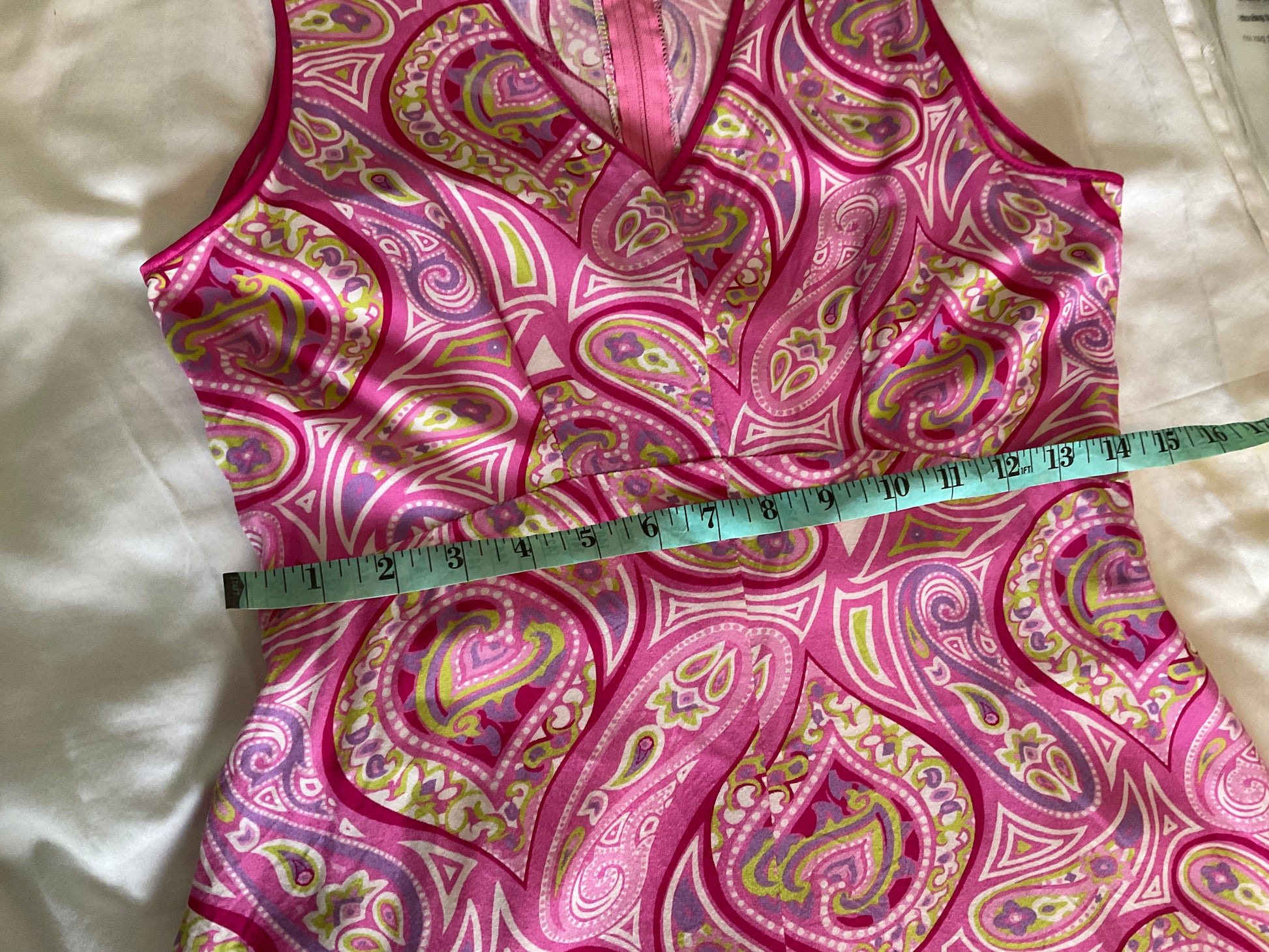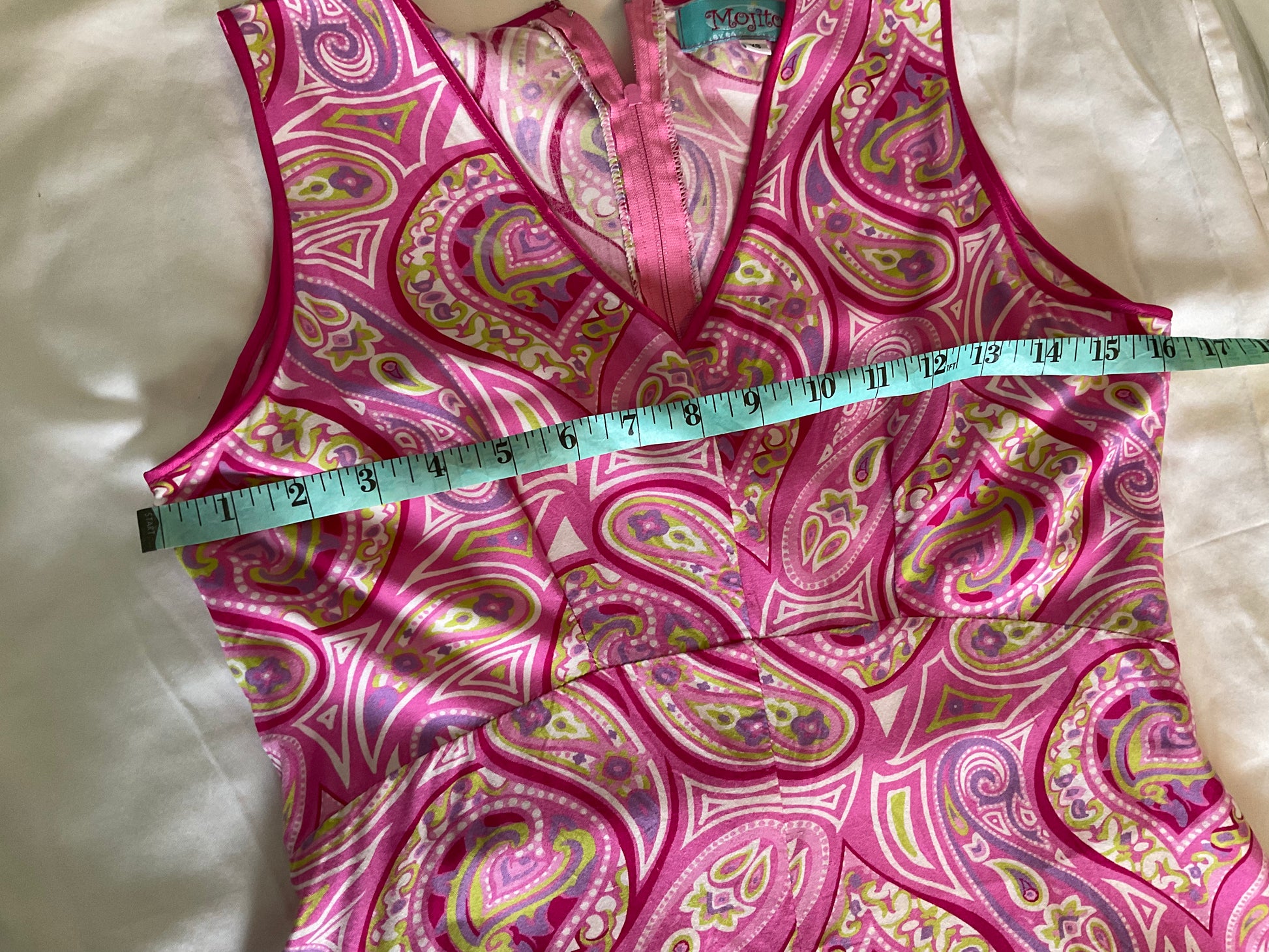 Mojito sleeveless dress with v neckline. This beautiful paisley print is in different shades of pinks, and greens and a cream color. Notice the pink ribbon detailing at the bottom and around the neckline and arms. Also is has a back zipper.