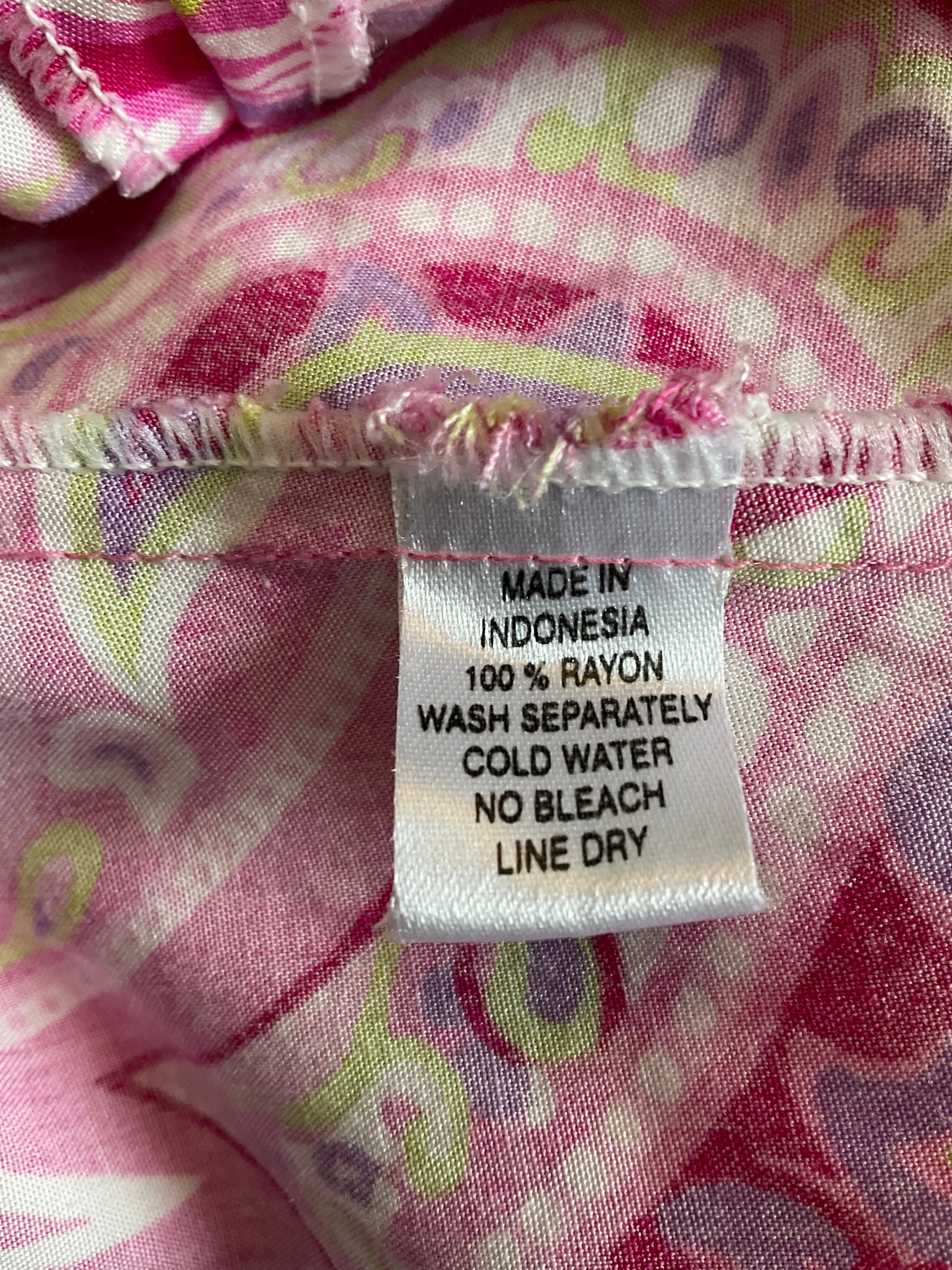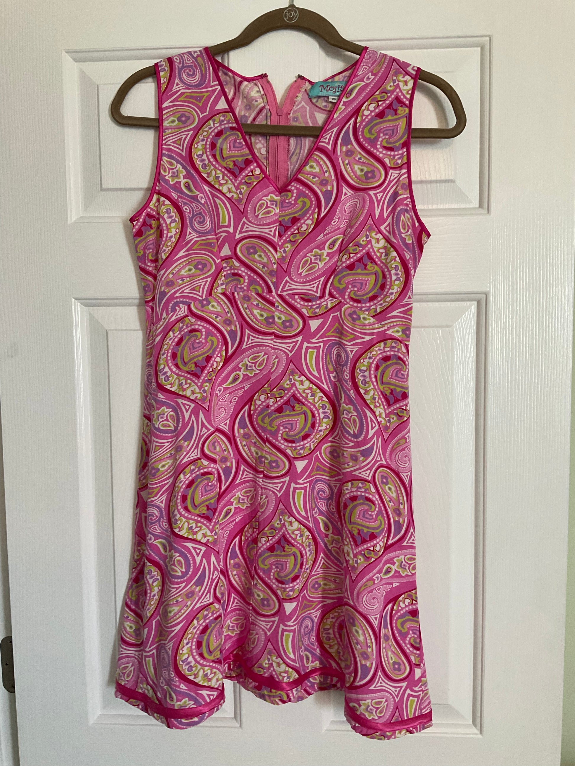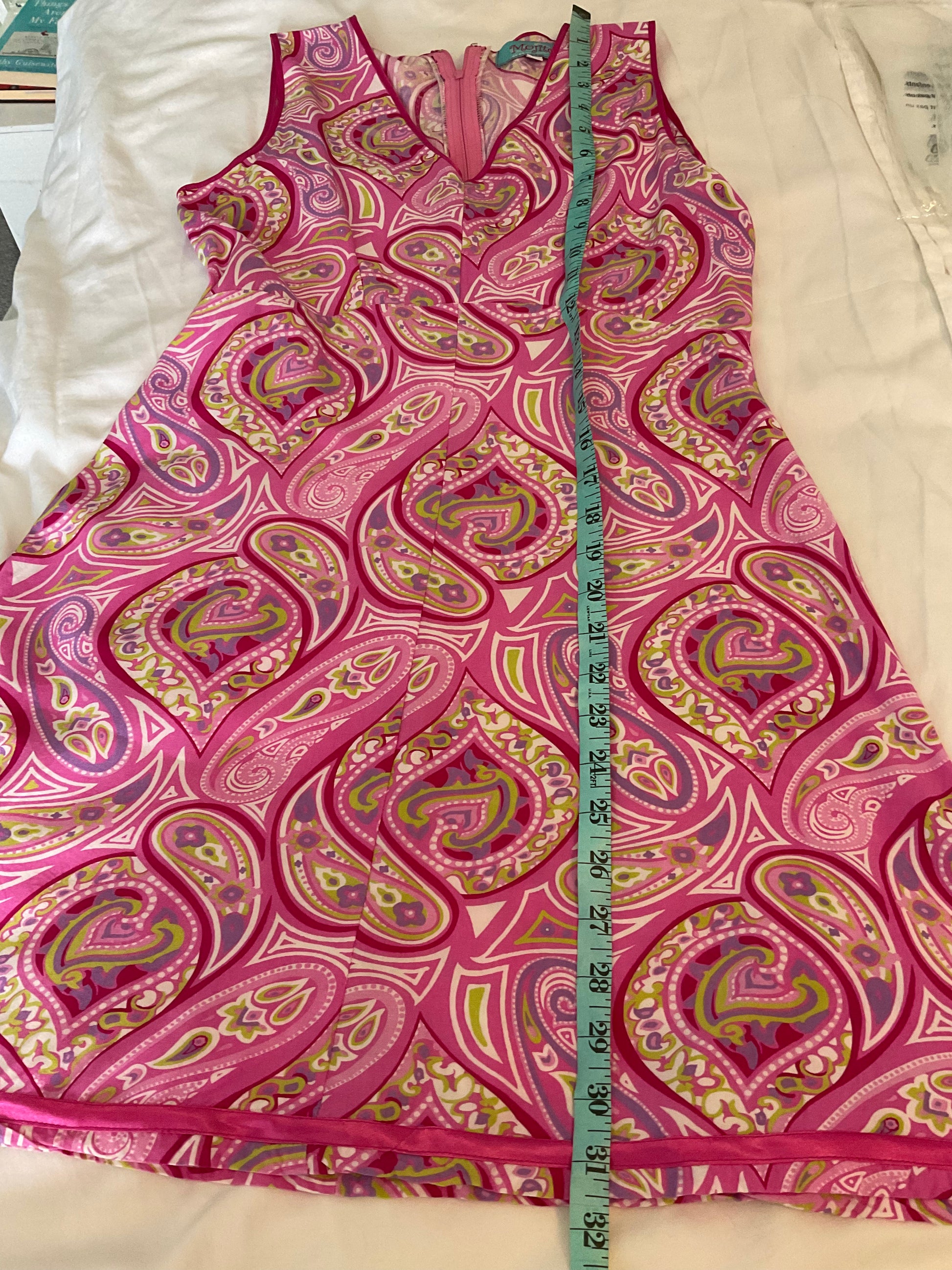 Mojito sleeveless dress with v neckline. This beautiful paisley print is in different shades of pinks, and greens and a cream color. Notice the pink ribbon detailing at the bottom and around the neckline and arms. Also is has a back zipper.