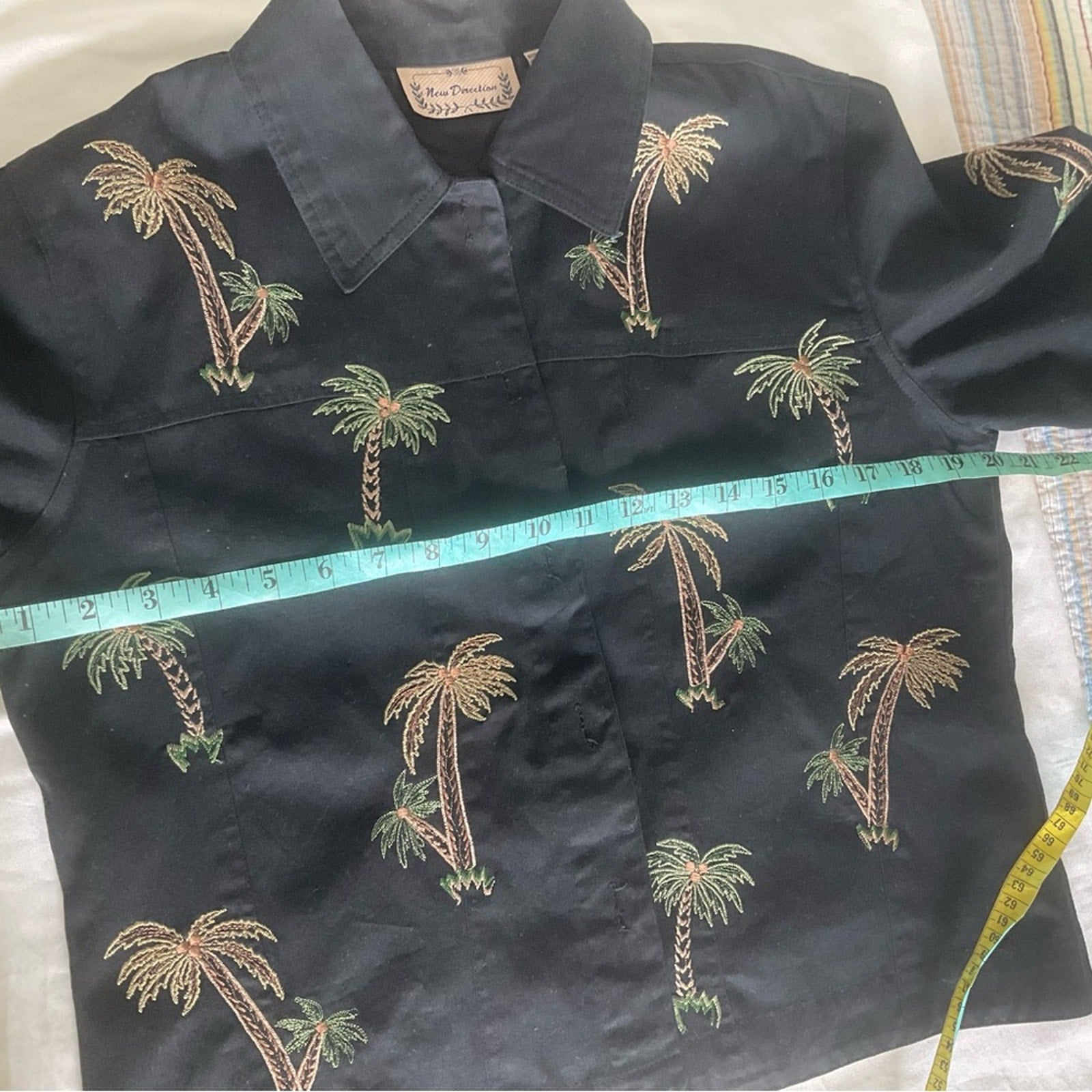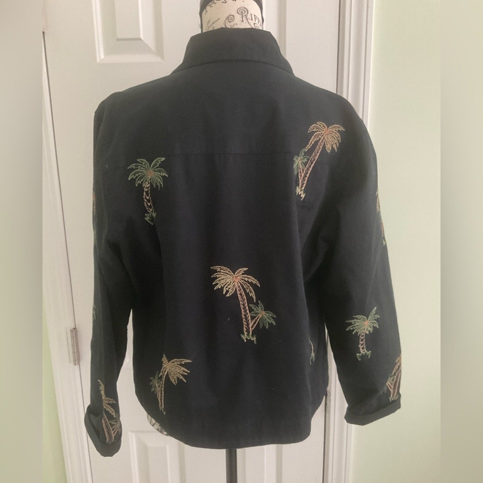 New Direction black jean jacket with palm tree embroidery. Ideal for a casual, tropical vibe. This jacket is black with green and brown palm trees. Has a button up front.