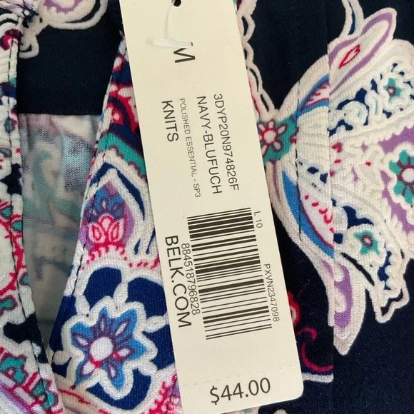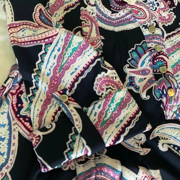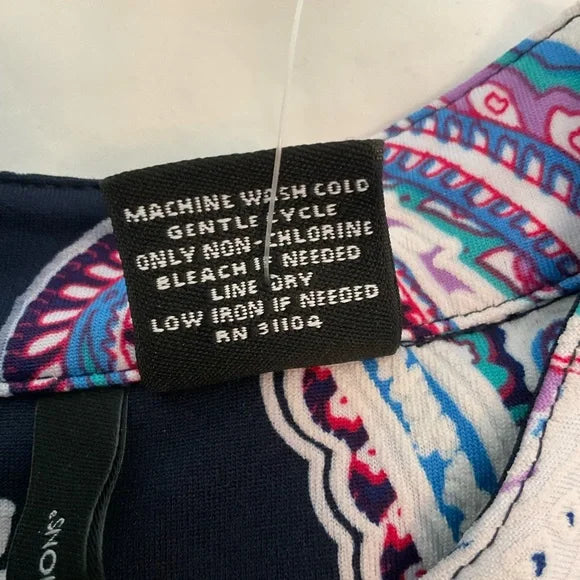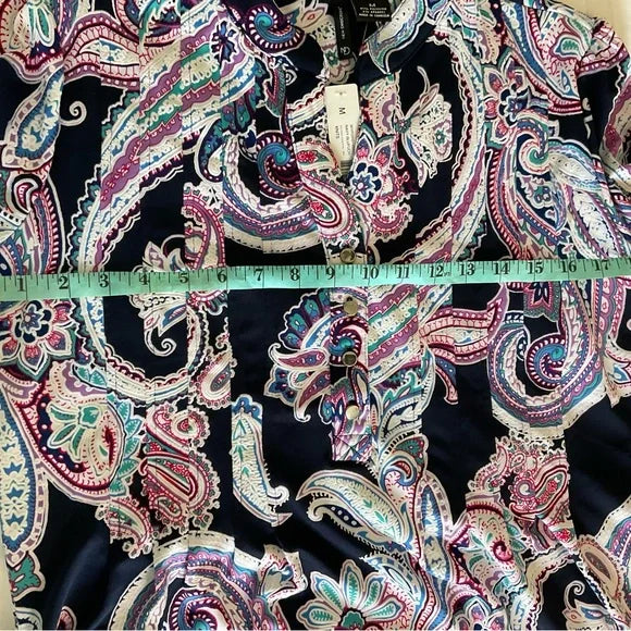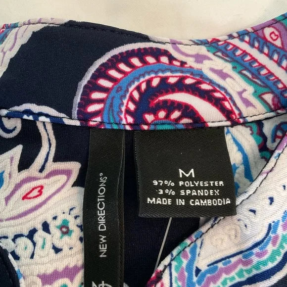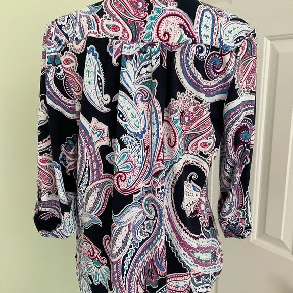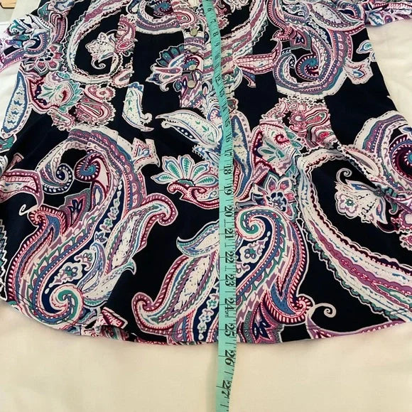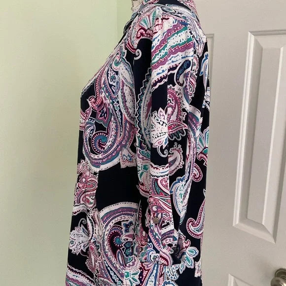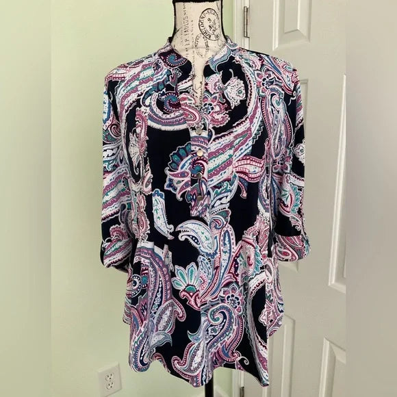 New Directions Tunic with 3/4 sleeves that have a roll look. The neckline has 4 silver button closure placket. This top is beautiful with the paisley colors of navy blue, pinks, fuschia, whites, and greens.
