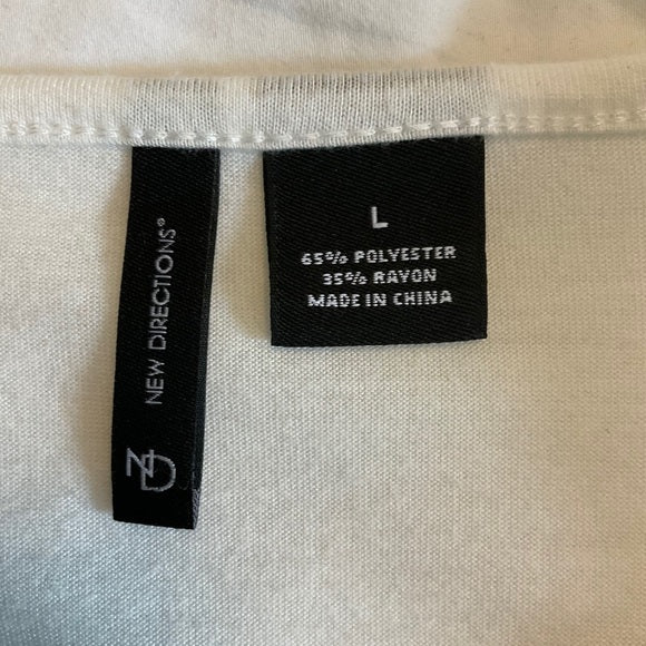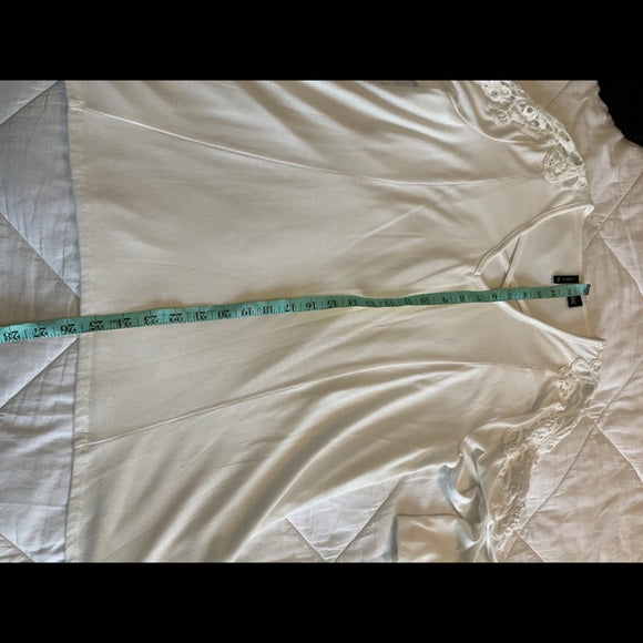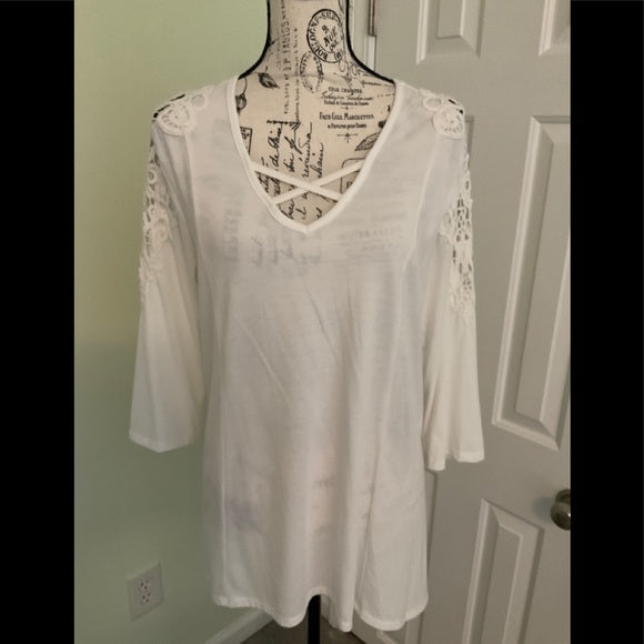 New Directions creamy white tunic top with 3/4 sleeves which has lace insets on the sleeves. V-Neck with seams on the front.