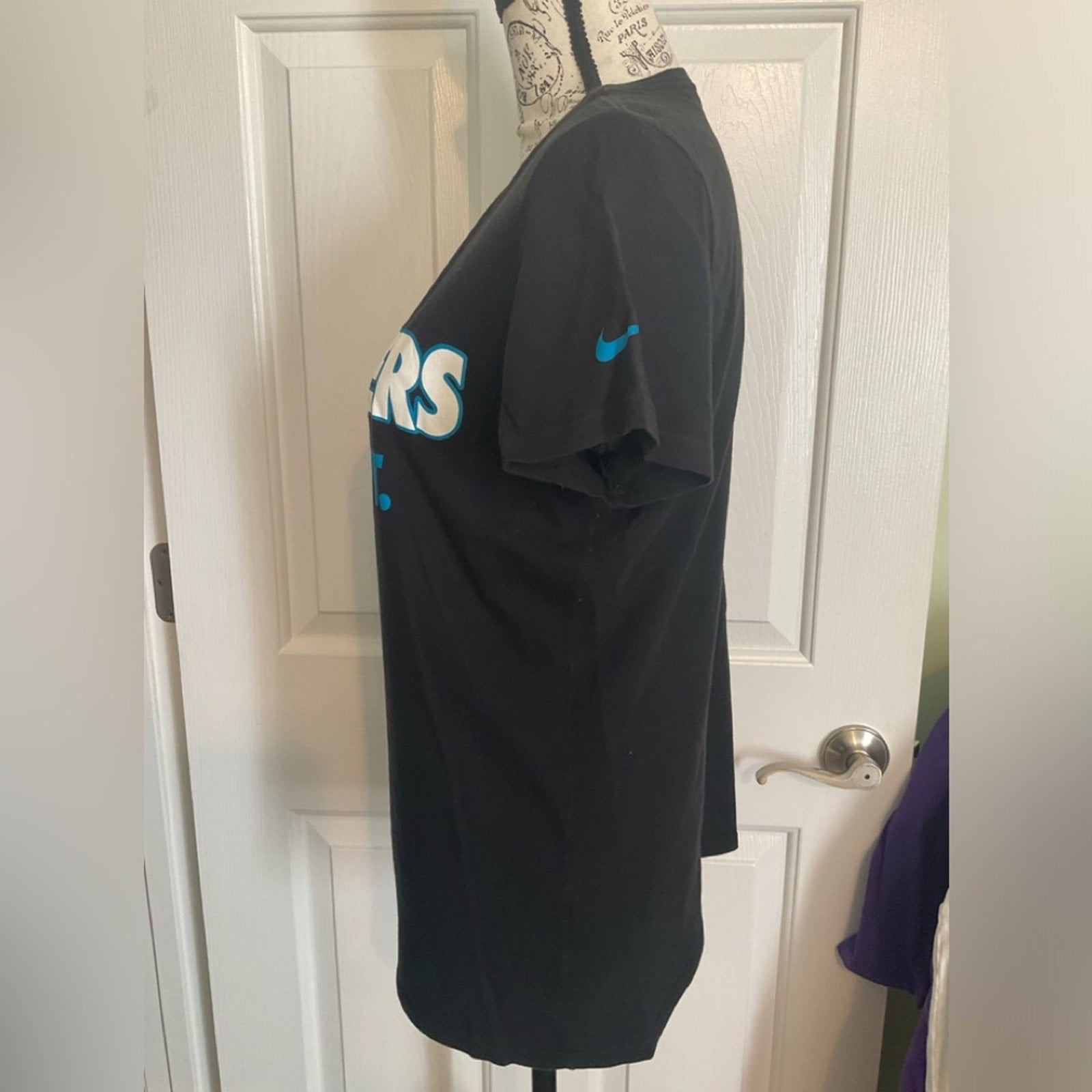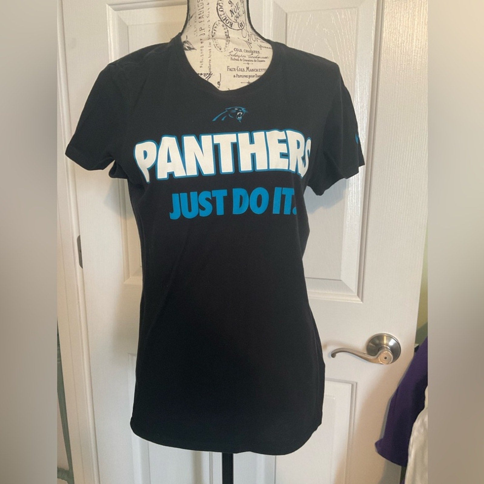 NFL Team Apparel short sleeve Black T-shirt with “PANTHERS” in white and “just do it” in Carolina blue and also has a picture of a panther above the Panther word.