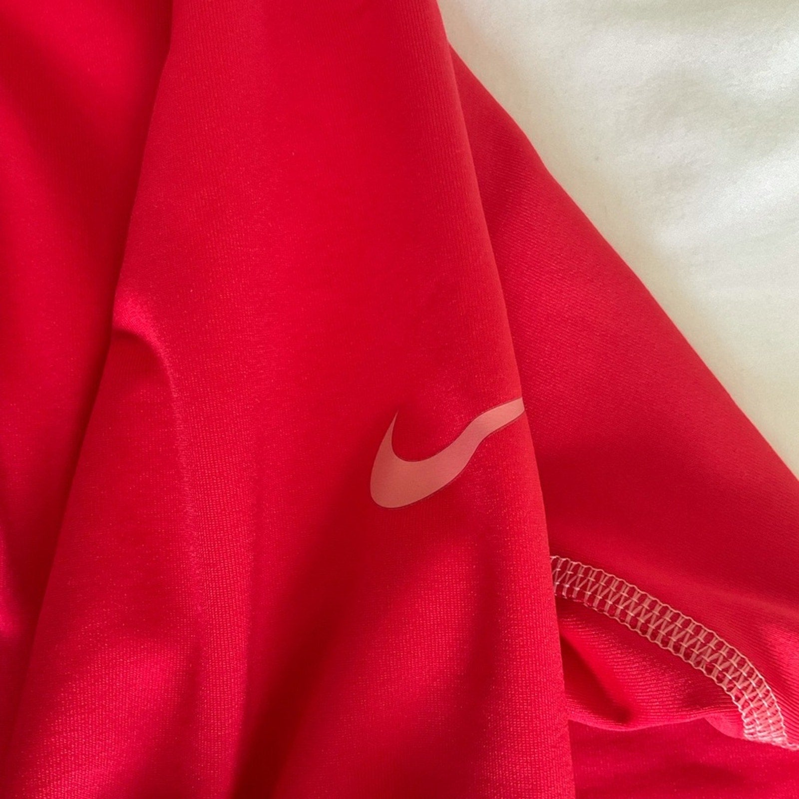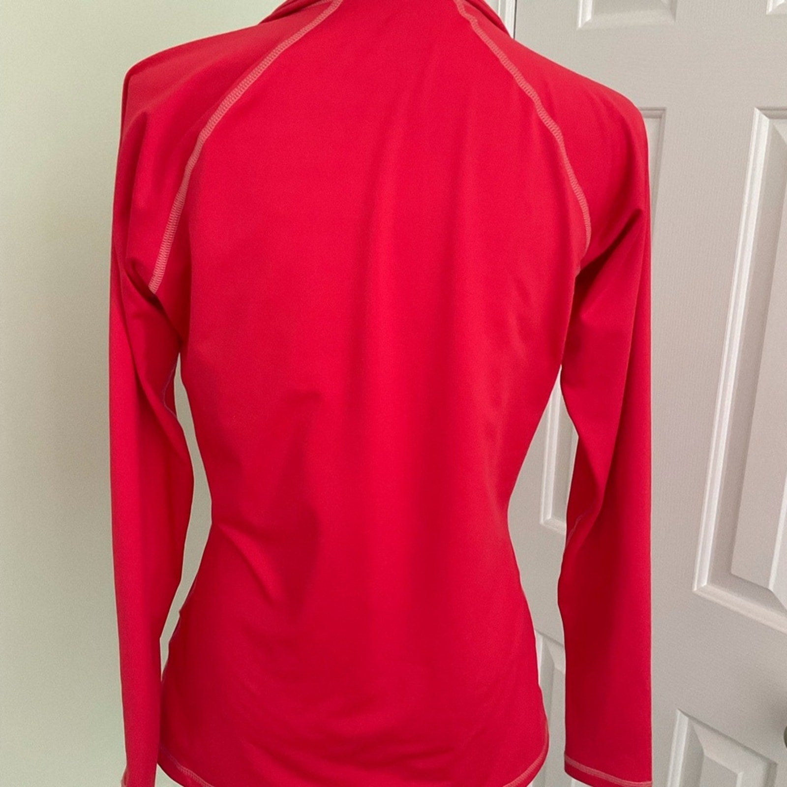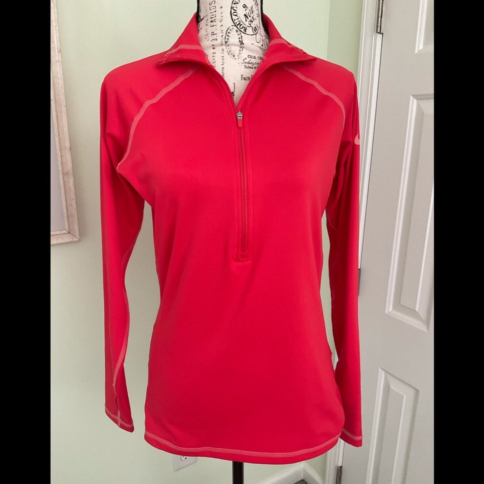 Nike Pro athletic 1/2 zip pull on jacket with long sleeves and thumb hole. This is a beautiful coral/red color. This has never been worn. It is a large, but it is a slim fit, so please see measurements.
