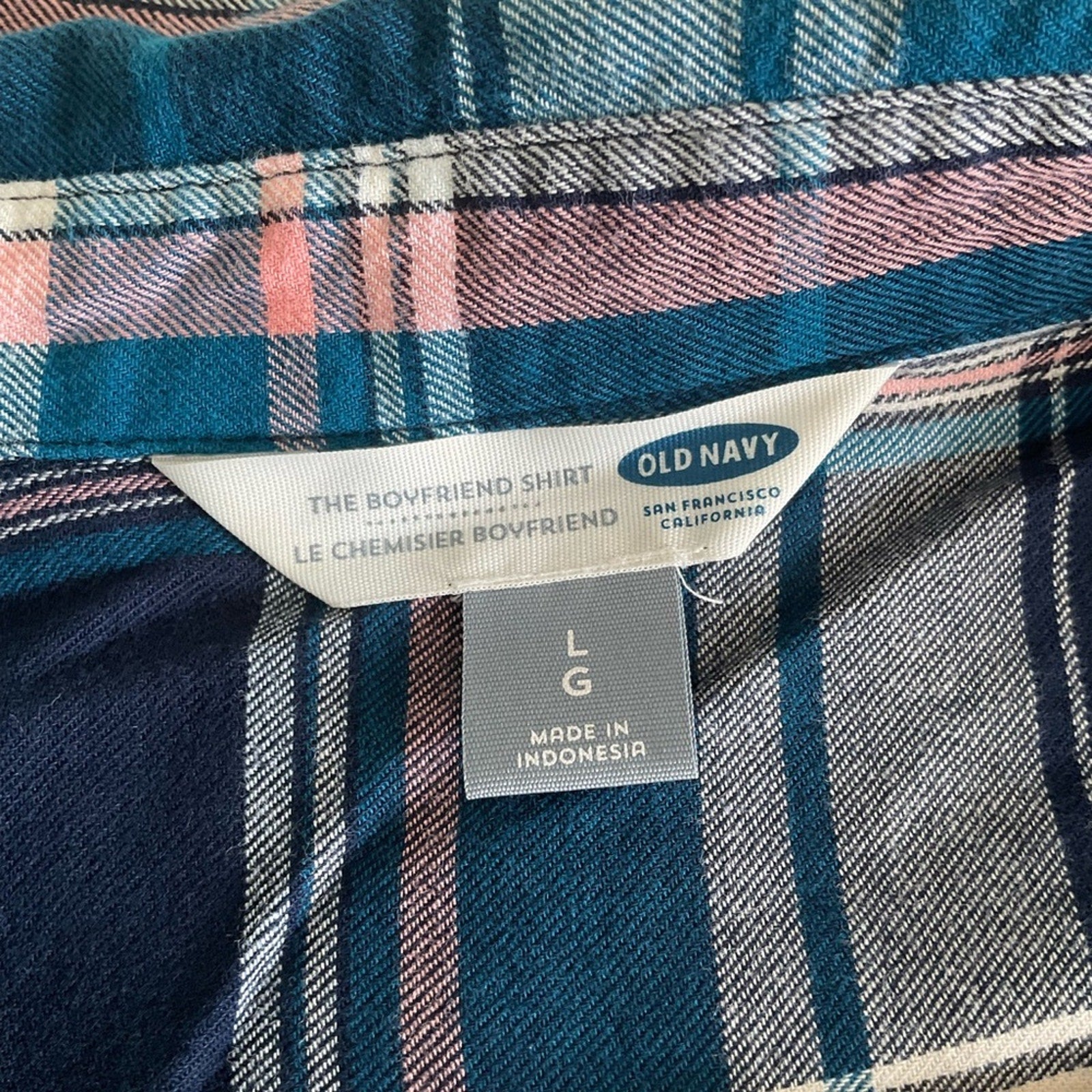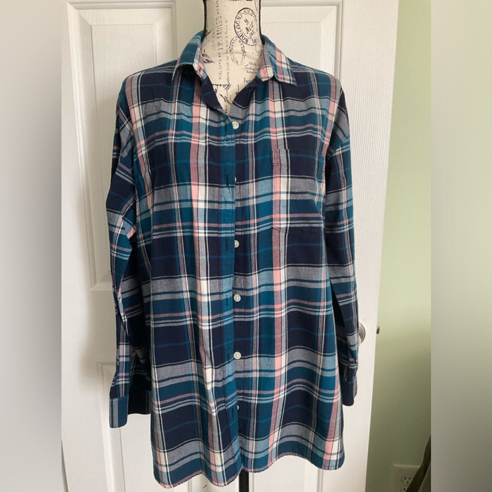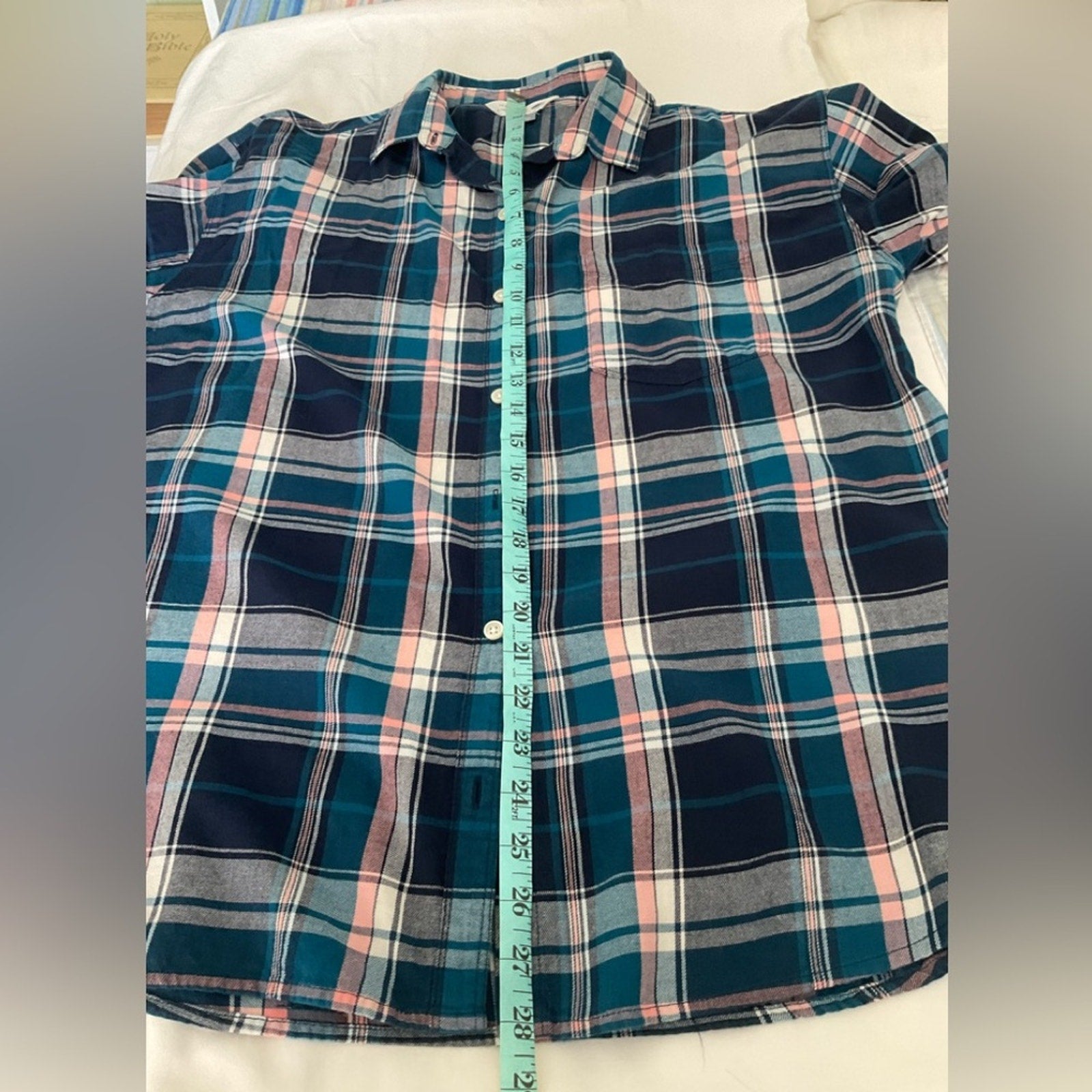 Old Navy The Boyfriend long sleeve button down shirt. This is a plaid in blues, white, green and pink colors. Has a left breast pocket.