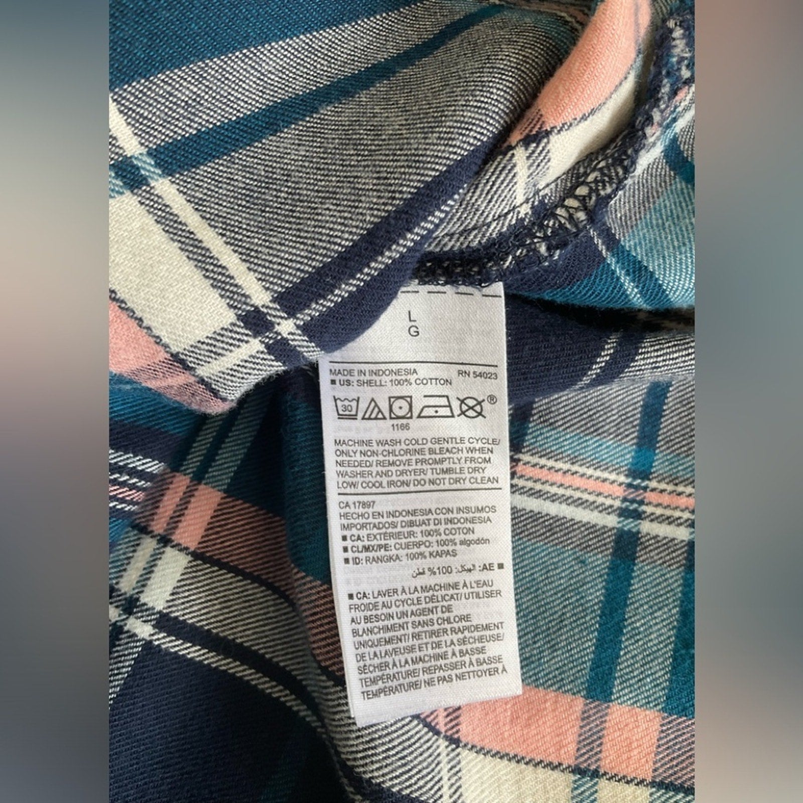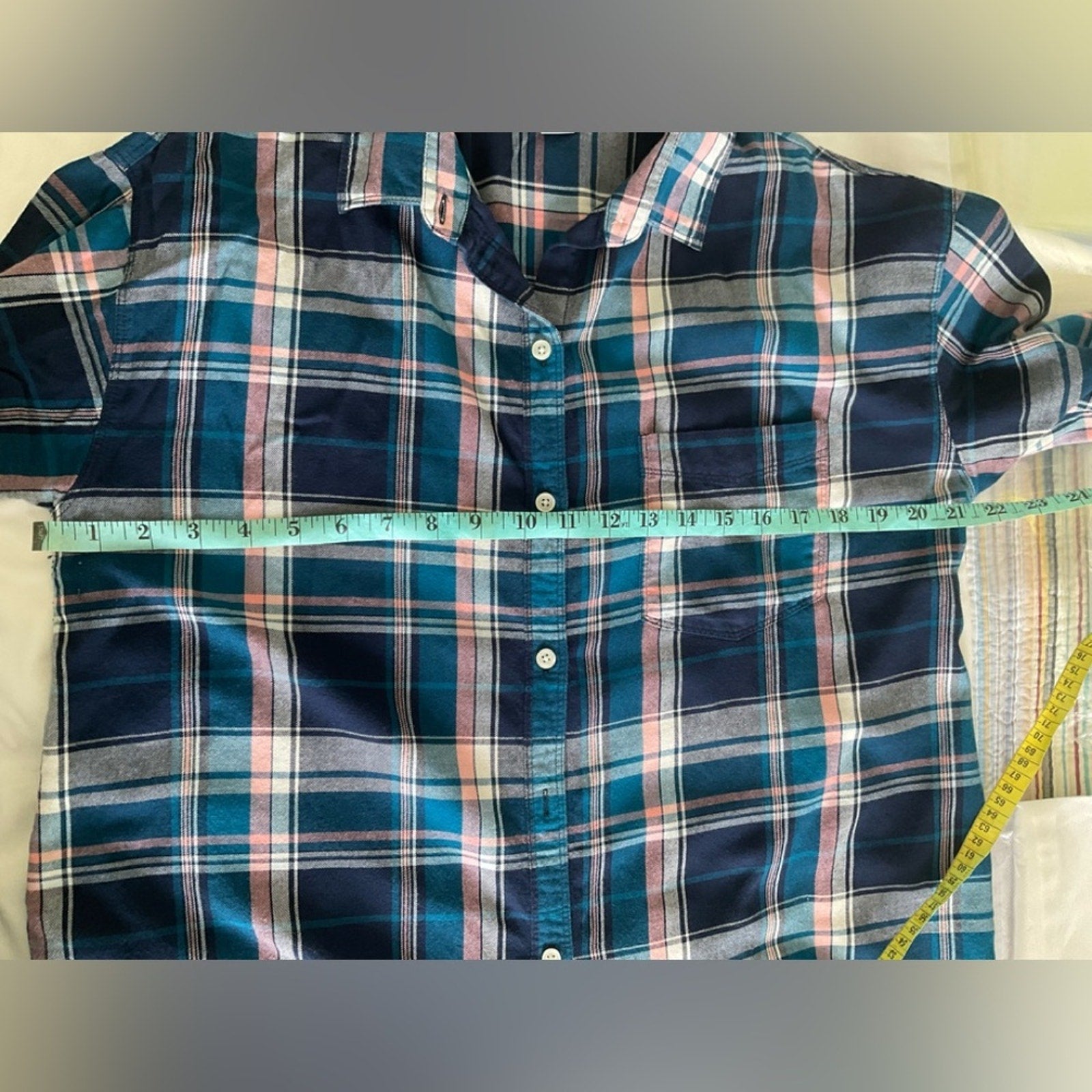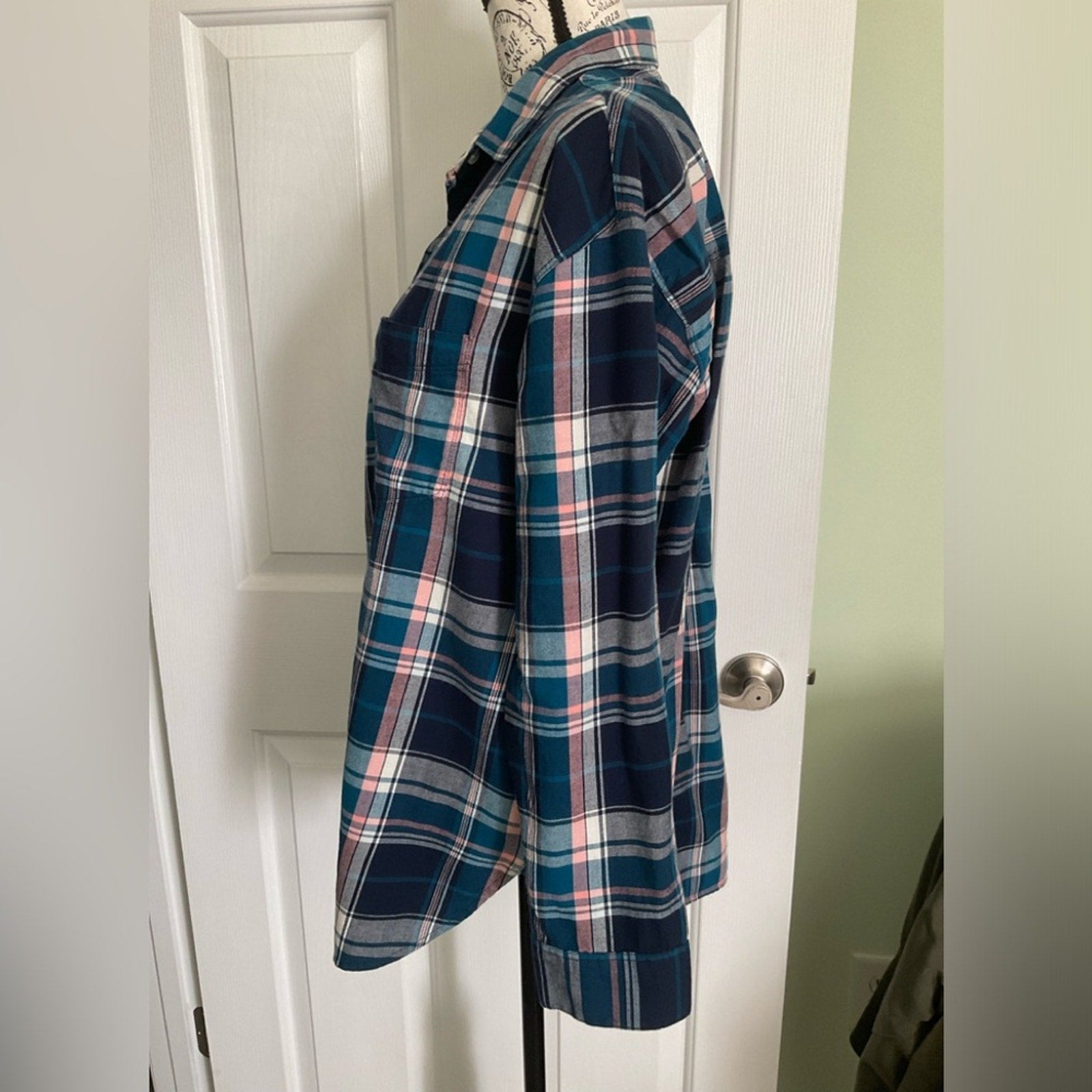 Old Navy The Boyfriend long sleeve button down shirt. This is a plaid in blues, white, green and pink colors. Has a left breast pocket.