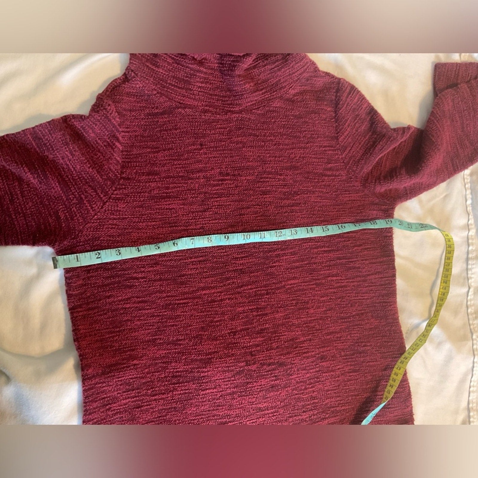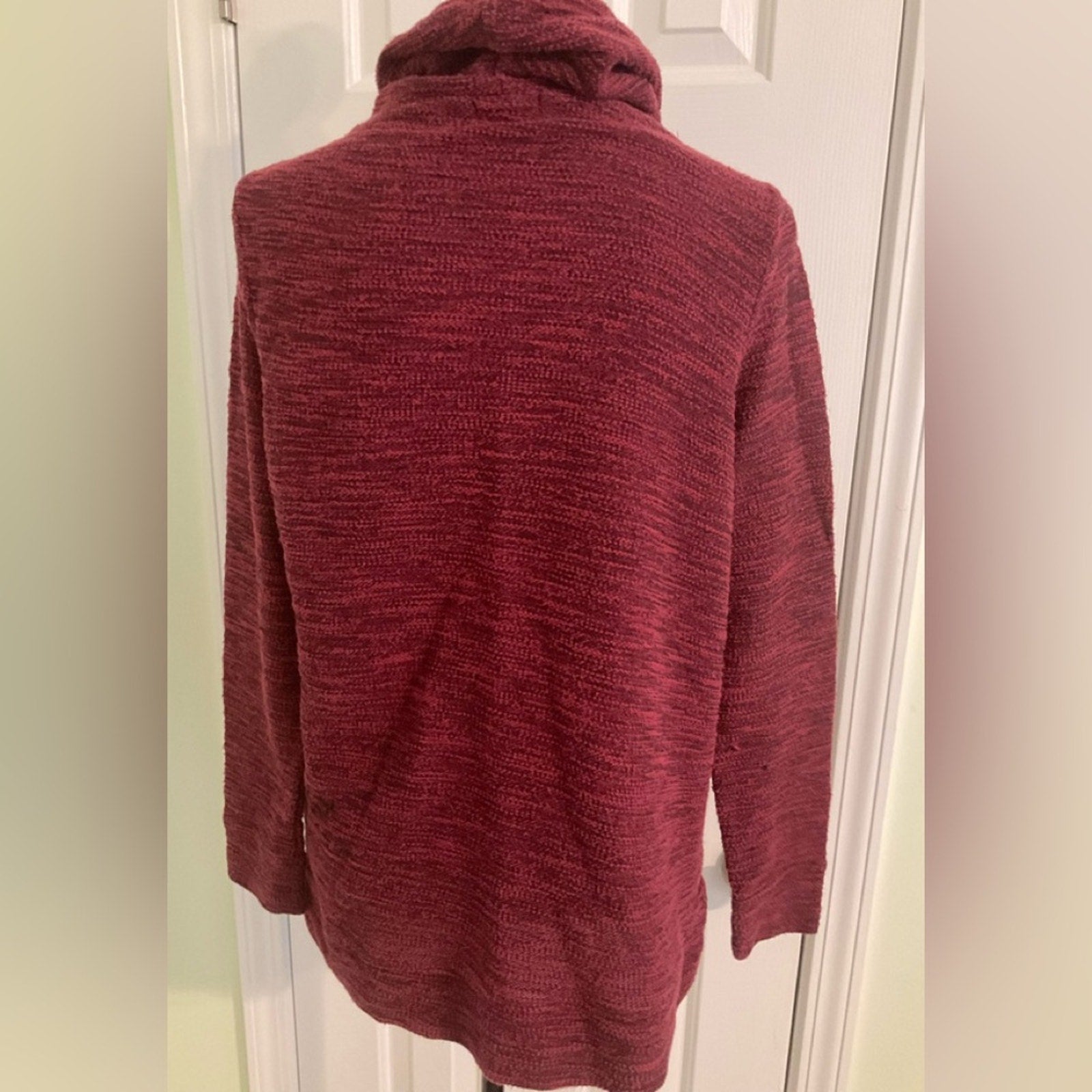 Old Navy pullover turtleneck with tie neckline and long sleeves. This is a burgundy and black tweed look. Please look at close up pick this is not pics it’s the way the fabric is made with some darker color in areas.