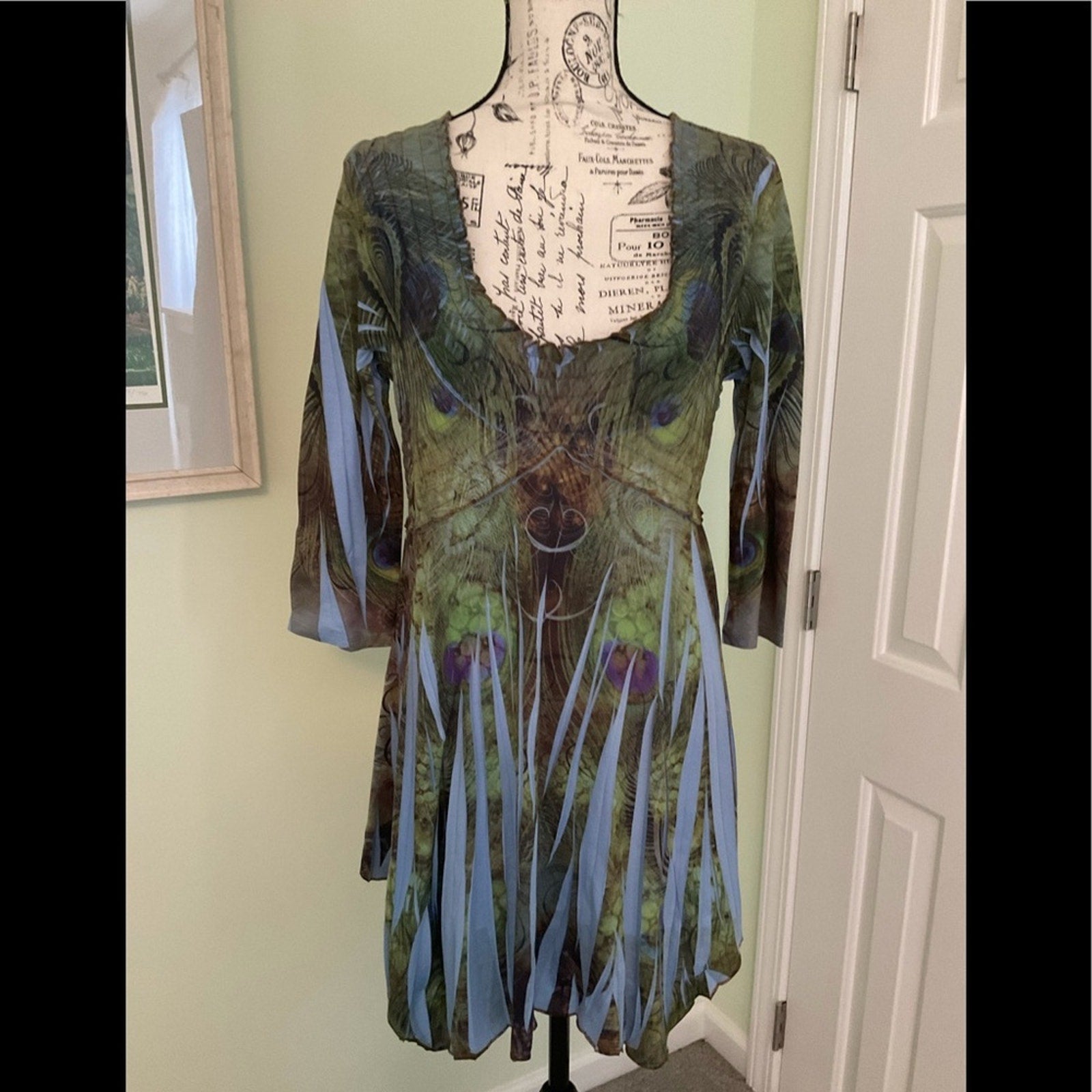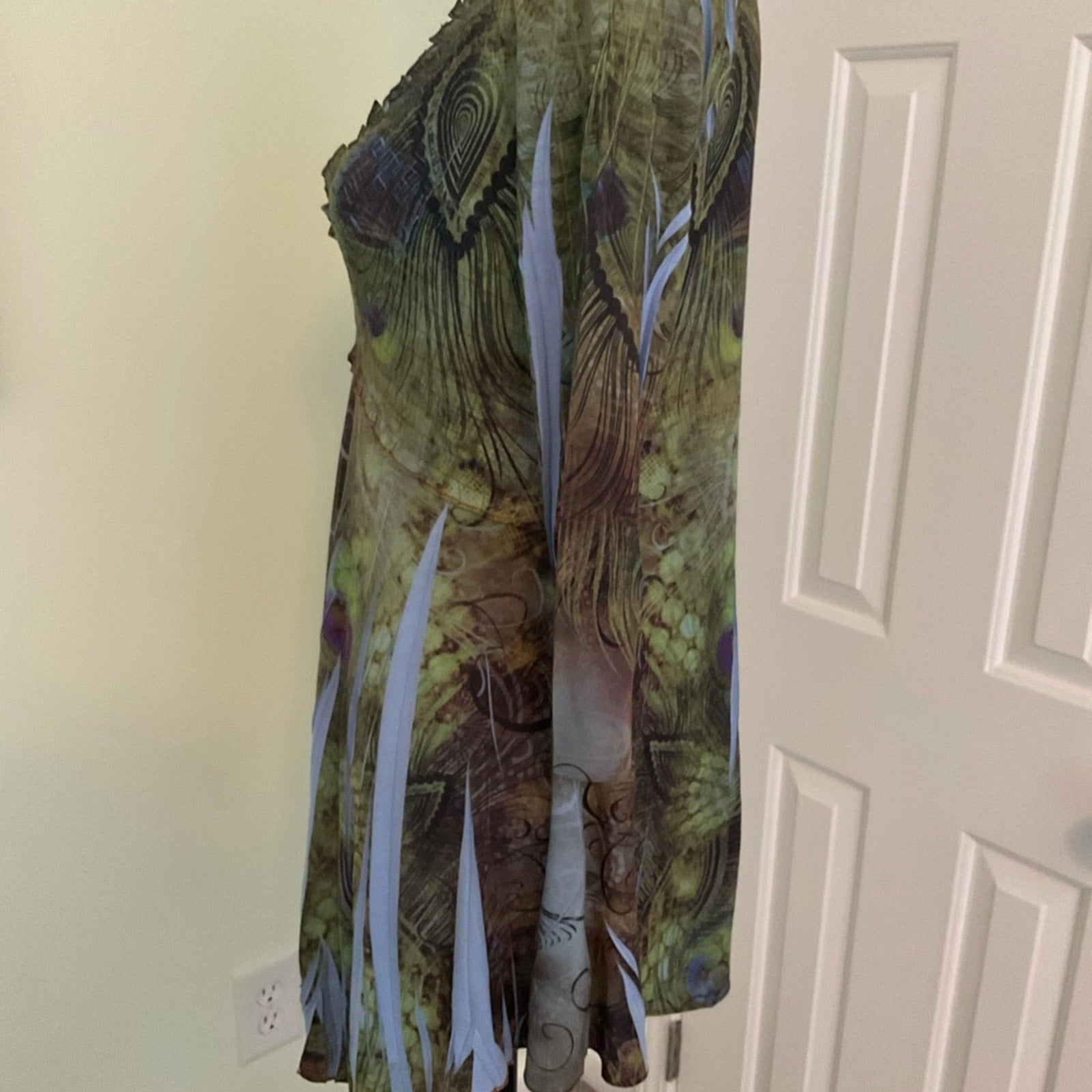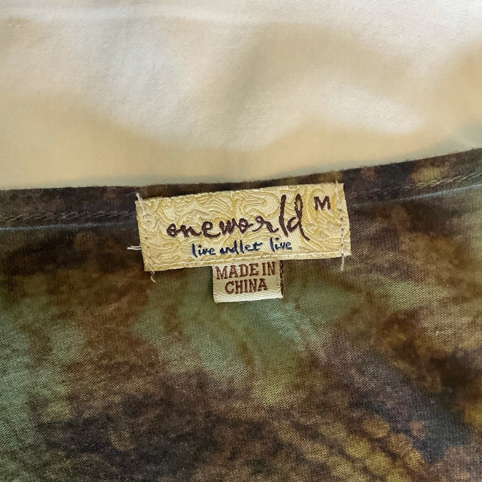 One world tunic top in beautiful colors of blues, greens a s browns. This reminds of of the colors in a peacock. Scoop neck, and front is a little longer than back.
