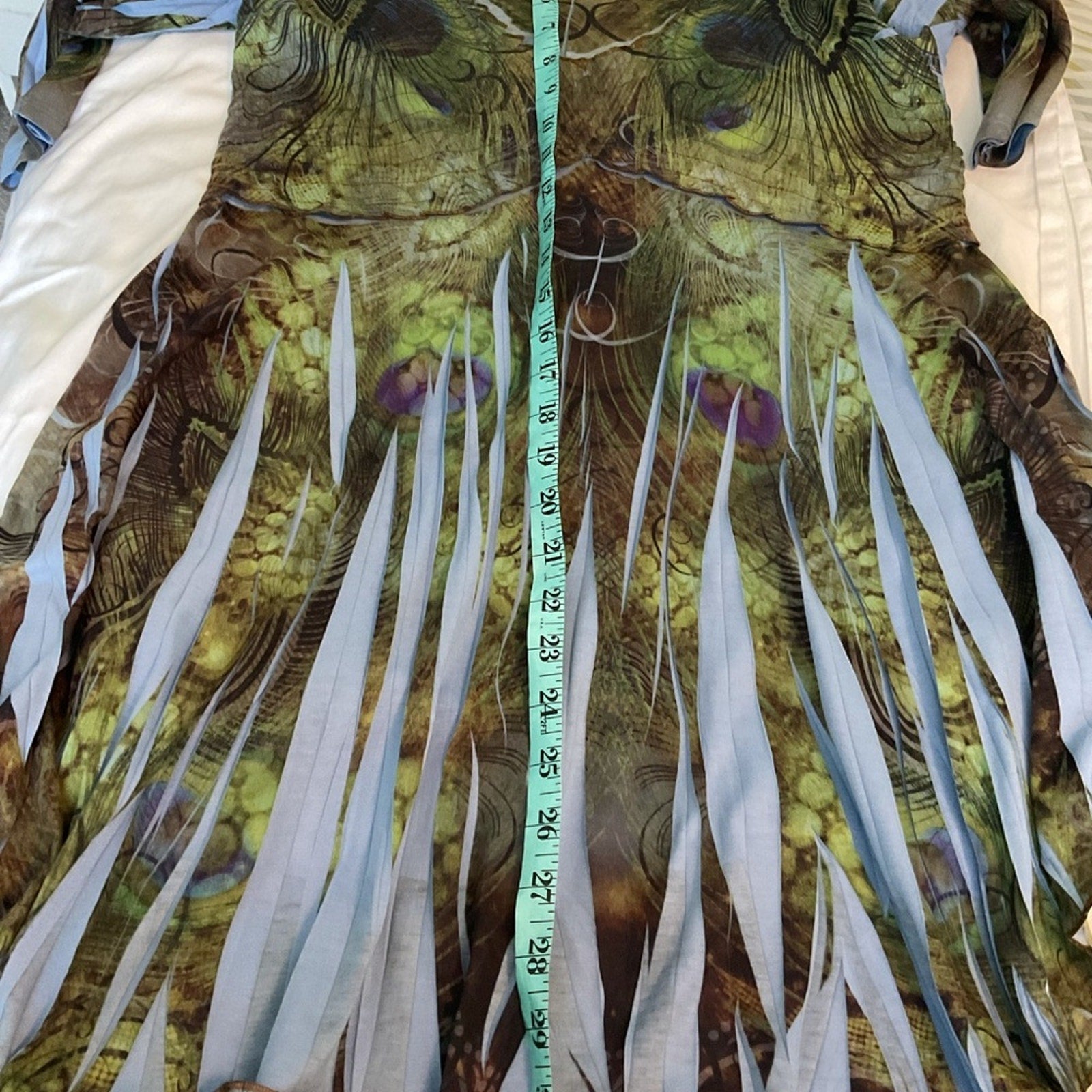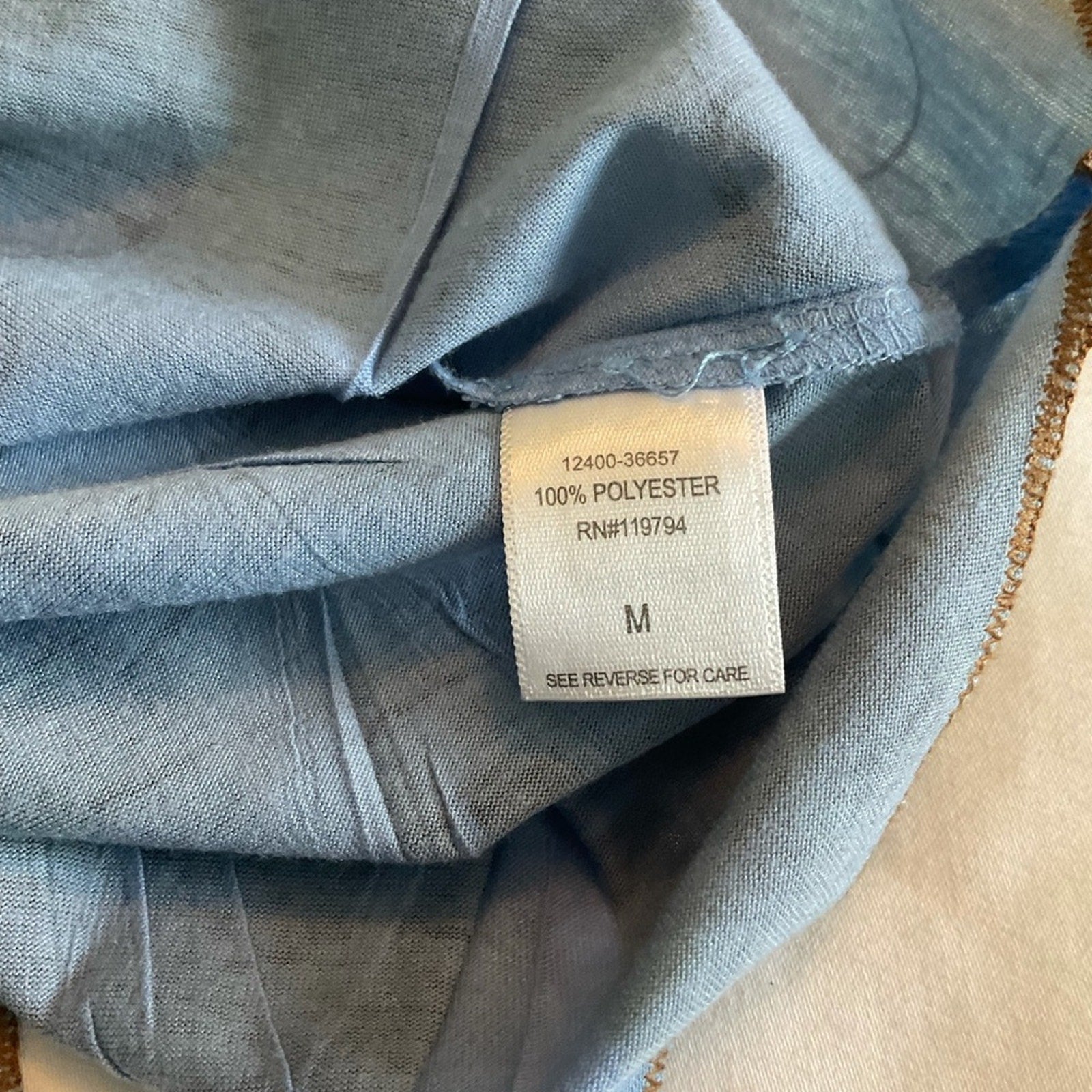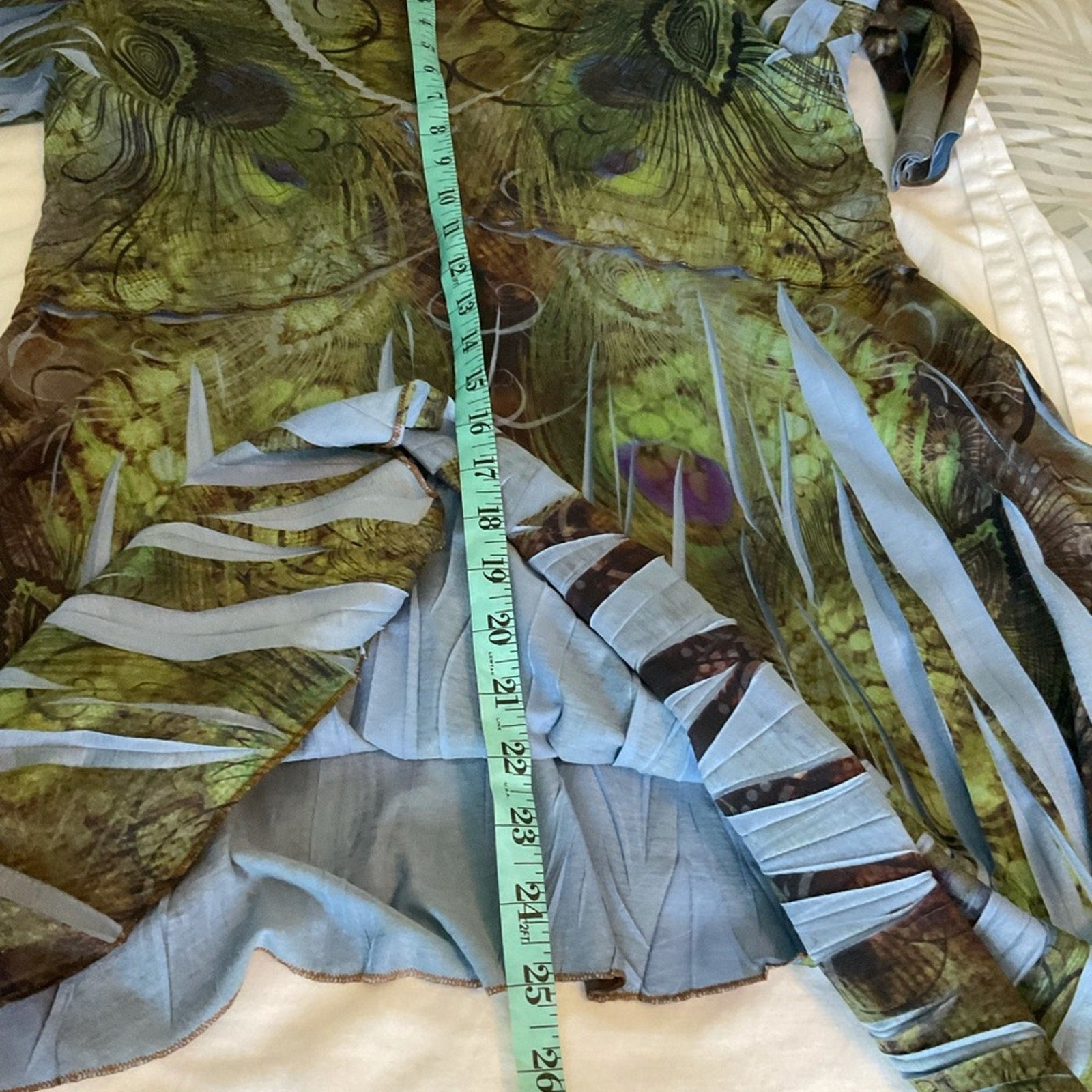 One world tunic top in beautiful colors of blues, greens a s browns. This reminds of of the colors in a peacock. Scoop neck, and front is a little longer than back.