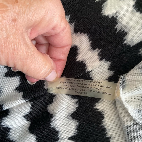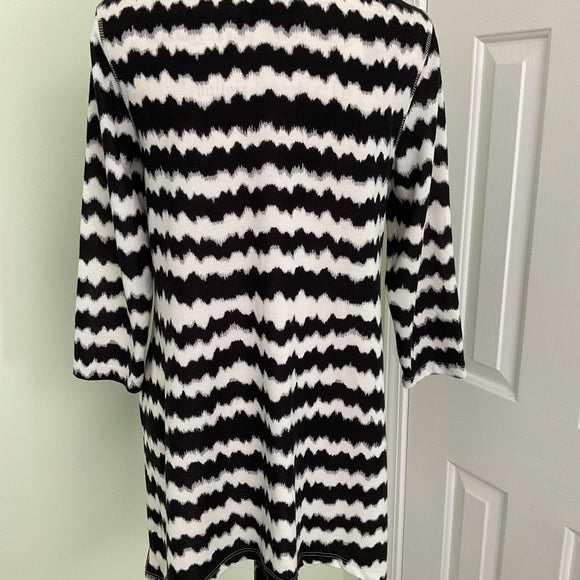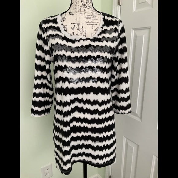 Onque Casuals black and white stripe tunic top with 3/4 sleeves. The front center section has sequins. Also a scoop neckline.