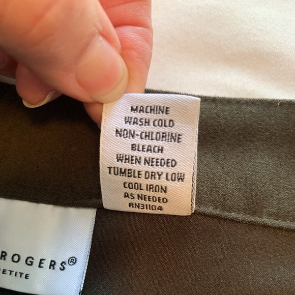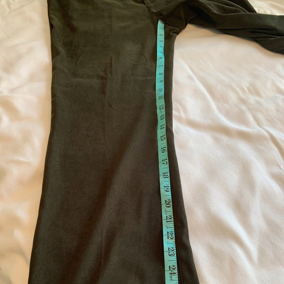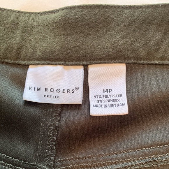 Kim Rogers pants in dark green that have a brushed suede feel. There are two pockets on the front and has jean detailing on the back with the seam and two back pockets.