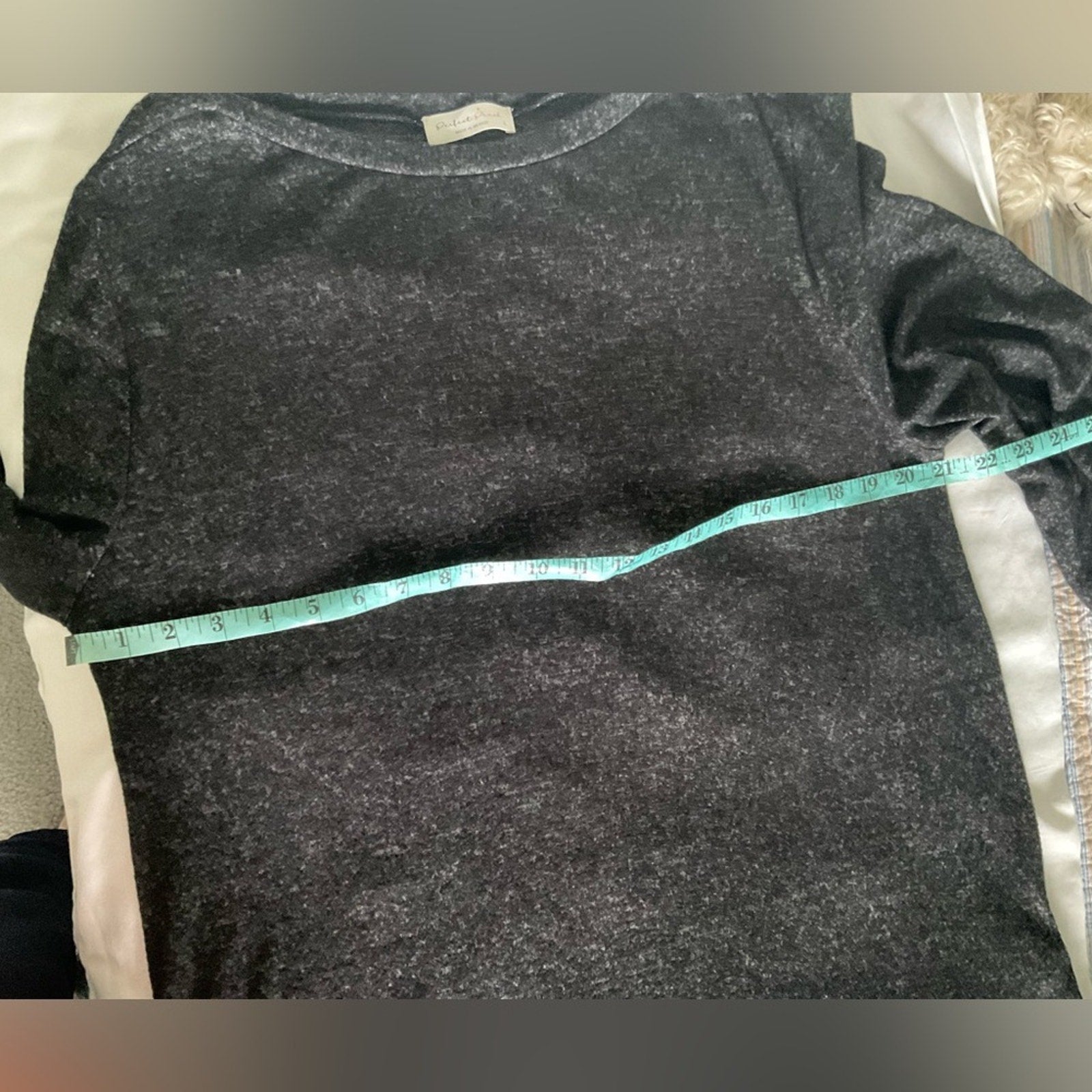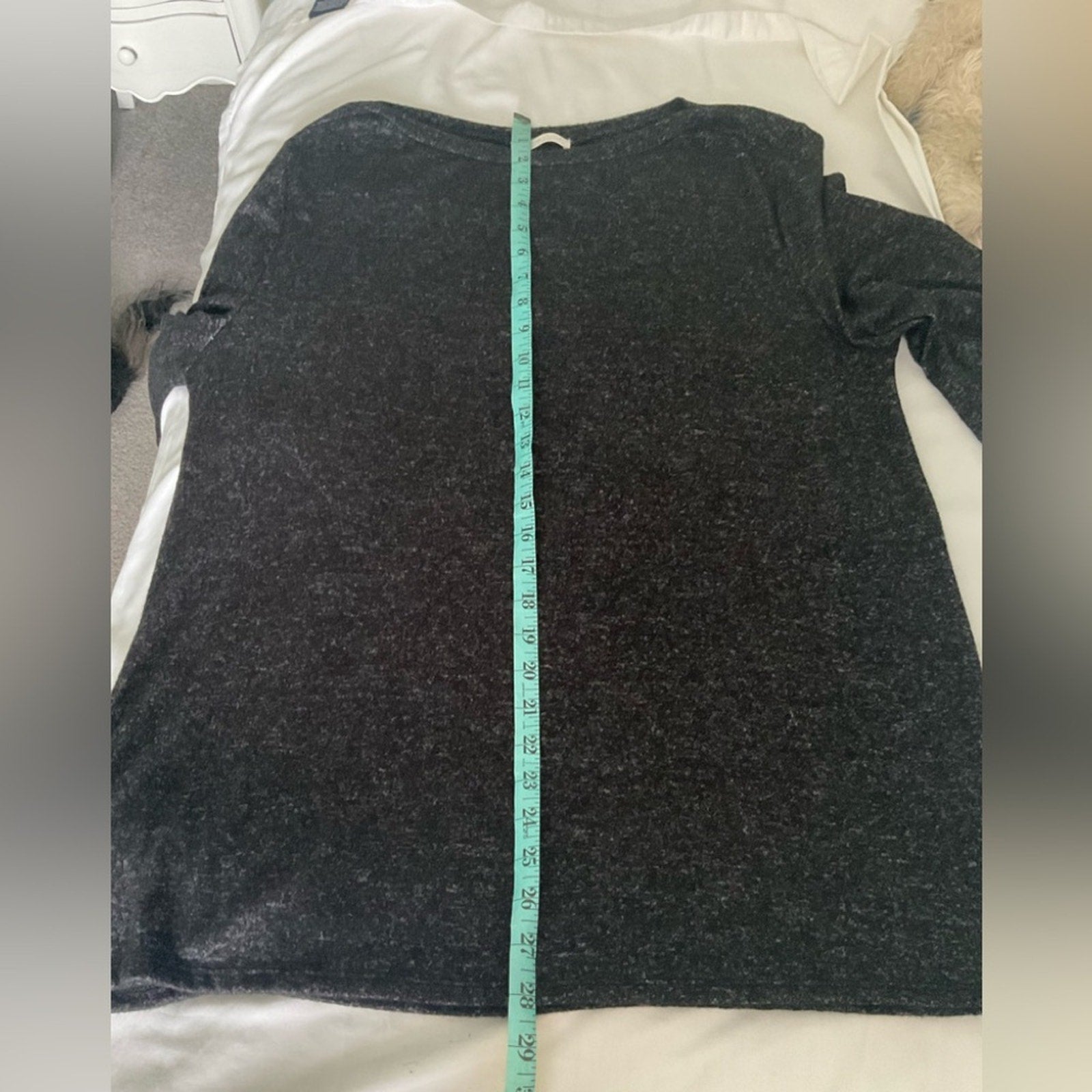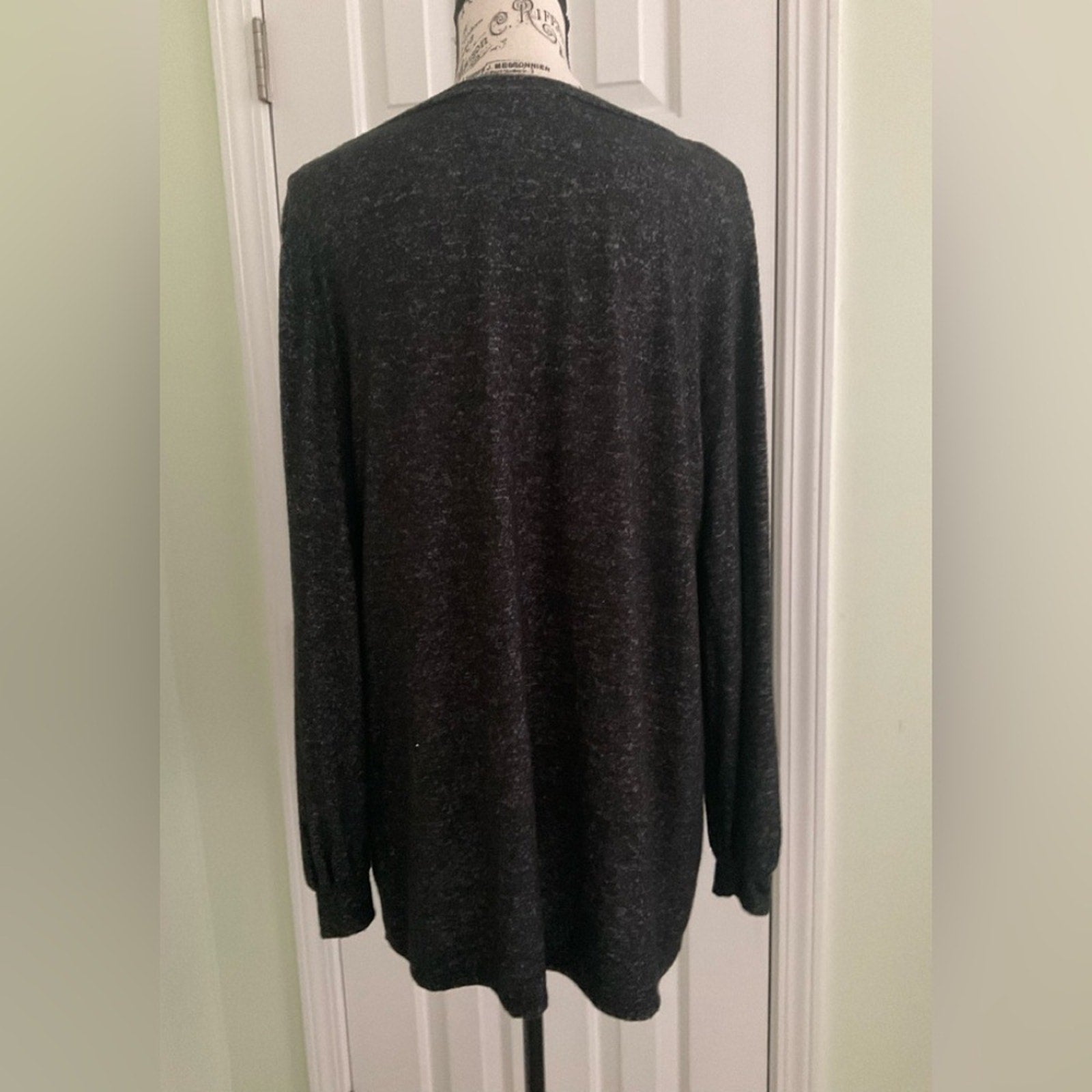 Perfect Peach - Elevate your wardrobe with this timeless black Hacci style sweater. Perfect for layering or wearing on its own. This is a black heather look with long sleeves and a slight boatneck style.