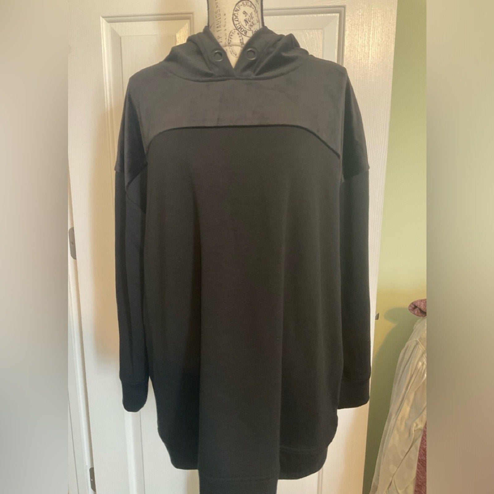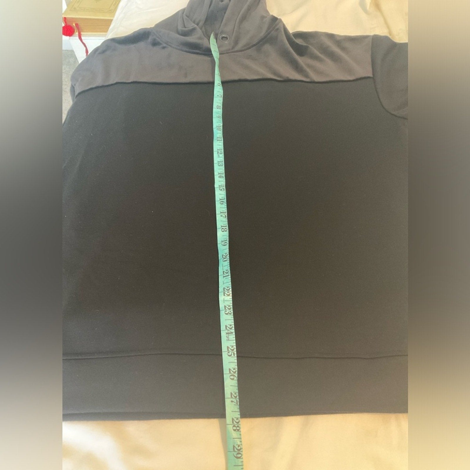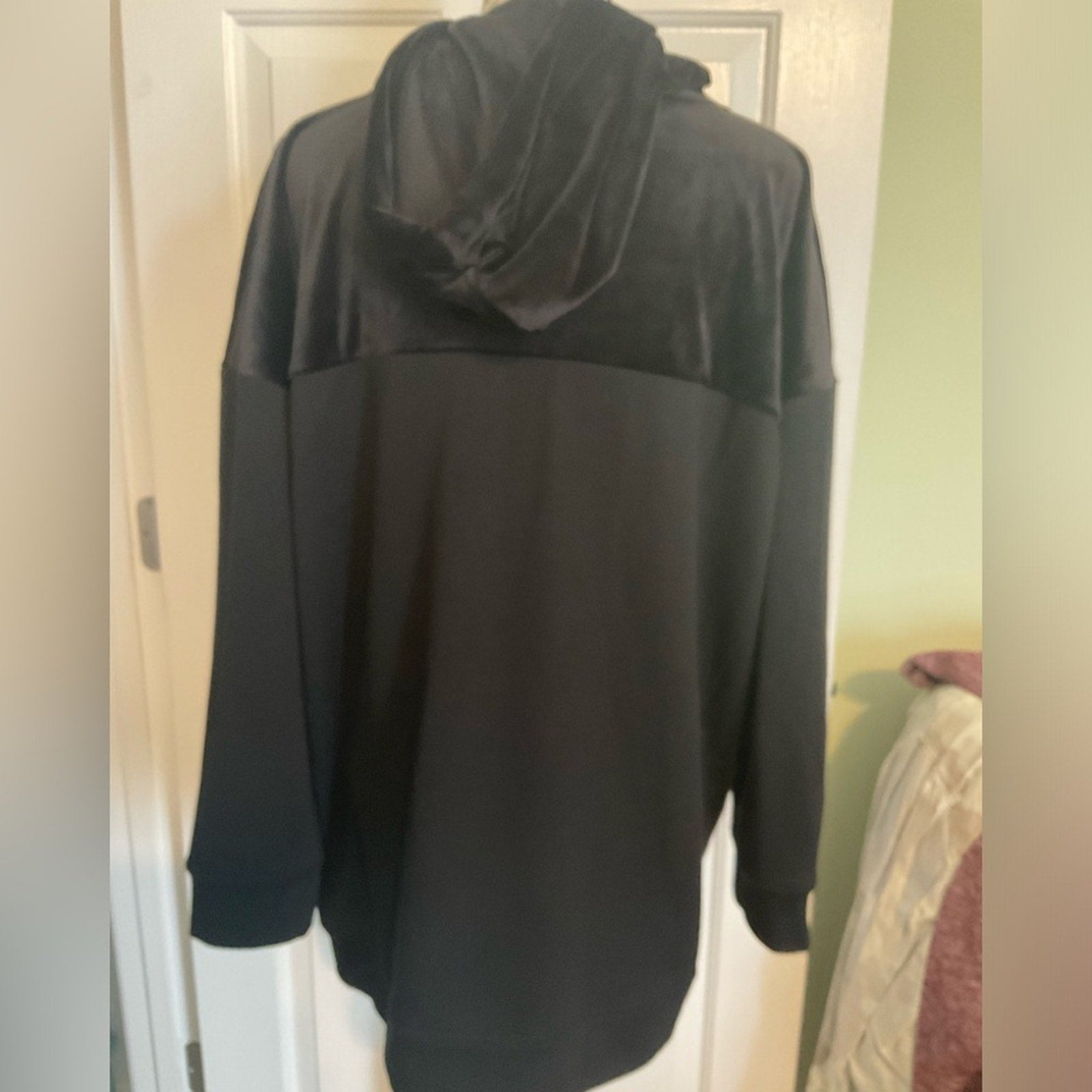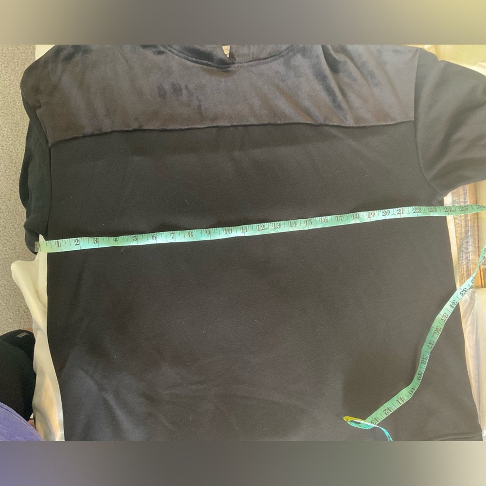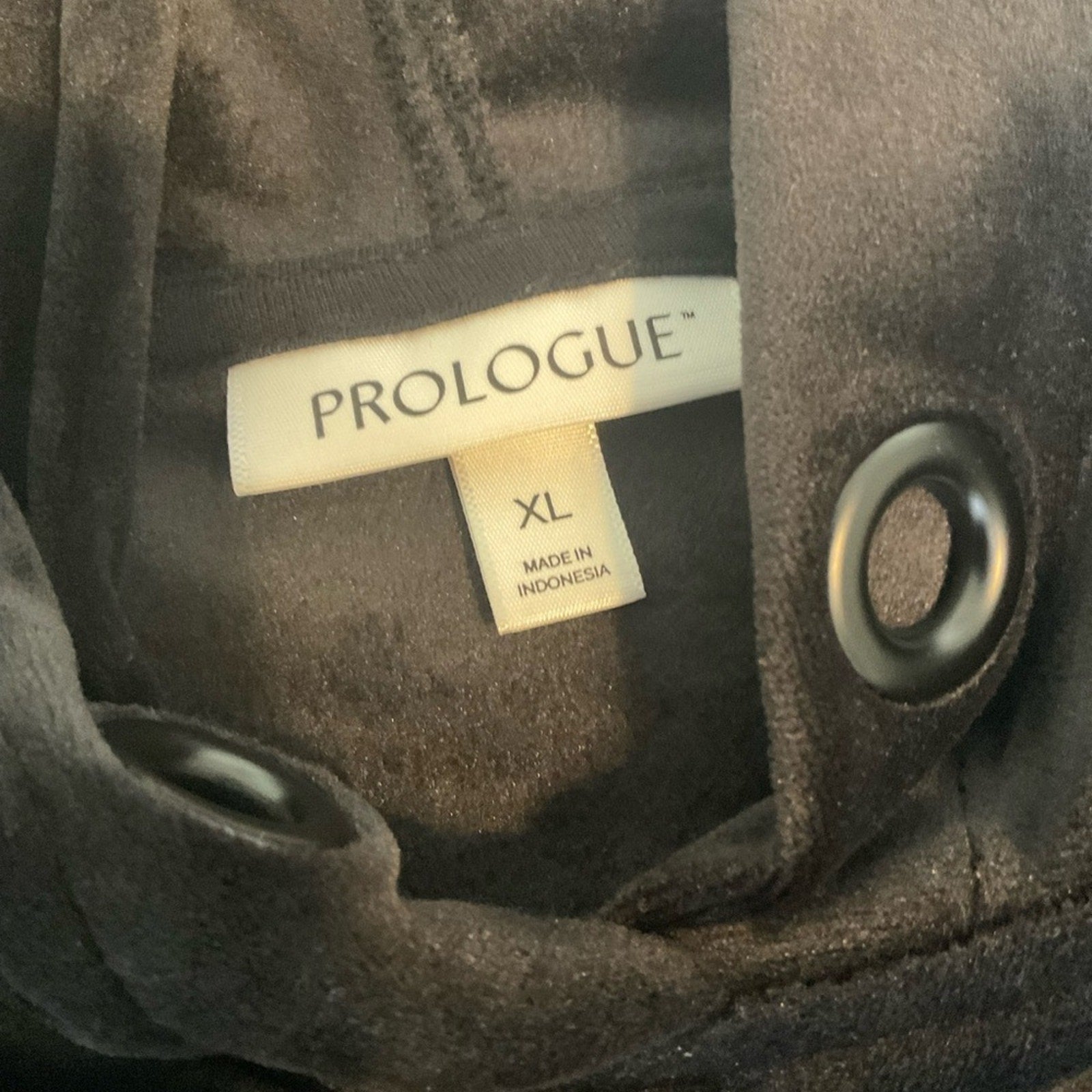 Prologue hooded long sleeve pullover sweatshirt in black. The top part and hood is a velvet. There is no tie in the hood.
