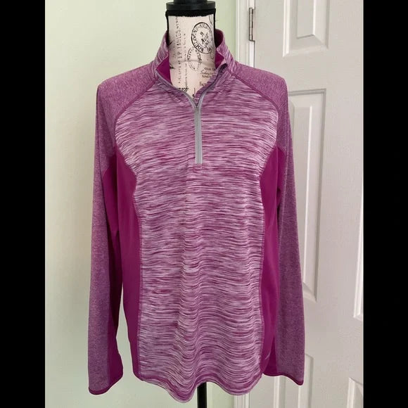 Avia athletic pullover with 1/4 zip and long sleeves. The sleeves also has the thumb hole loop. This is in a purple and white that is varied in prints.